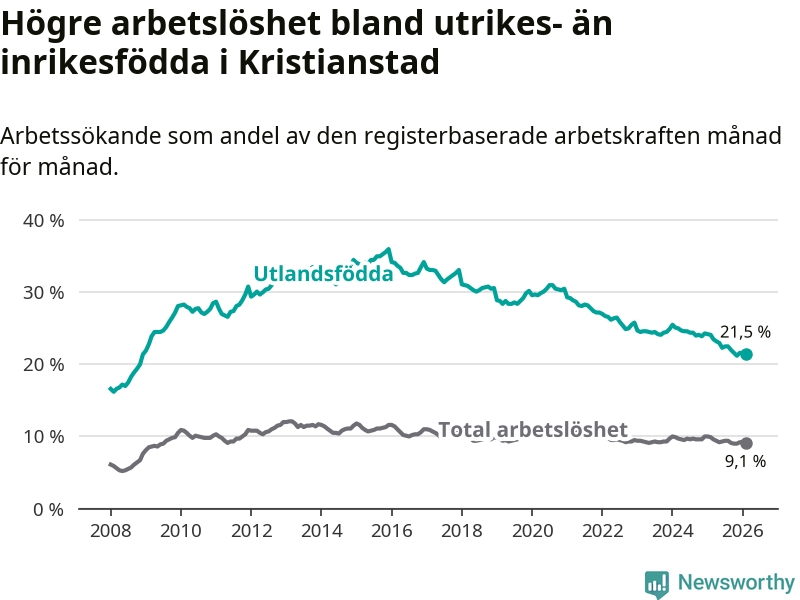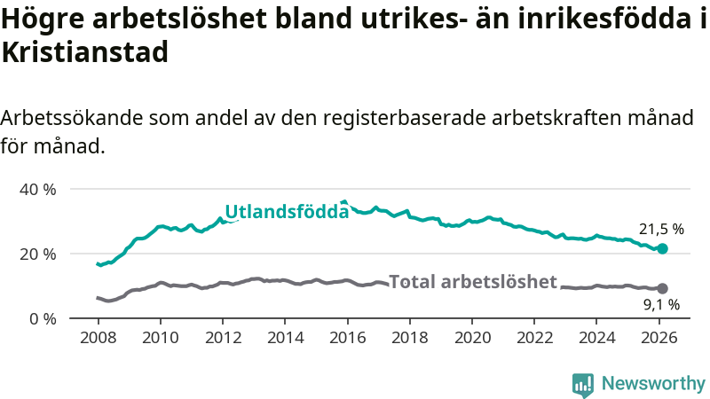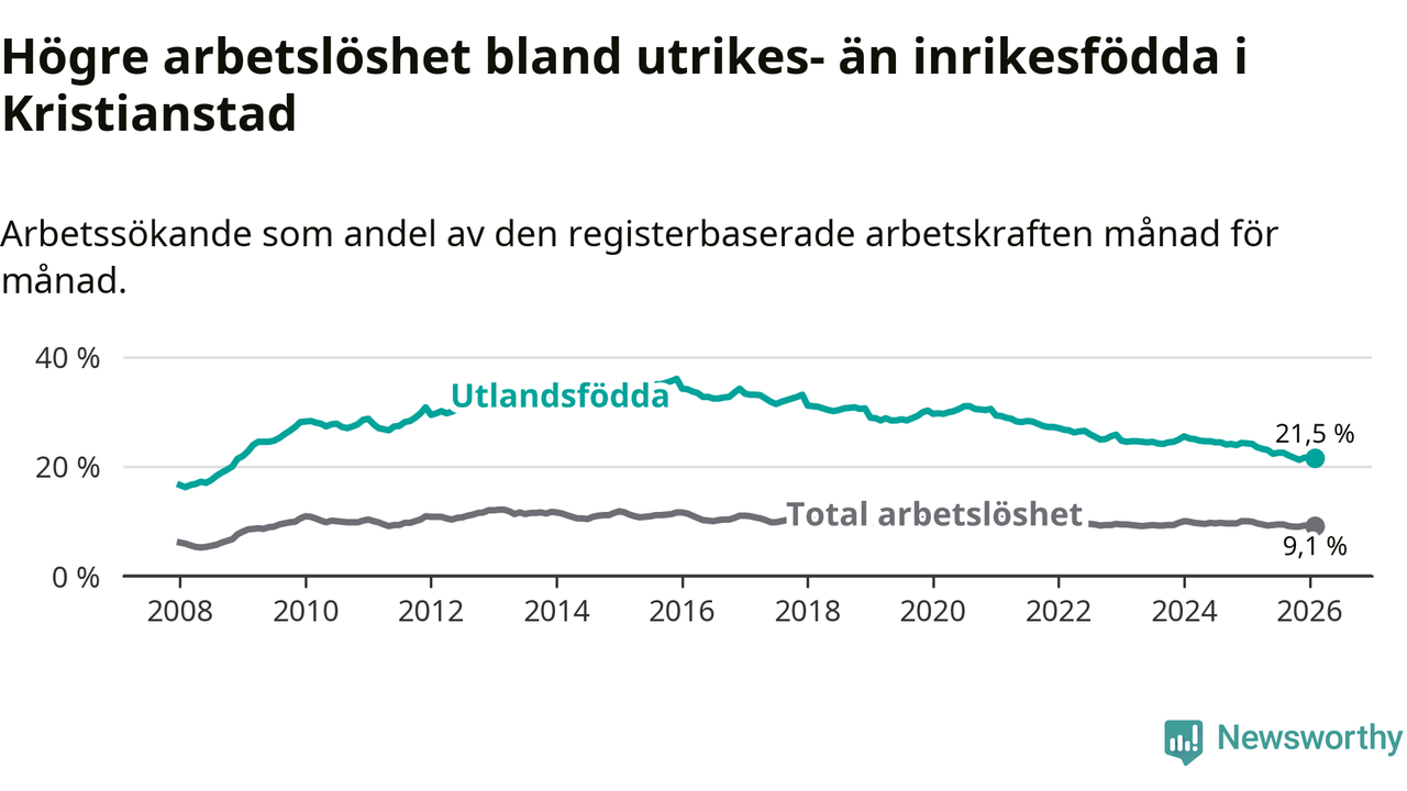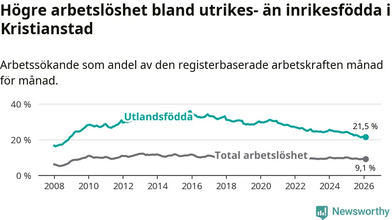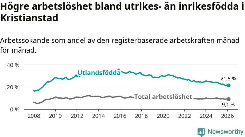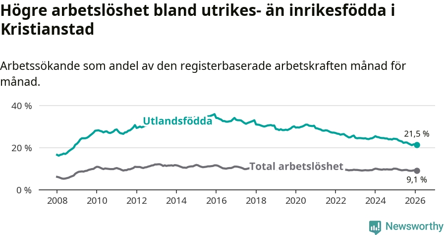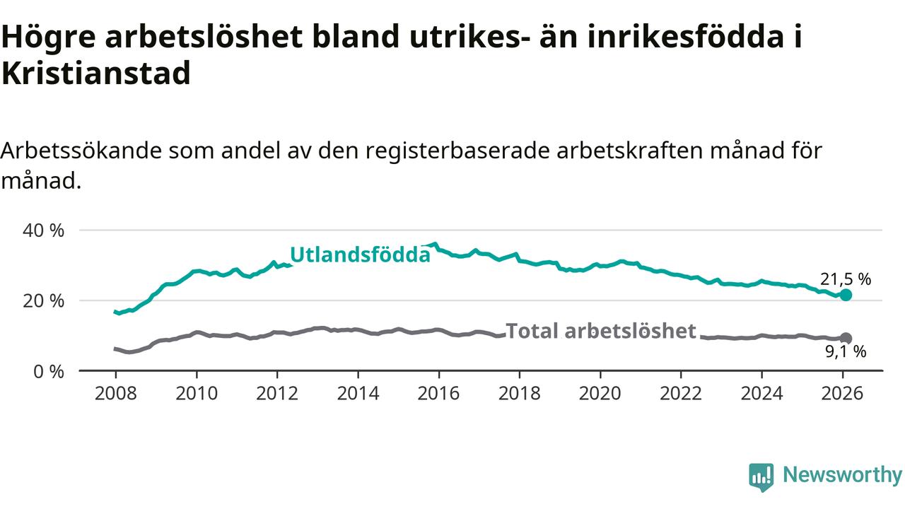 Arbetslösheten bland utlandsfödda var 21,5 procent i Kristianstad under februari månad, motsvarande 2 245 av 10 442 personer. Det är 2,6 procentenheter färre än vid samma tidpunkt i fjol (−256 om man räknar personer). Därmed är de utlandsföddas arbetslöshet lägre än vid samma tidpunkt i fjol för 18:e månaden i följd. Sedan augusti 2024 har arbetslösheten bland utlandsfödda minskat från 24,4 till 21,5 procent.