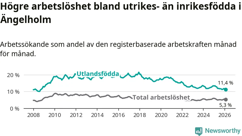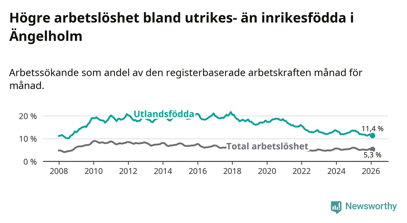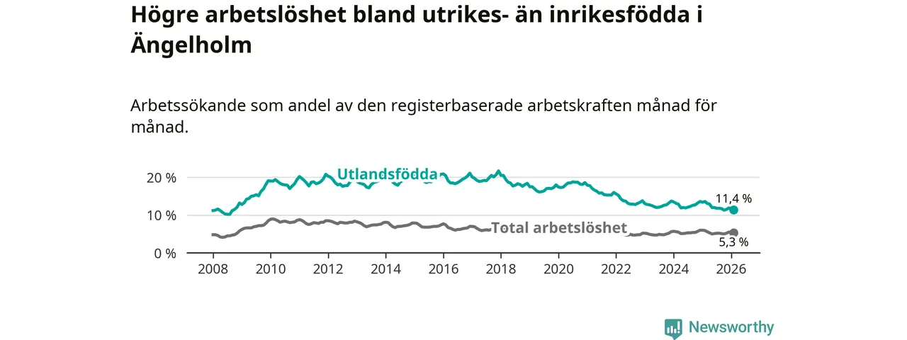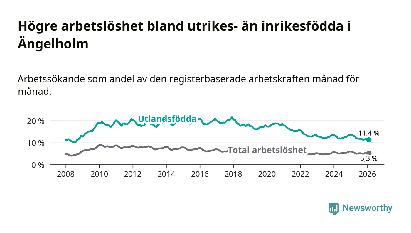 Skillnaden i arbetslöshet mellan utrikesfödda och hela befolkningen är 6,1 procentenheter i Ängelholm. Det är en betydligt mindre skillnad än för ett år sedan (−1,6 procentenheter).