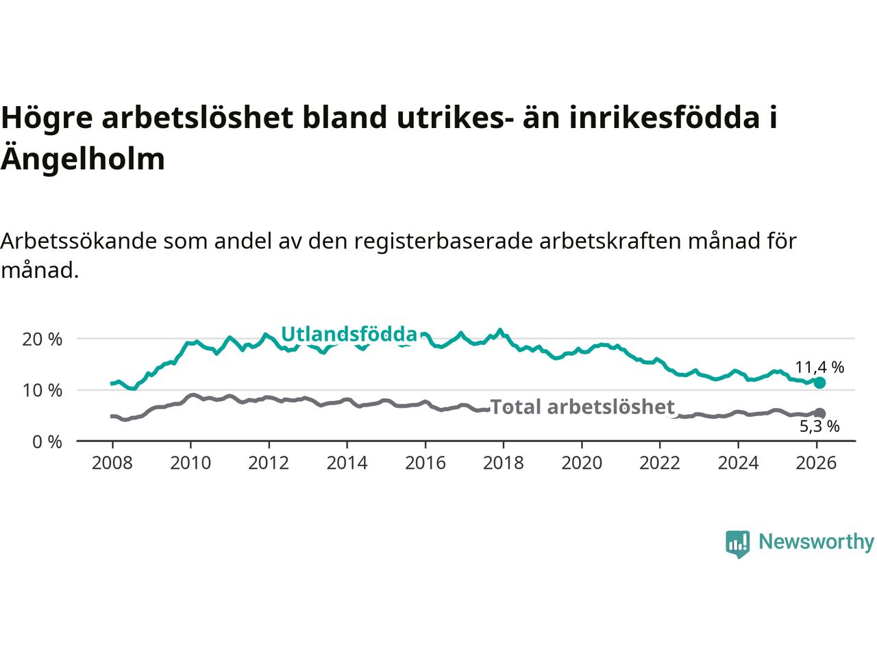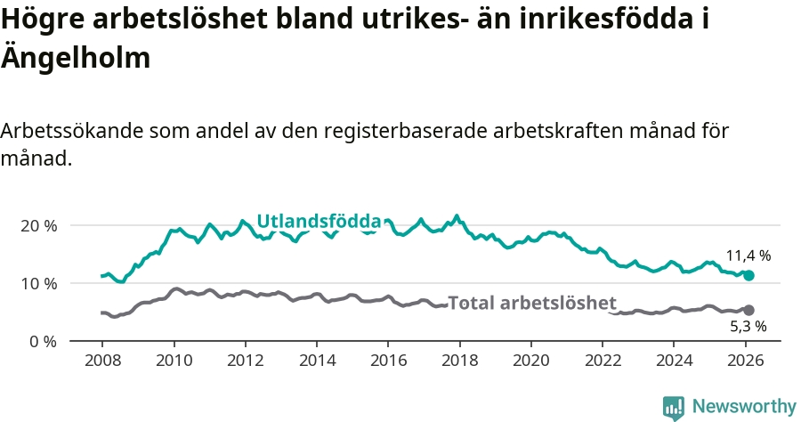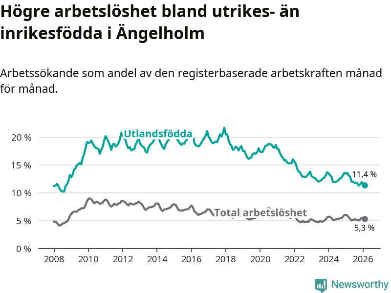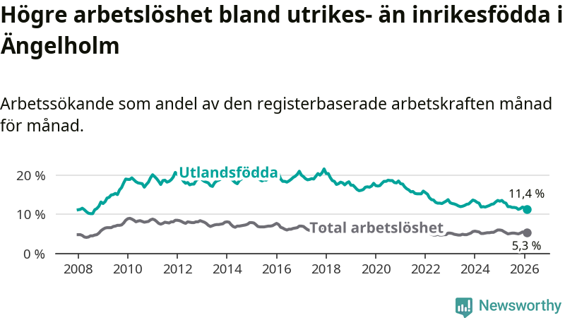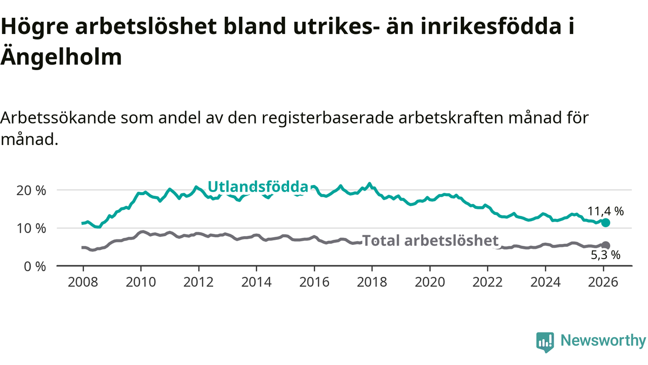 Skillnaden i arbetslöshet mellan utrikesfödda och hela befolkningen är 6,1 procentenheter i Ängelholm. Det är en betydligt mindre skillnad än för ett år sedan (−1,6 procentenheter).