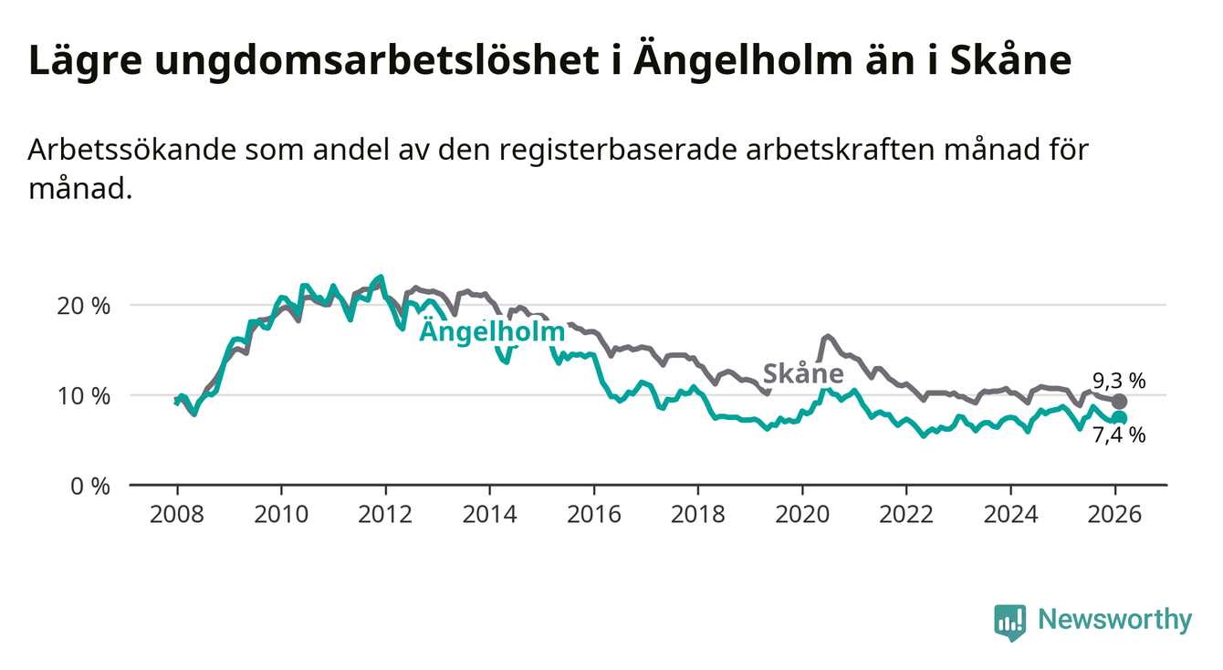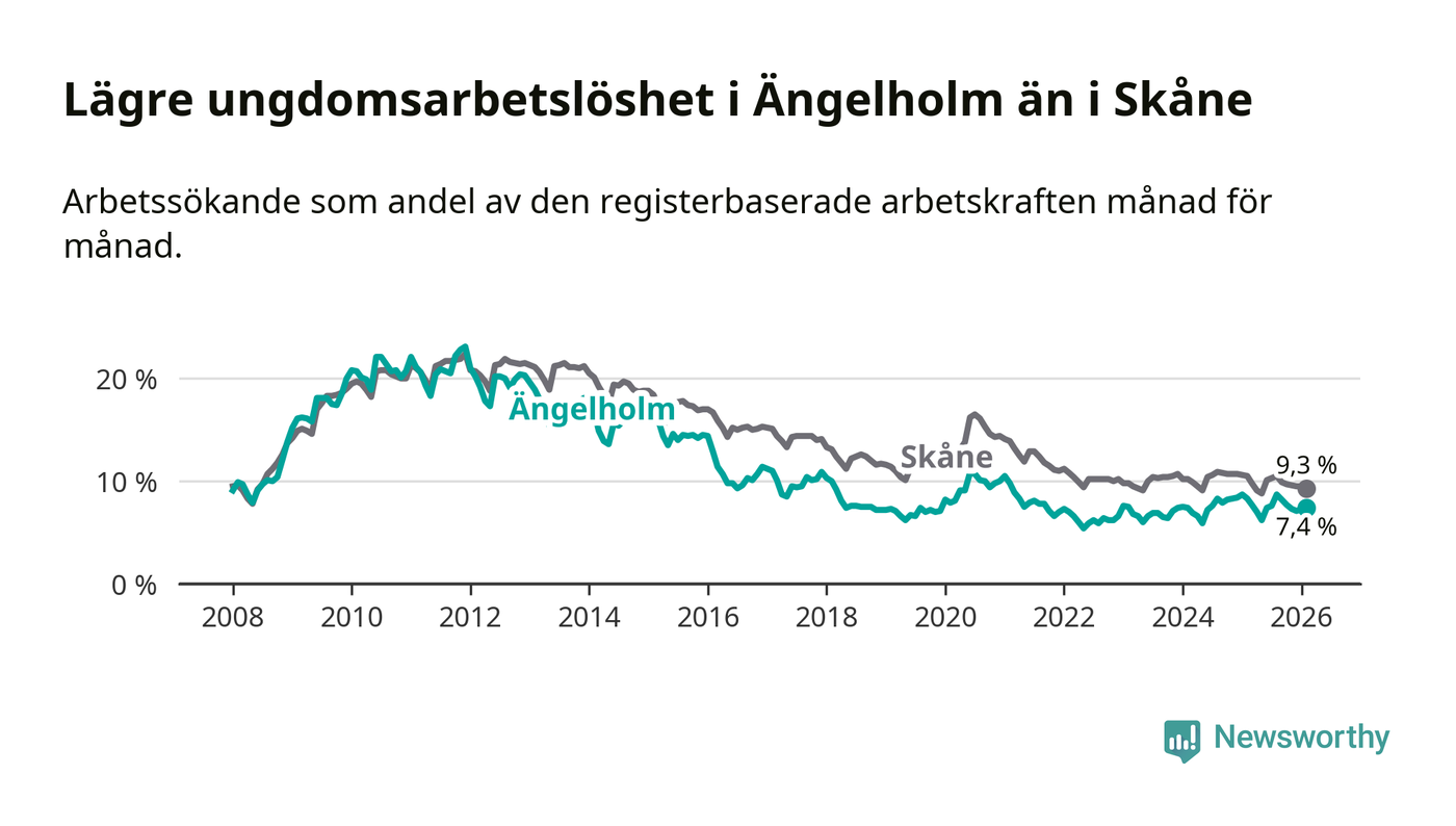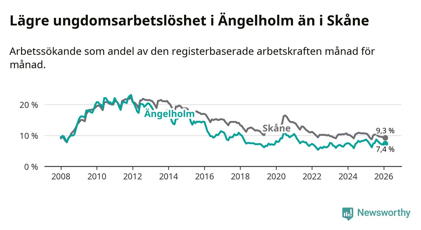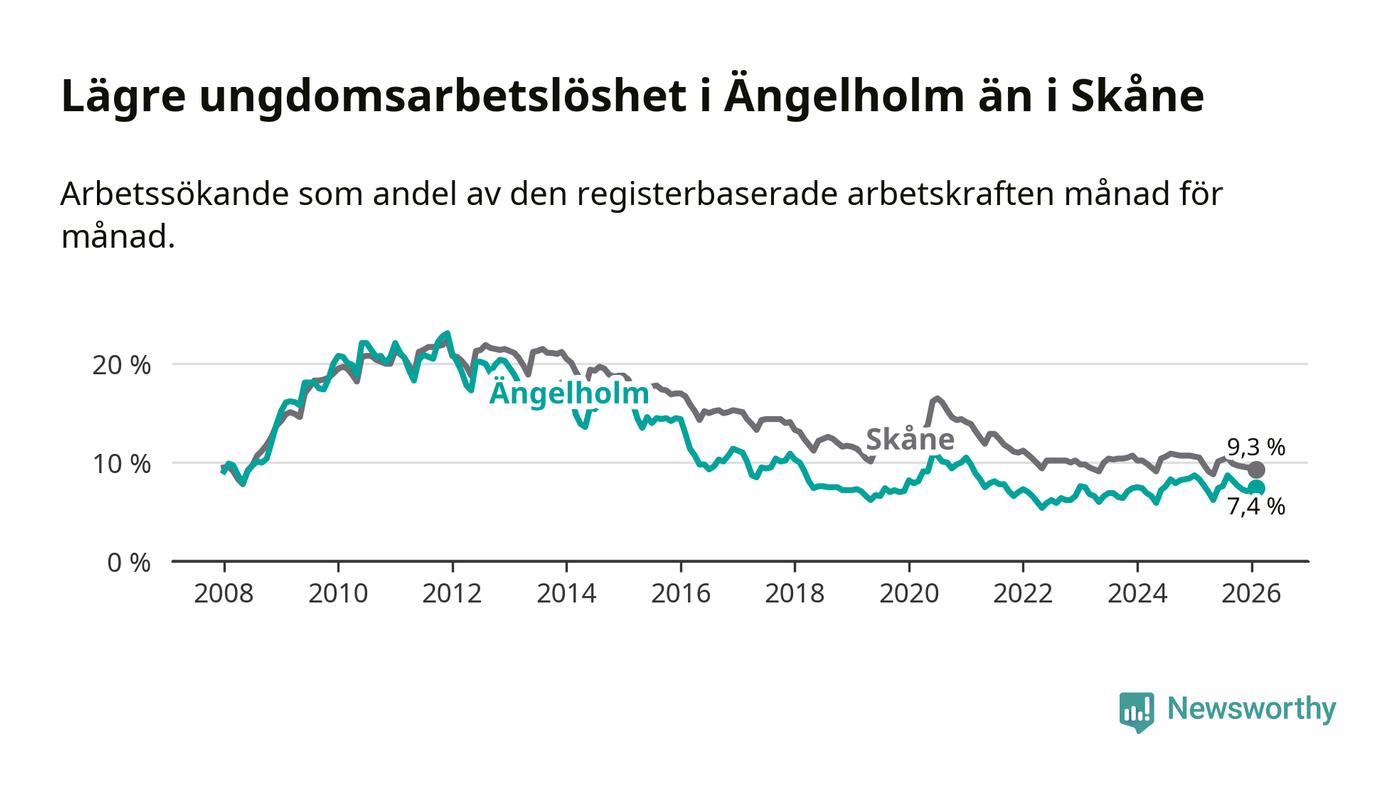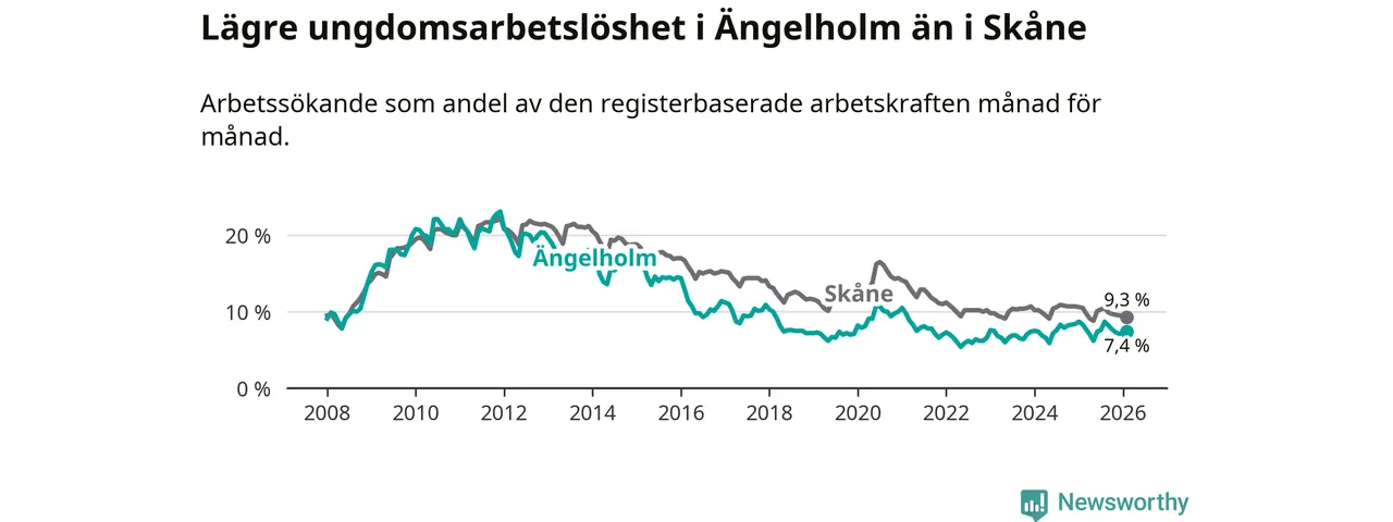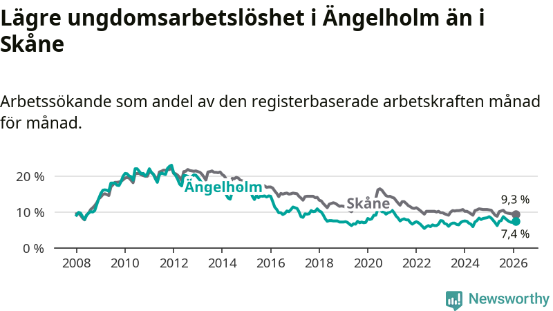 Precis som den totala arbetslösheten ligger ungdomsarbetslösheten i Ängelholm lägre än i Skåne som helhet. Skillnaden mellan kommunen och länet är 1,9 procentenheter.