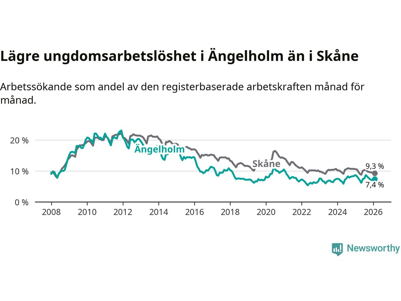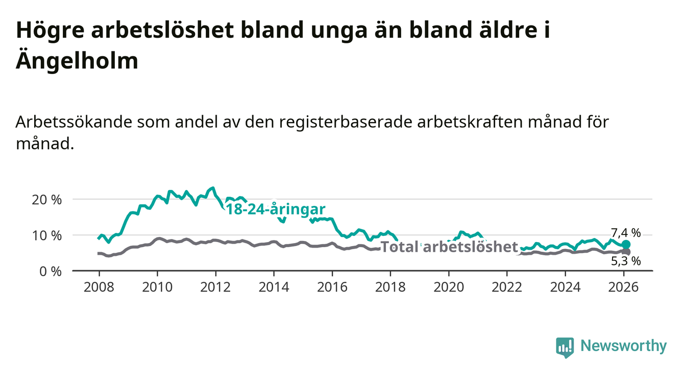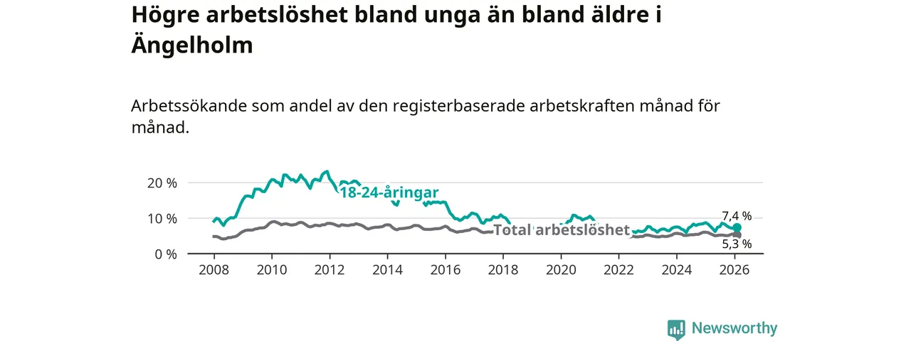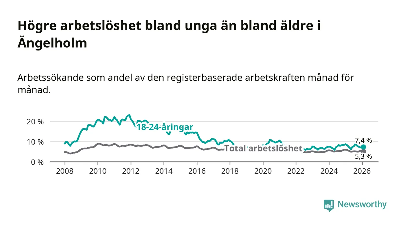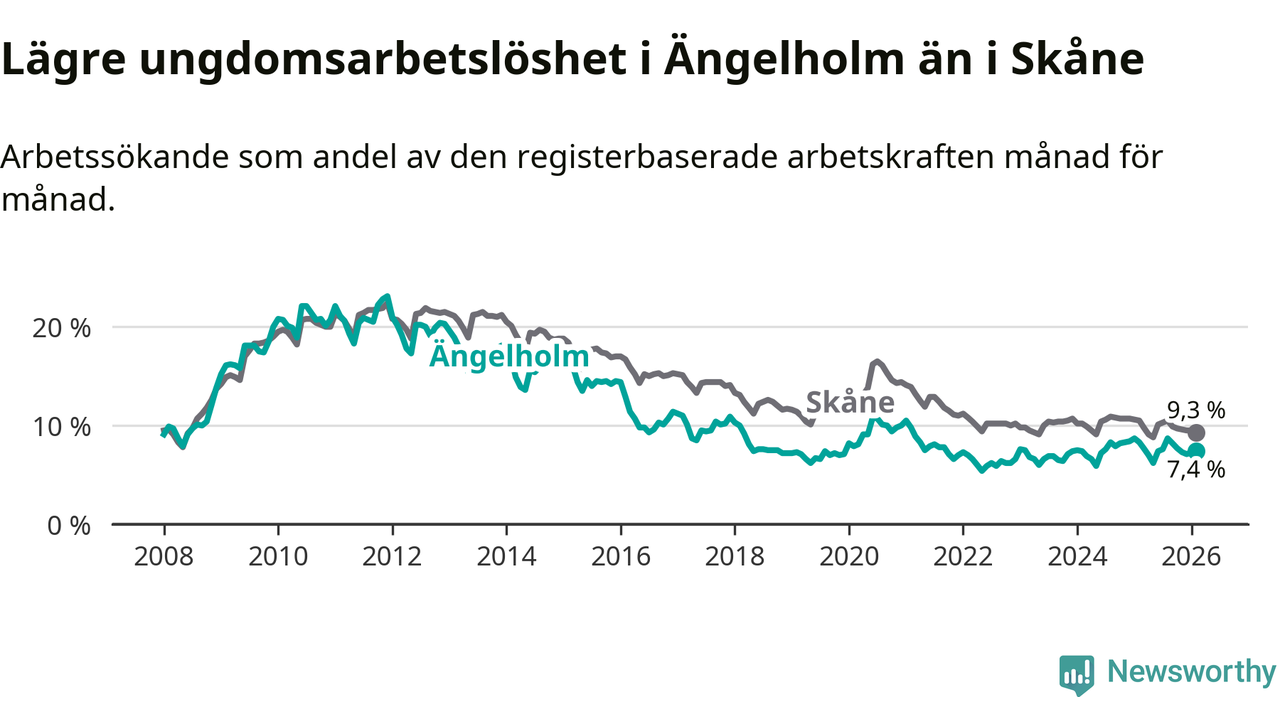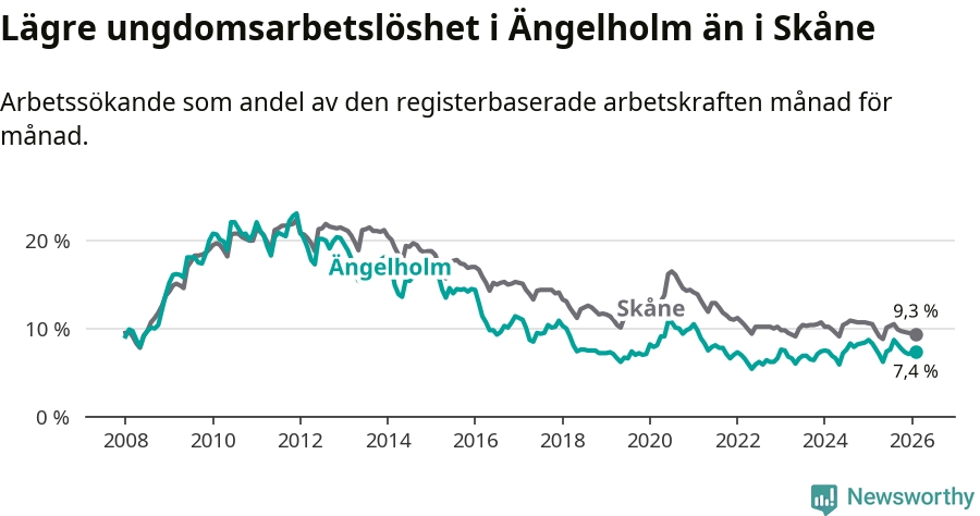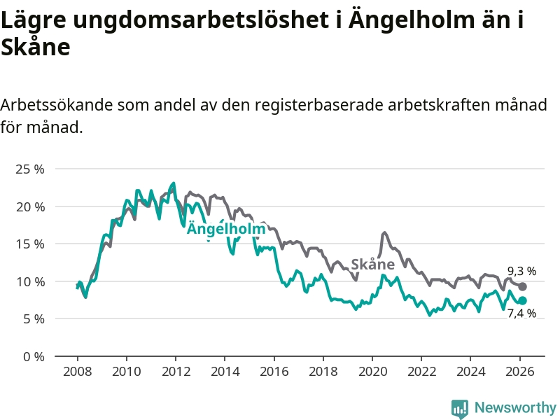 Precis som den totala arbetslösheten ligger ungdomsarbetslösheten i Ängelholm lägre än i Skåne som helhet. Skillnaden mellan kommunen och länet är 1,9 procentenheter.