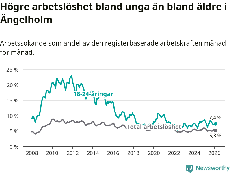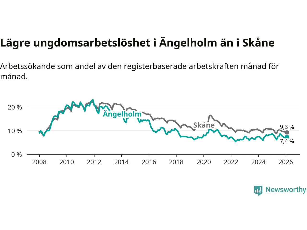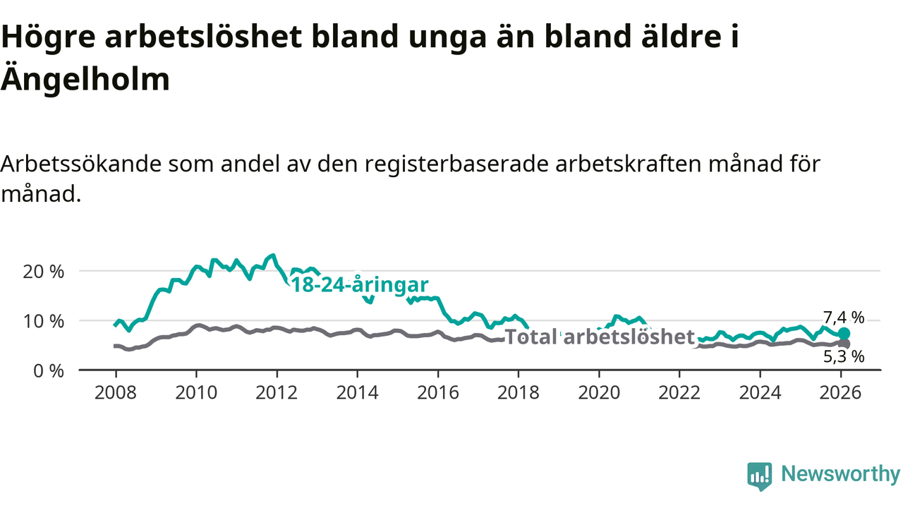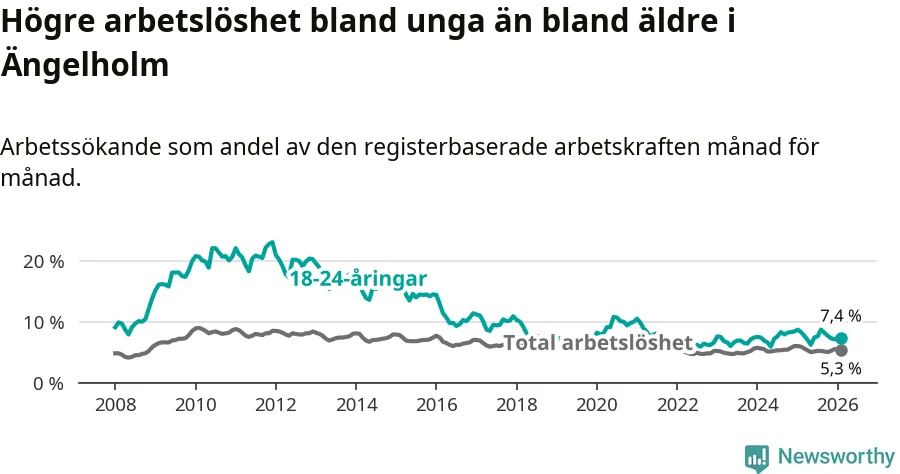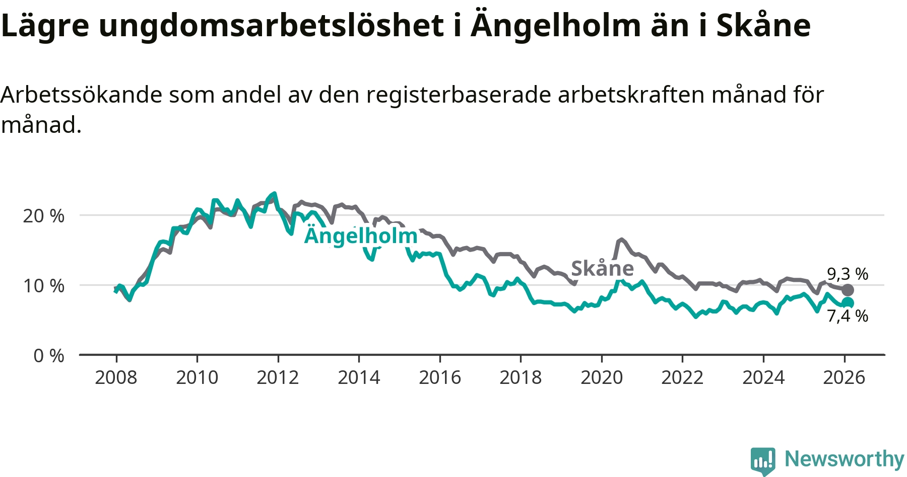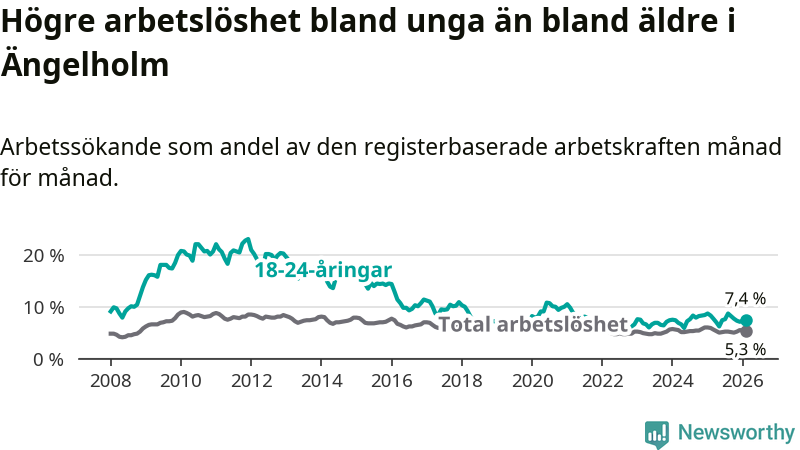 Precis som den totala arbetslösheten ligger ungdomsarbetslösheten i Ängelholm lägre än i Skåne som helhet. Skillnaden mellan kommunen och länet är 1,9 procentenheter.