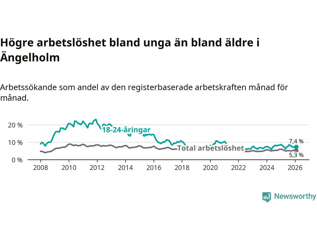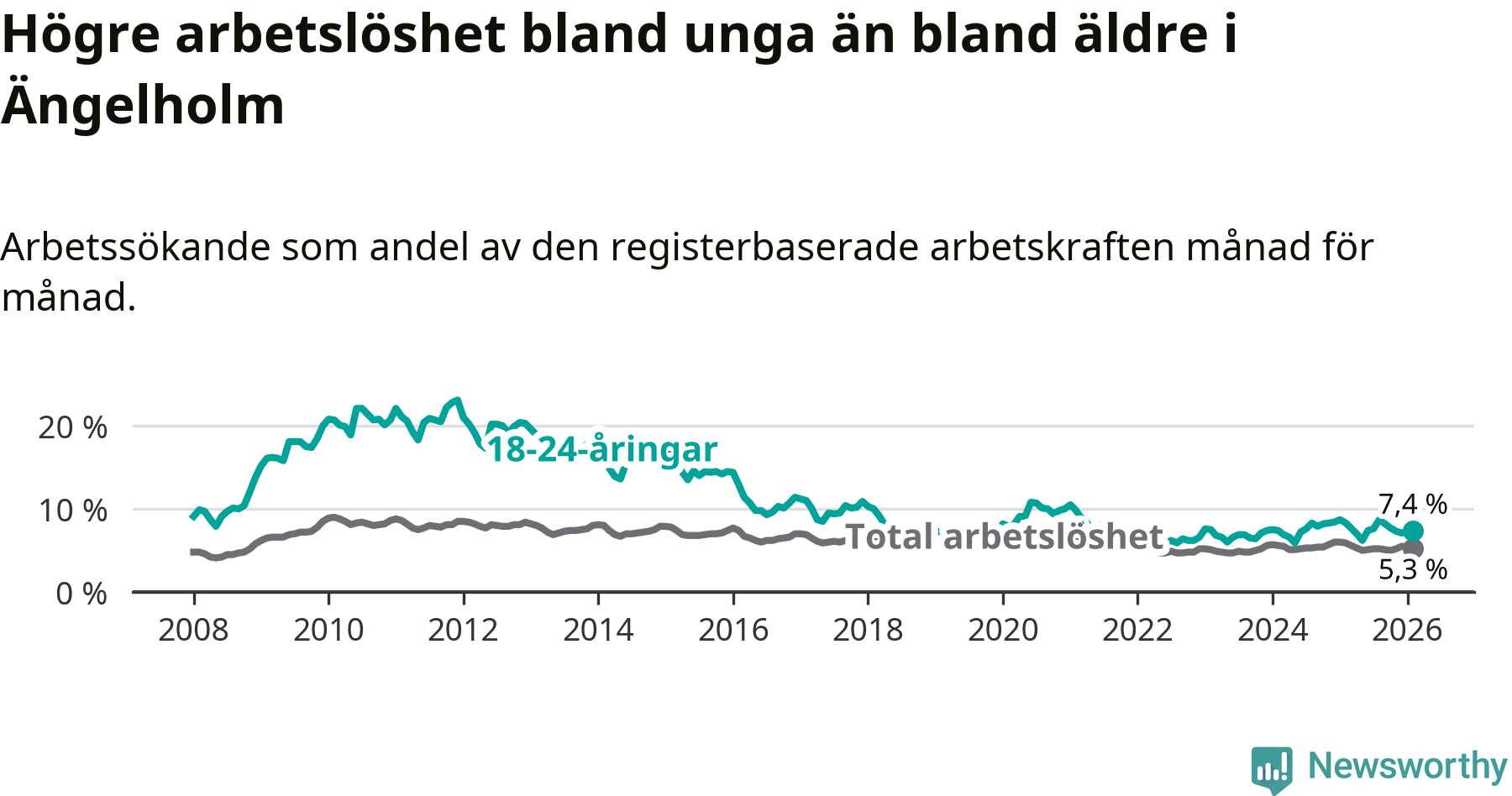 Precis som den totala arbetslösheten sjunker arbetslösheten bland unga (−0,9 procentenheter). I februari var 7,4 procent av 18–24-åringarna inskrivna som arbetssökande (motsvarande 155 personer). Mäter vi antalet inskrivna ser vi en minskning med 16 personer på ett års sikt.