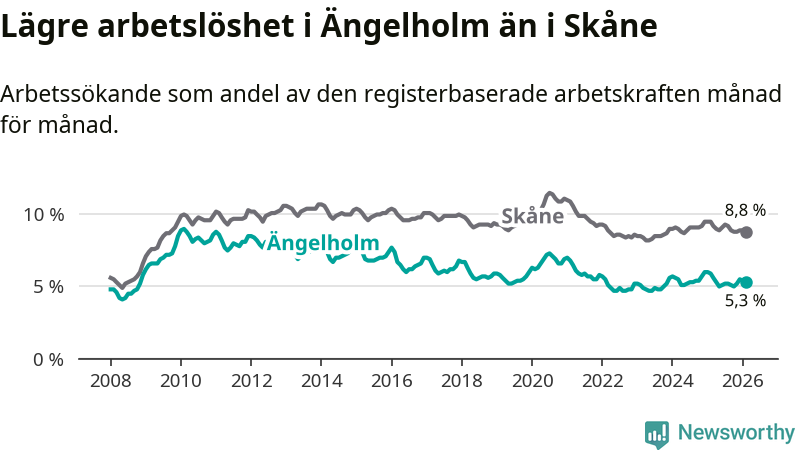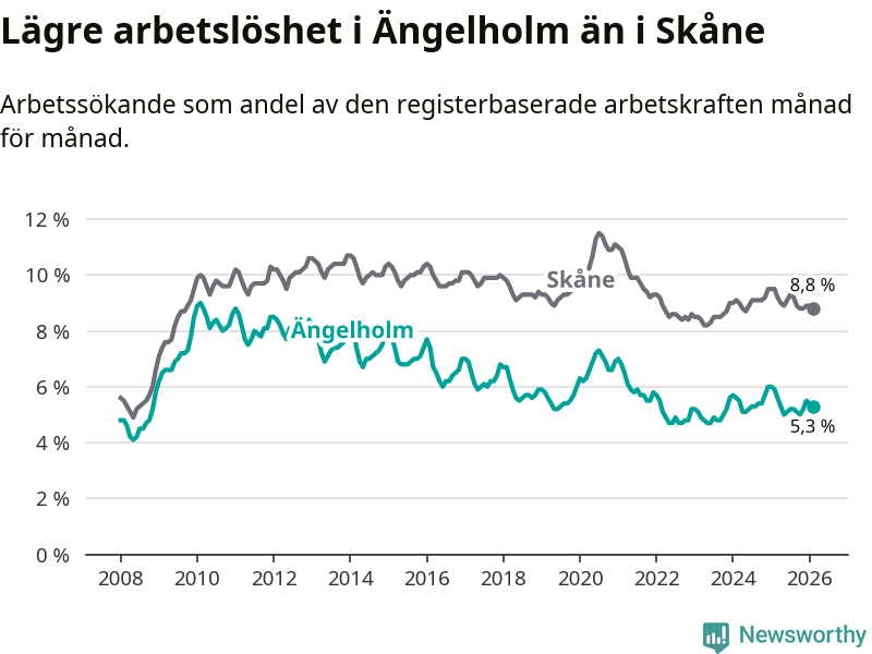 Ängelholm hade redan tidigare lägre arbetslöshet än snittet i hela Skåne län och nu växer klyftan (5,3 procent i kommunen, jämfört med 8,8 procent i hela länet). Lomma har den lägsta arbetslösheten i länet (3,8 procent), medan Perstorp har den högsta (13,2 procent). För att Ängelholm skulle komma ner i samma arbetslöshetsnivå som Lomma skulle 334 personer behöva sysselsättas.