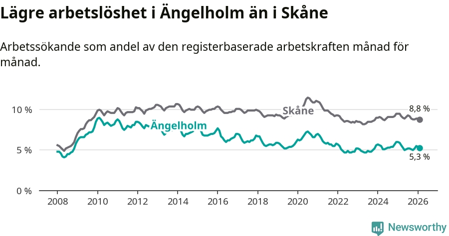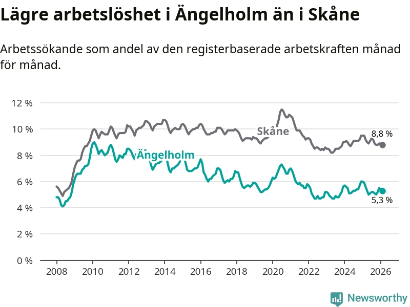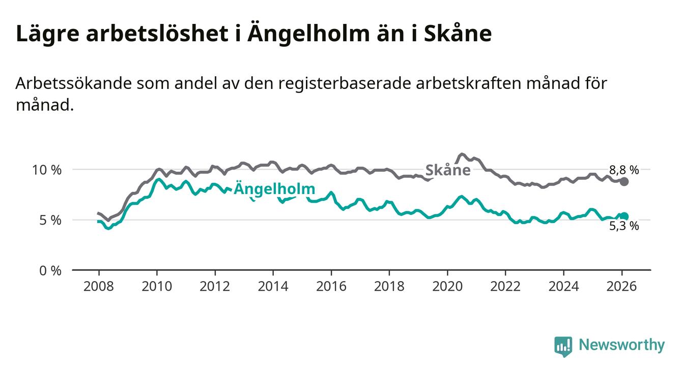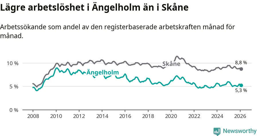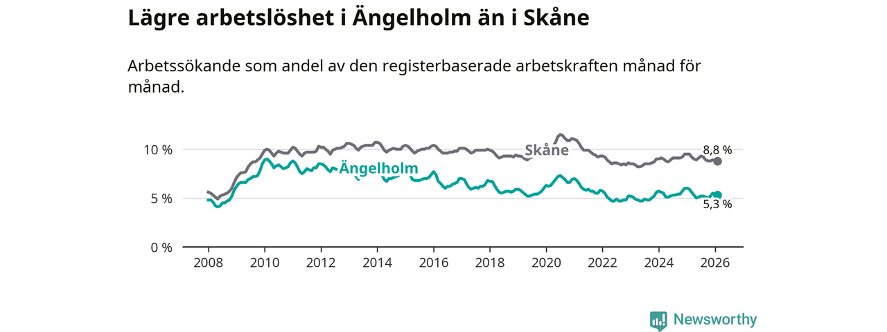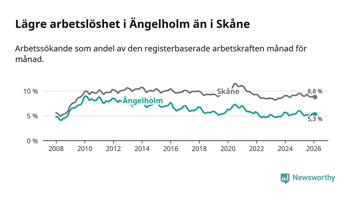 Under februari månad rapporterade Ängelholms kommun en total arbetslöshet på 5,3 procent. Det är en minskning jämfört med samma tidpunkt i fjol (−0,6 procentenheter). Även i Skåne län sjunker arbetslösheten .