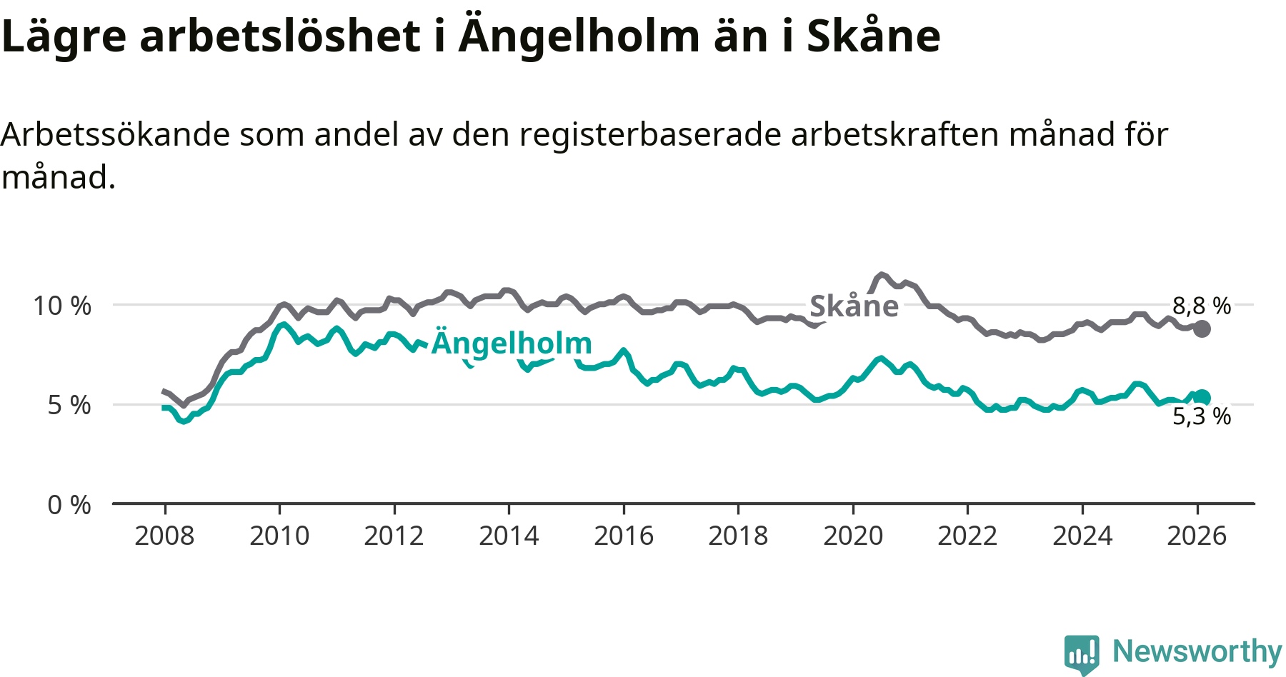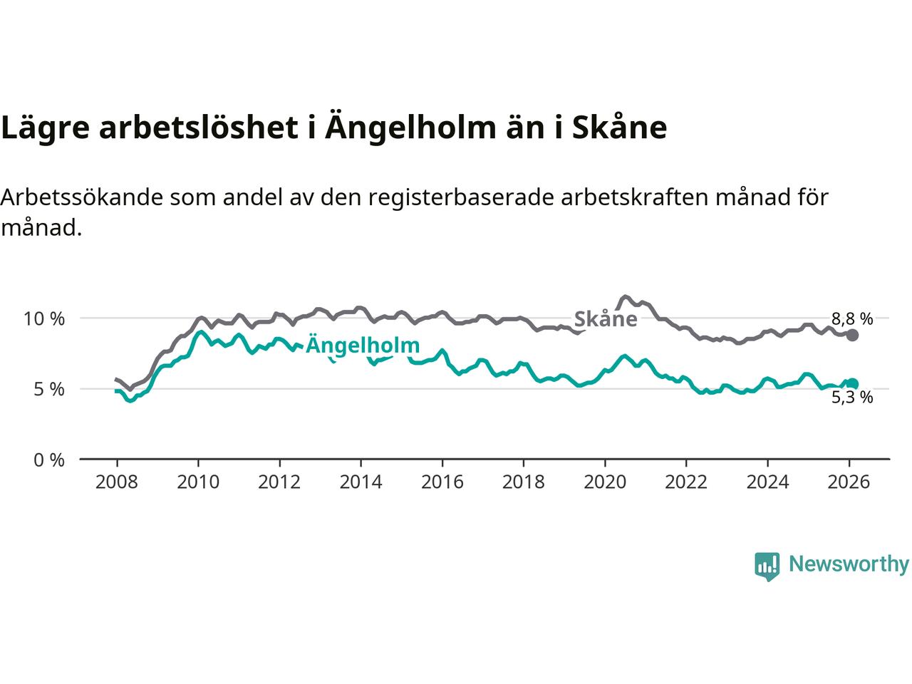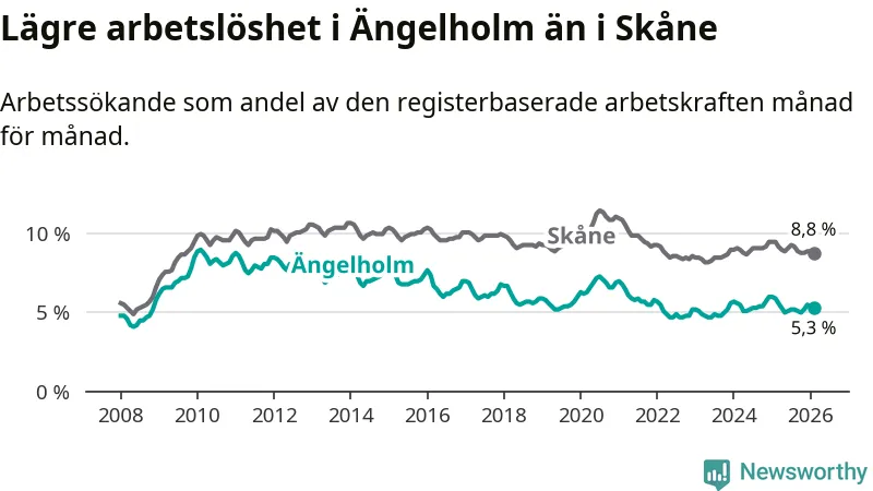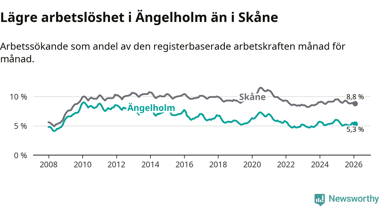 Under februari månad rapporterade Ängelholms kommun en total arbetslöshet på 5,3 procent. Det är en minskning jämfört med samma tidpunkt i fjol (−0,6 procentenheter). Även i Skåne län sjunker arbetslösheten .