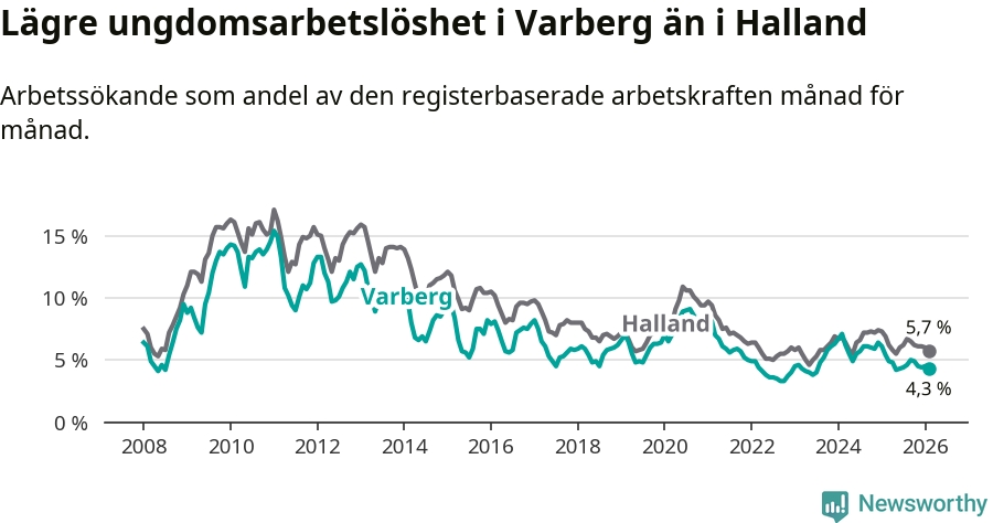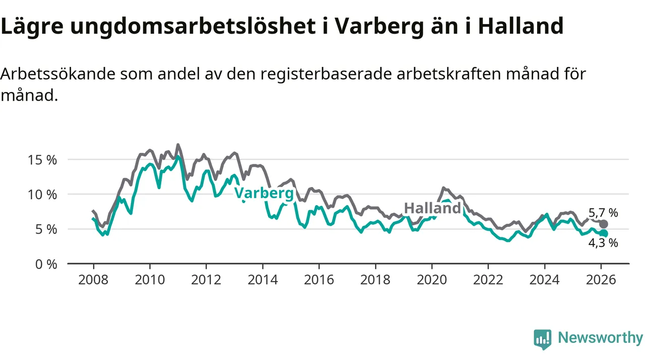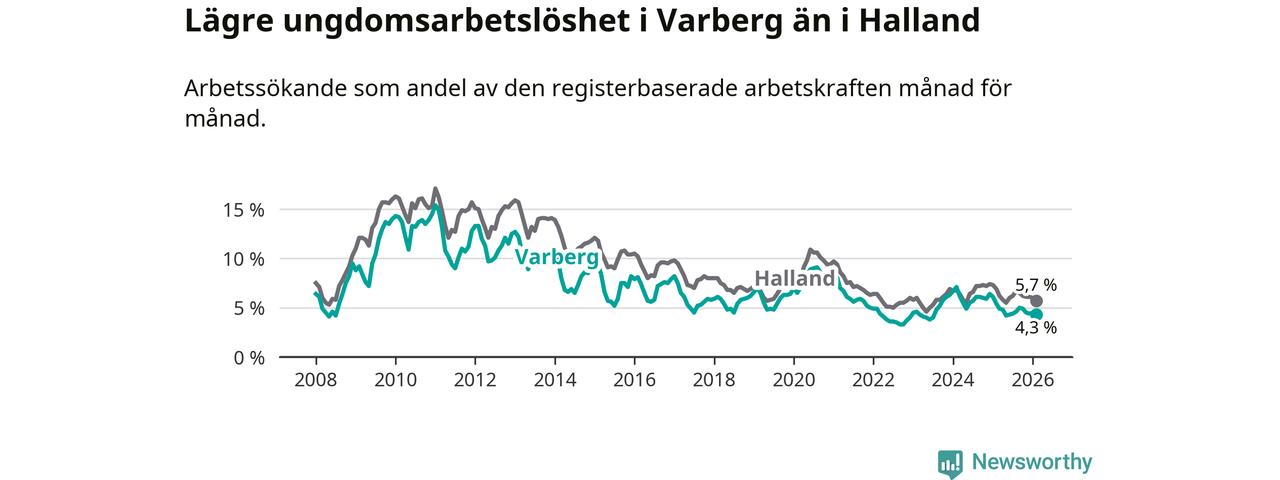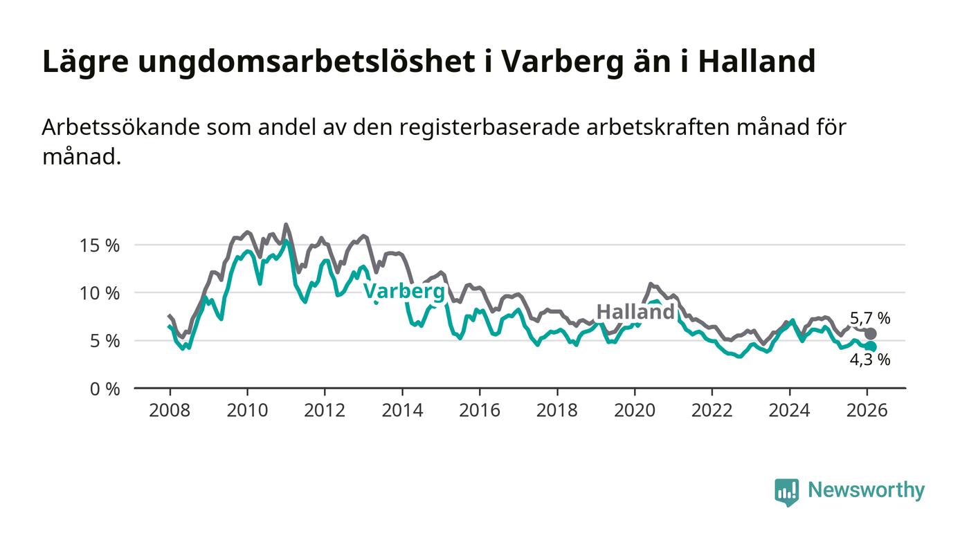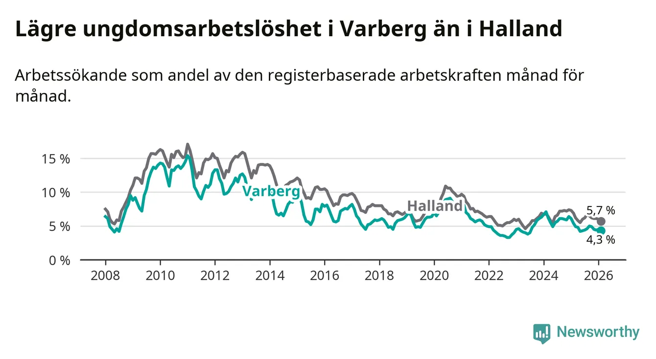 I och med den senaste månadens nedgång har de ungas arbetslöshet i Varberg sjunkit 14 månader i följd (ner från 6,4 procent i december 2024 till 4,3 procent nu).