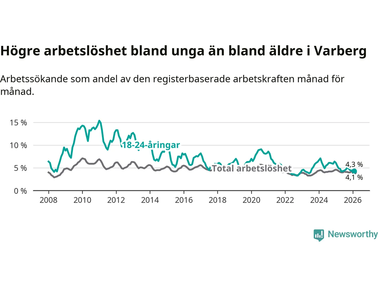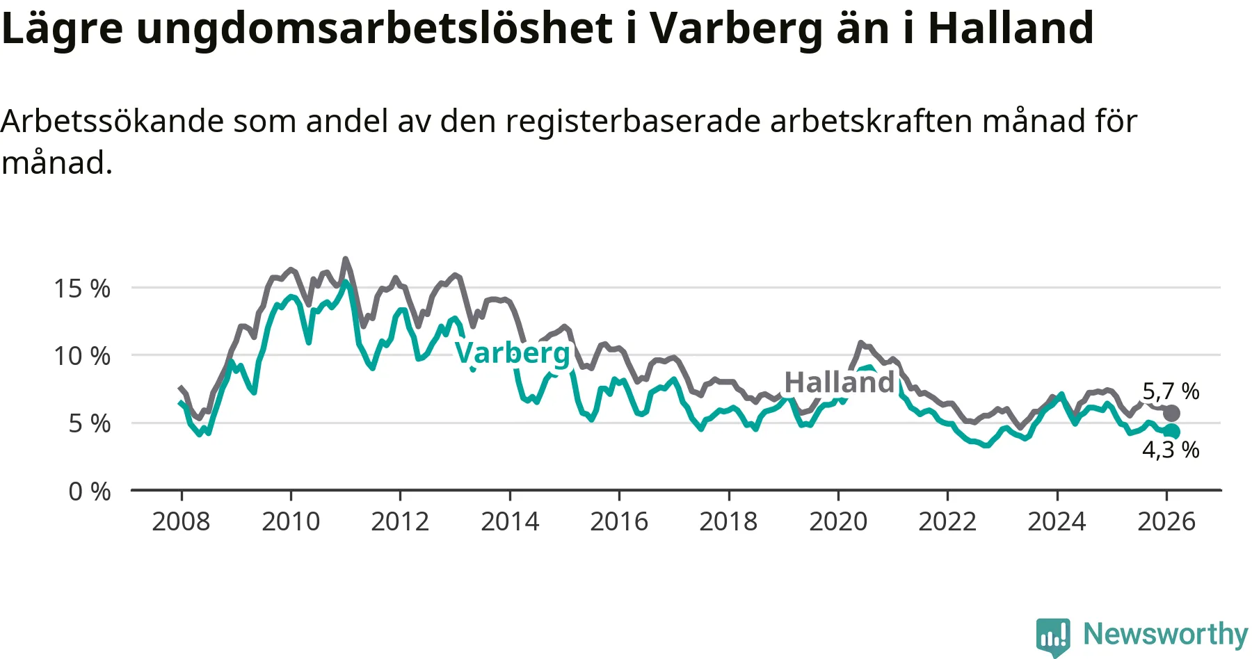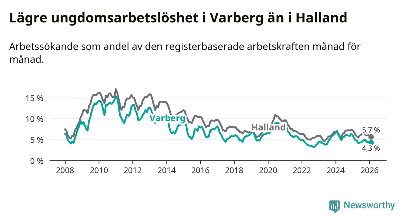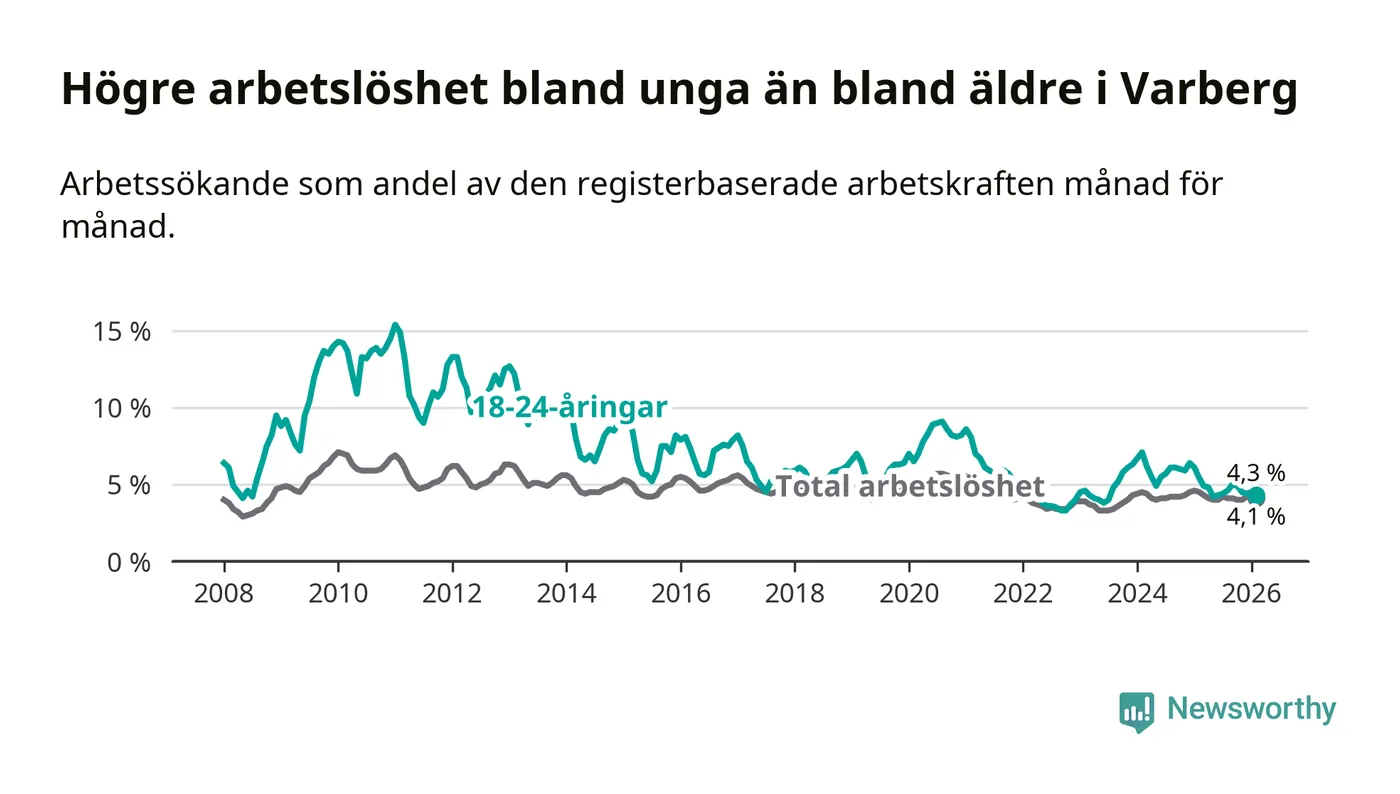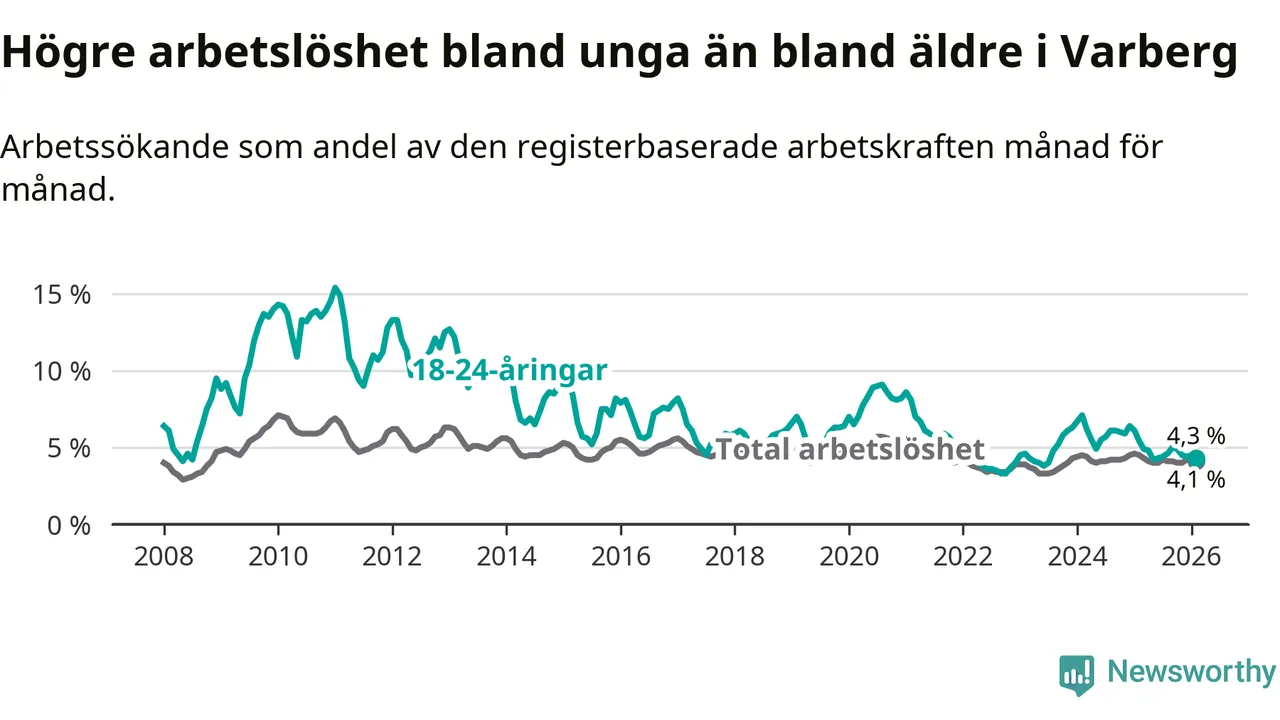 I och med den senaste månadens nedgång har de ungas arbetslöshet i Varberg sjunkit 14 månader i följd (ner från 6,4 procent i december 2024 till 4,3 procent nu).