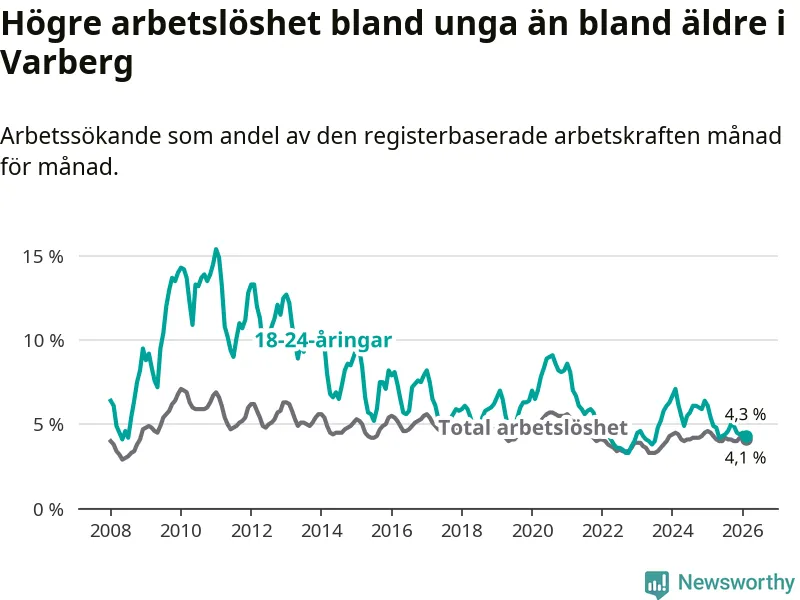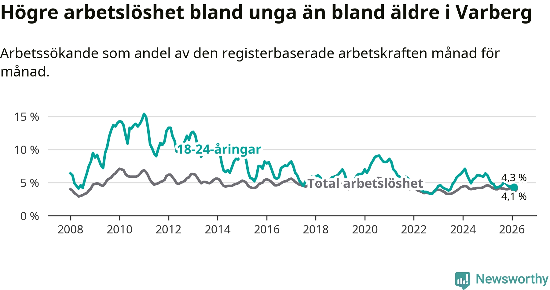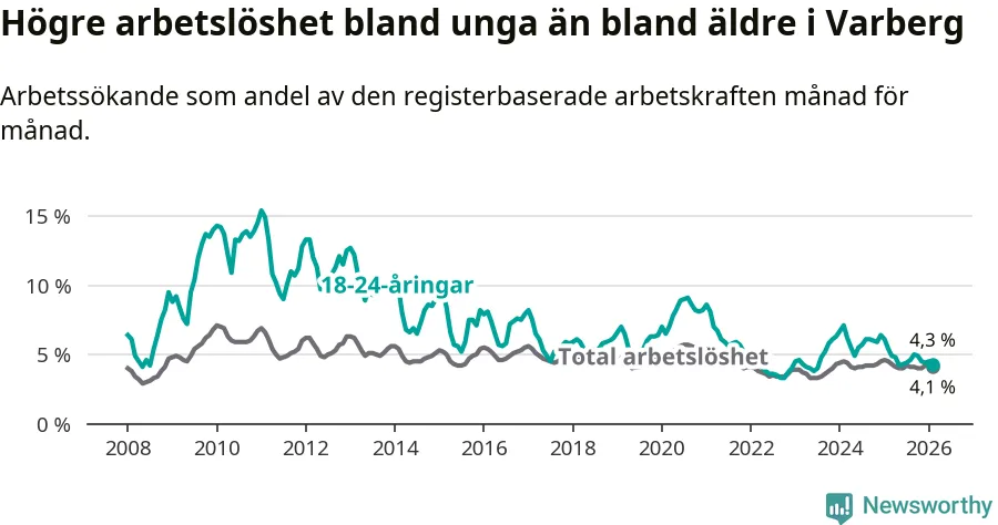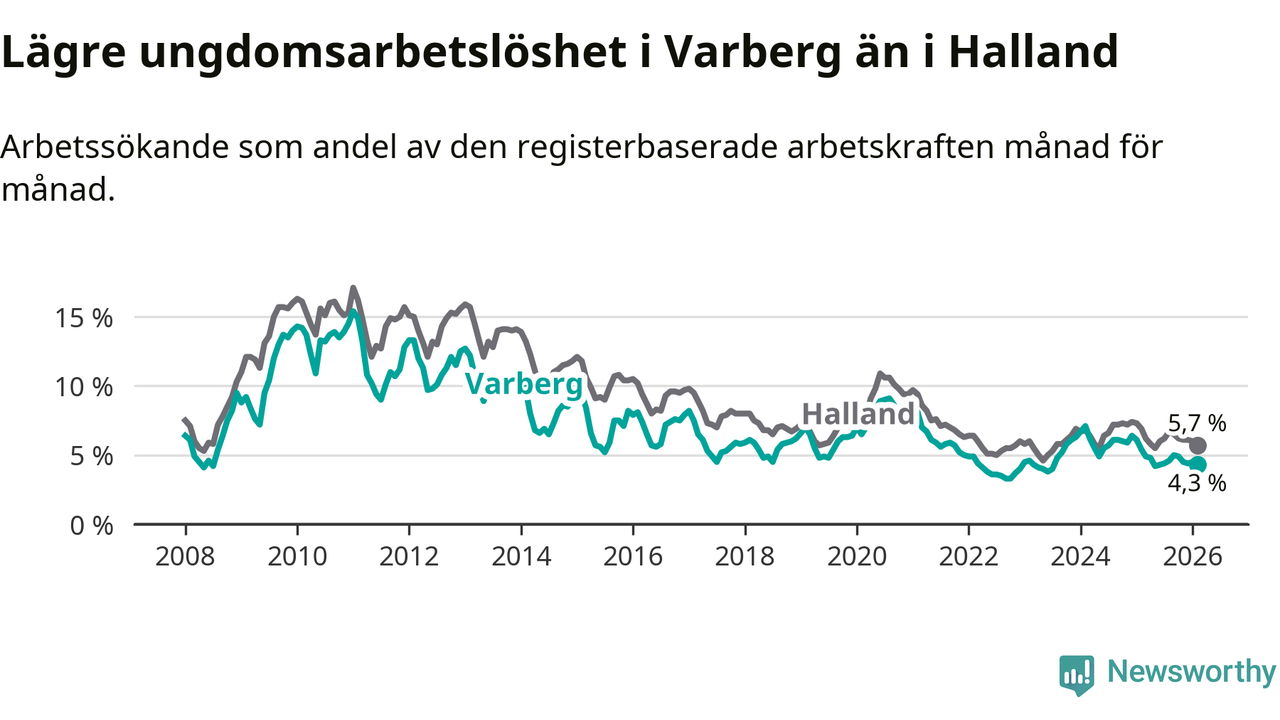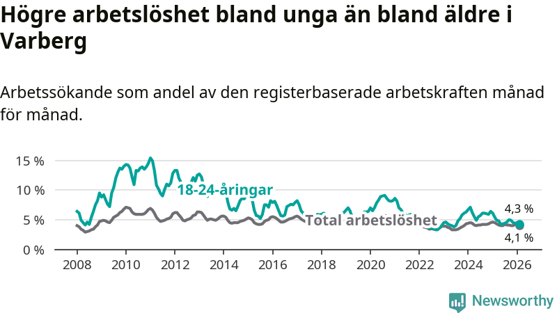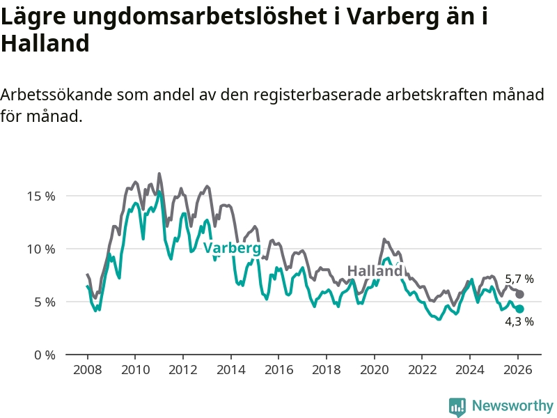 I och med den senaste månadens nedgång har de ungas arbetslöshet i Varberg sjunkit 14 månader i följd (ner från 6,4 procent i december 2024 till 4,3 procent nu).