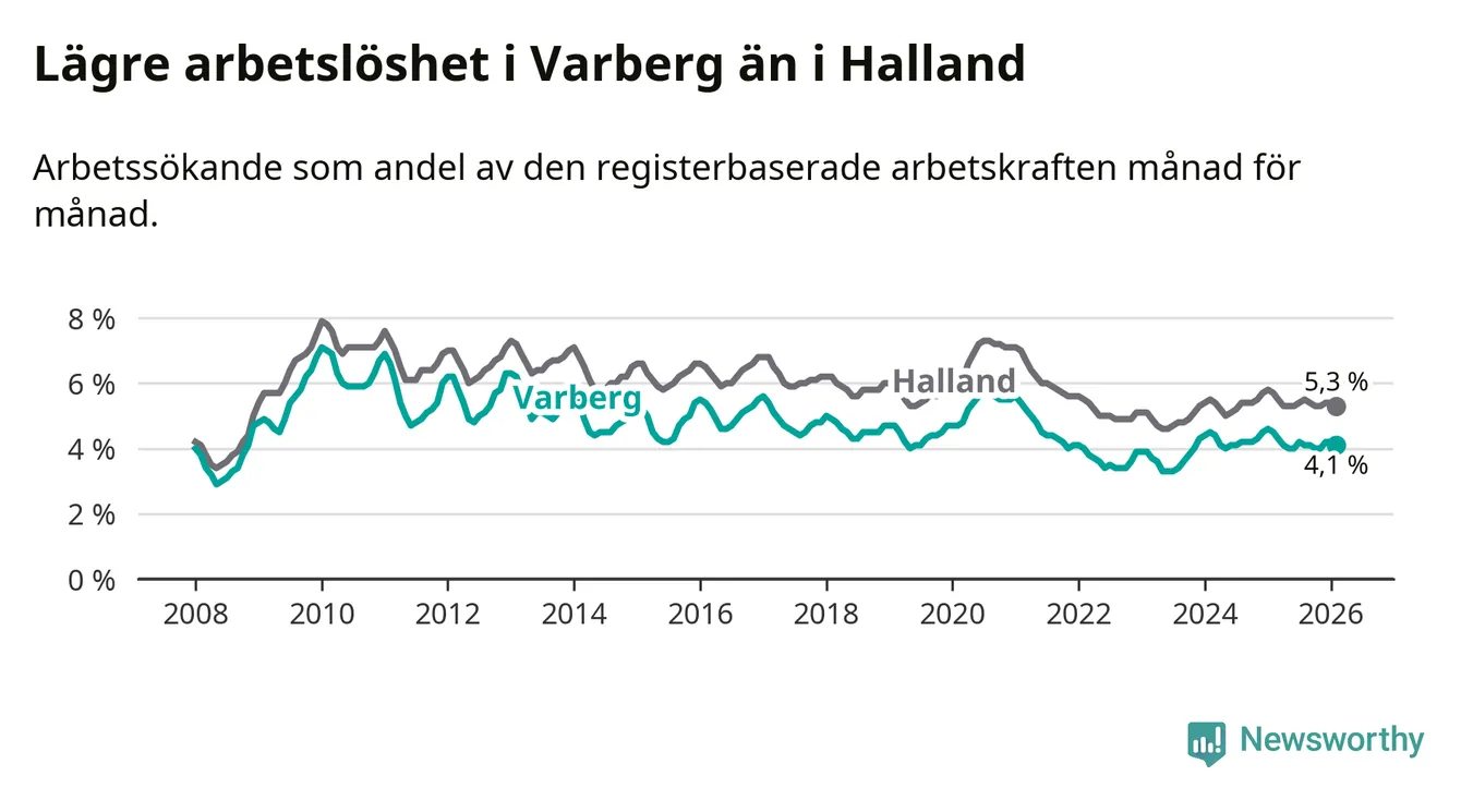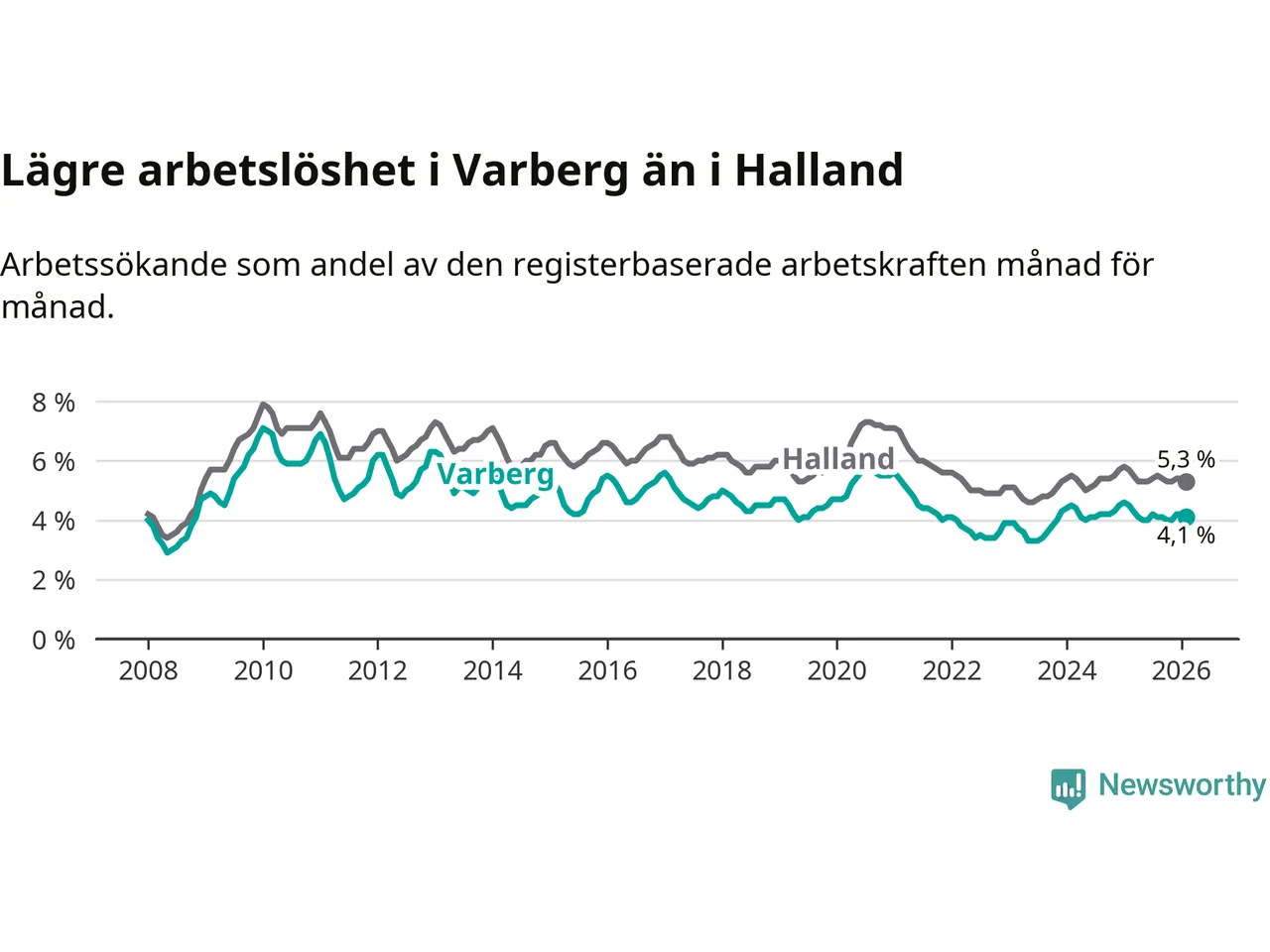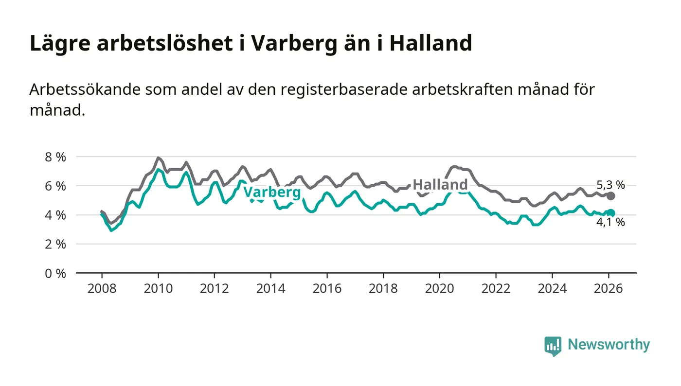 Under februari månad rapporterade Varbergs kommun en total arbetslöshet på 4,1 procent. Det är en minskning jämfört med samma tidpunkt i fjol (−0,4 procentenheter). Även i Hallands län sjunker arbetslösheten .