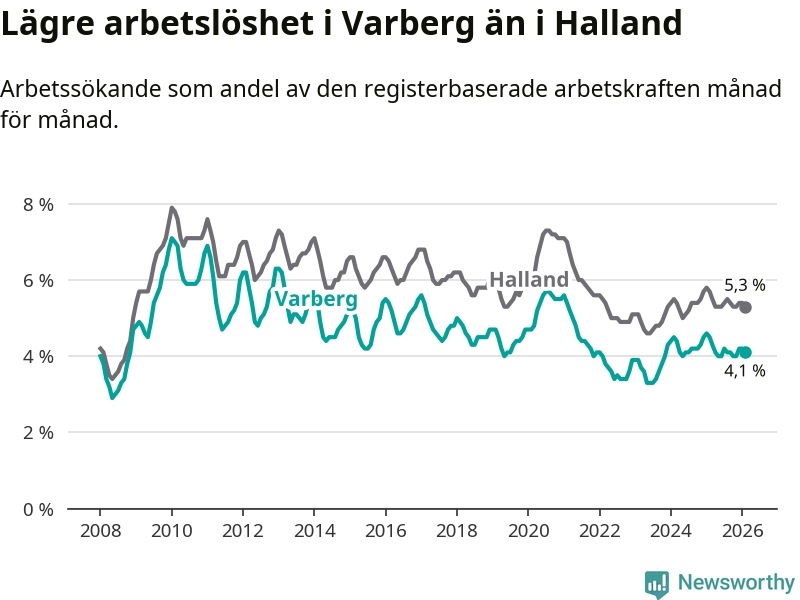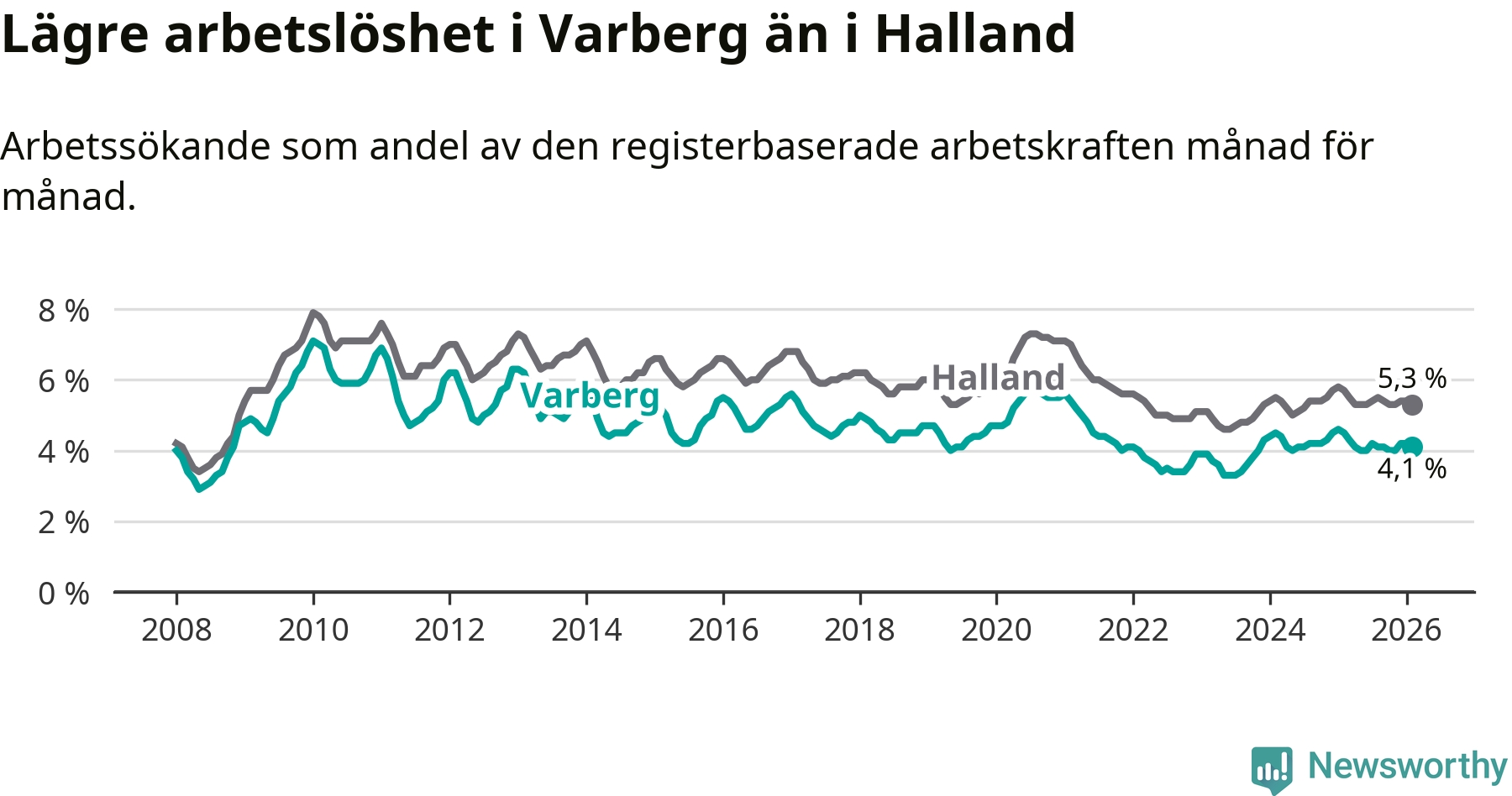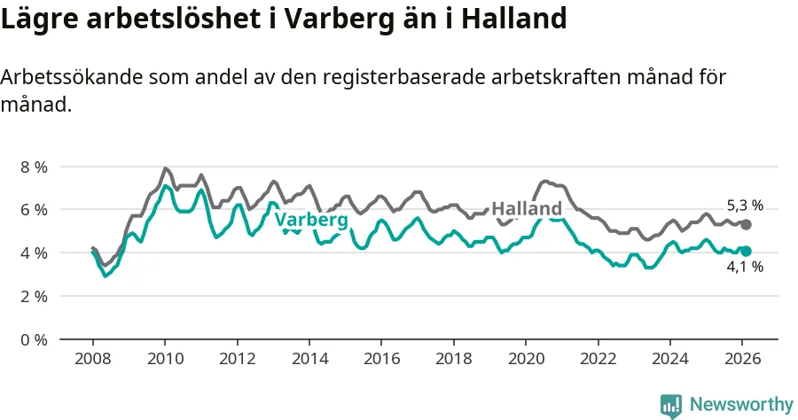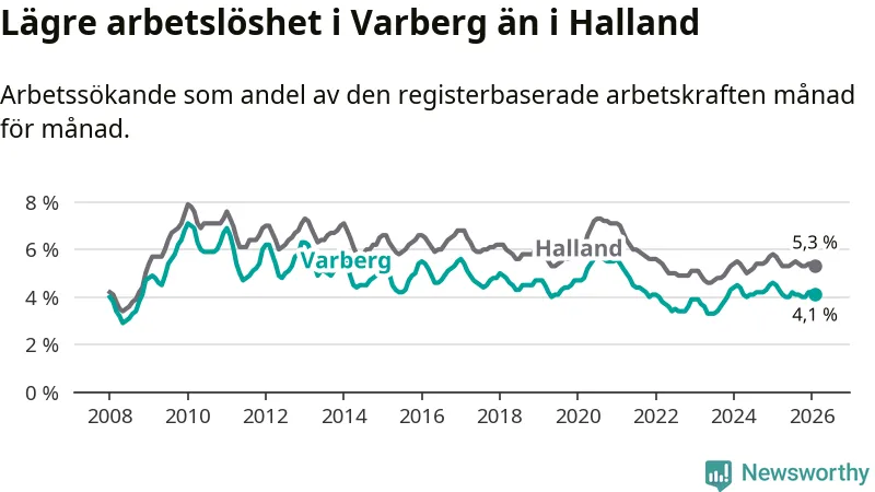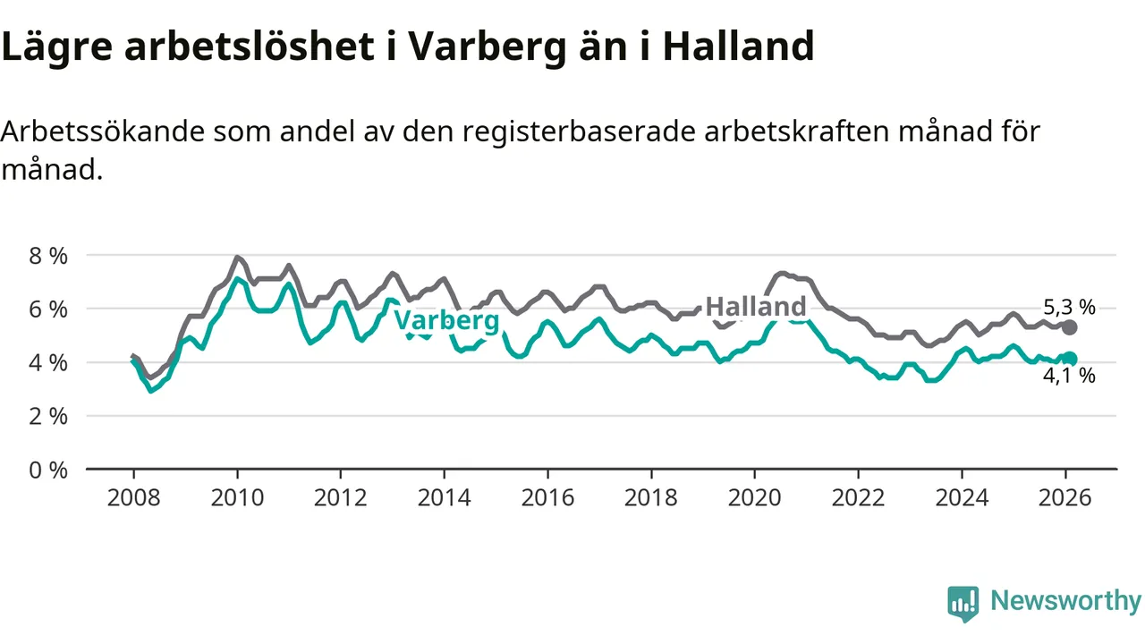 Under februari månad rapporterade Varbergs kommun en total arbetslöshet på 4,1 procent. Det är en minskning jämfört med samma tidpunkt i fjol (−0,4 procentenheter). Även i Hallands län sjunker arbetslösheten .