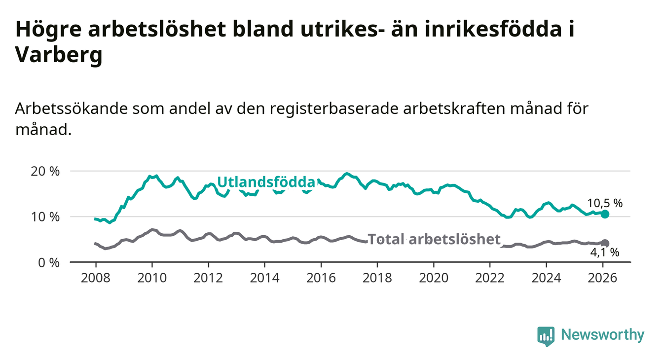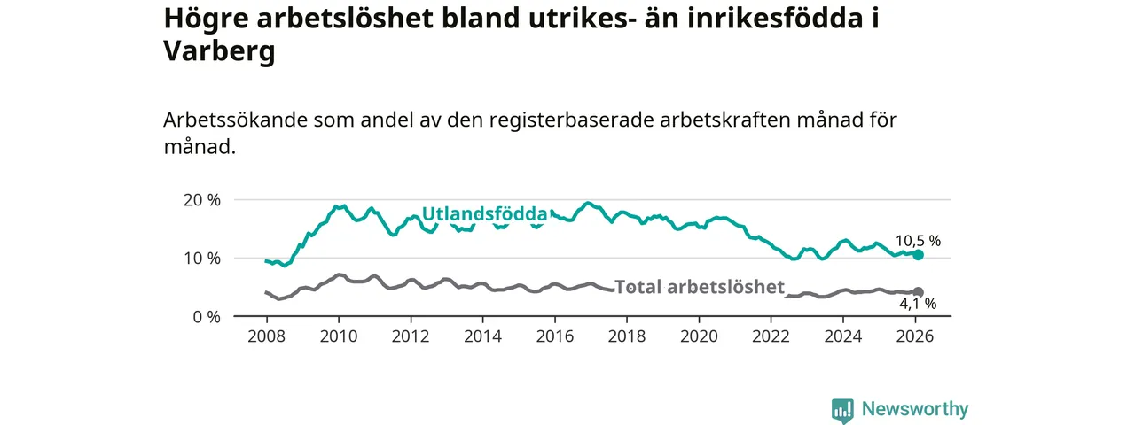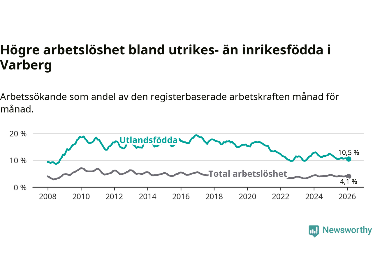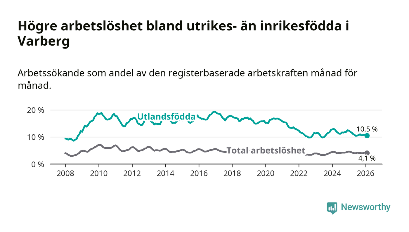 Arbetslösheten bland utlandsfödda var 10,5 procent i Varberg under februari månad, motsvarande 515 av 4 905 personer. Det är 1,4 procentenheter färre än vid samma tidpunkt i fjol (−63 om man räknar personer). Därmed är de utlandsföddas arbetslöshet lägre än vid samma tidpunkt i fjol för 15:e månaden i följd. Sedan november 2024 har arbetslösheten bland utlandsfödda minskat från 11,9 till 10,5 procent.
