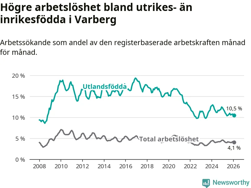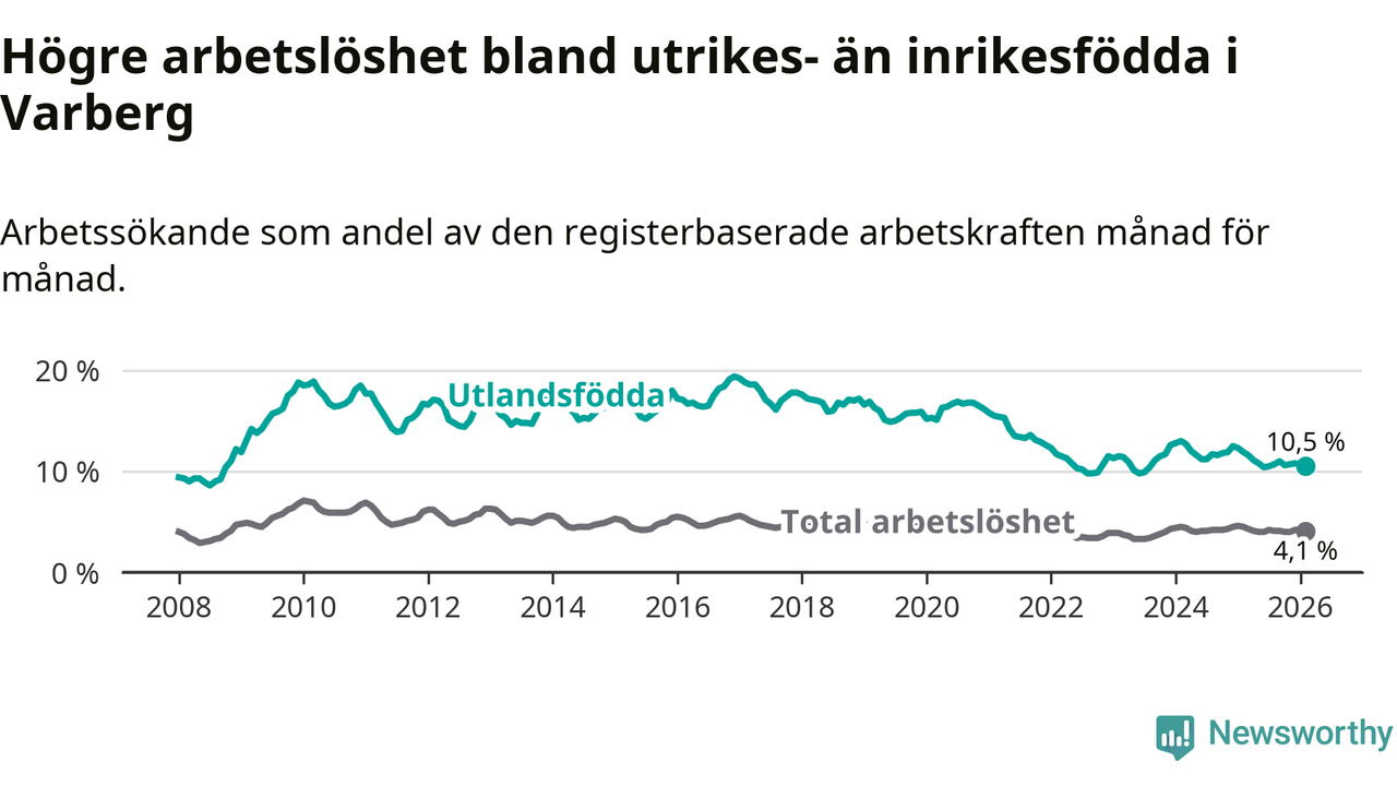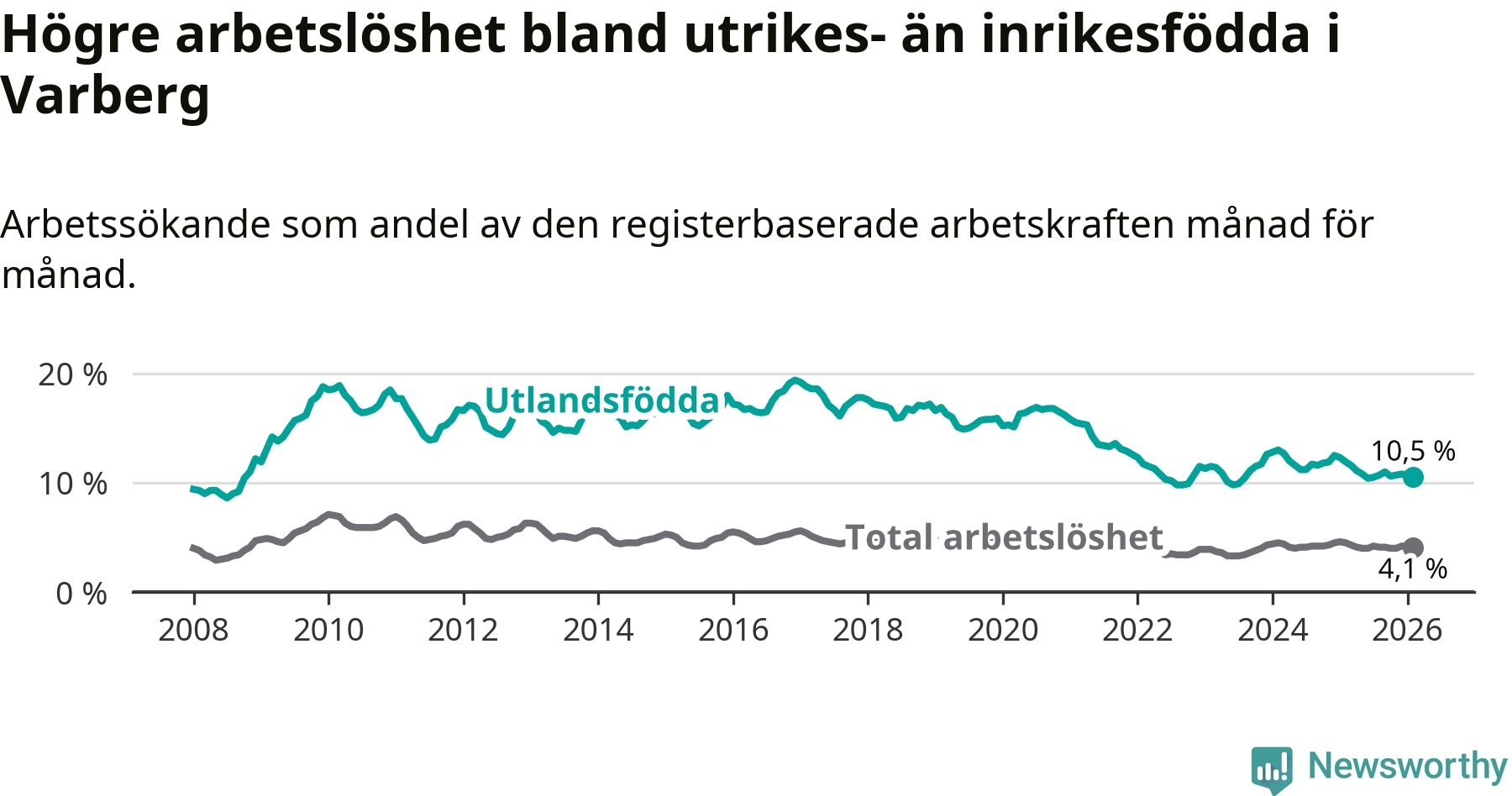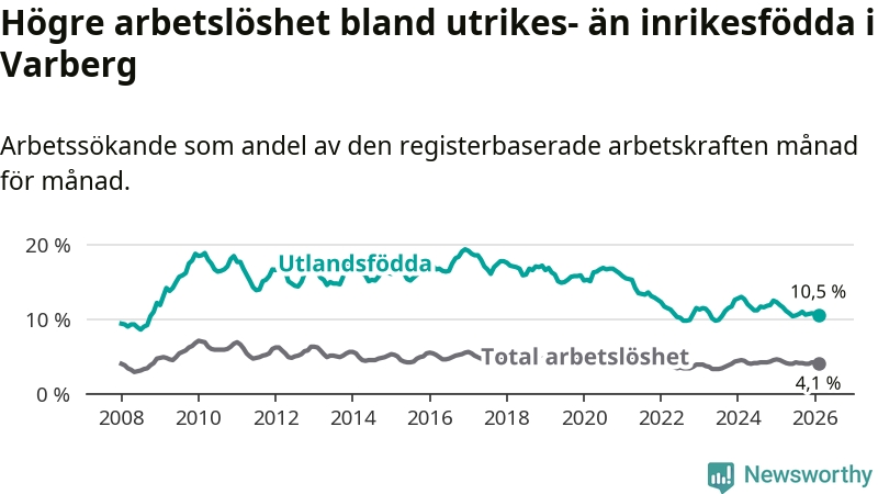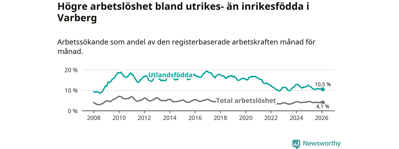 Arbetslösheten bland utlandsfödda var 10,5 procent i Varberg under februari månad, motsvarande 515 av 4 905 personer. Det är 1,4 procentenheter färre än vid samma tidpunkt i fjol (−63 om man räknar personer). Därmed är de utlandsföddas arbetslöshet lägre än vid samma tidpunkt i fjol för 15:e månaden i följd. Sedan november 2024 har arbetslösheten bland utlandsfödda minskat från 11,9 till 10,5 procent.