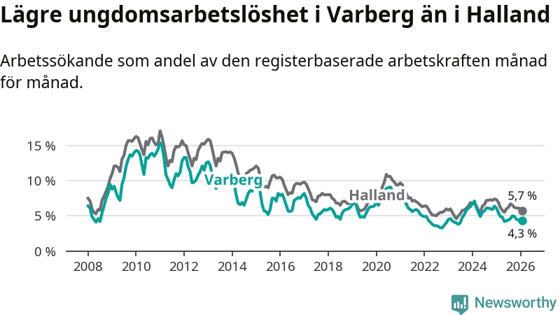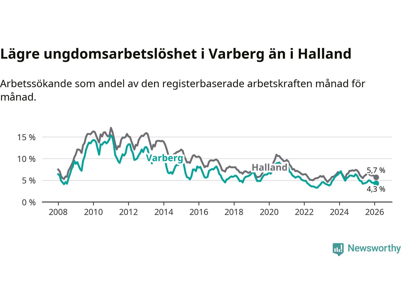 Precis som den totala arbetslösheten ligger ungdomsarbetslösheten i Varberg lägre än i Halland som helhet. Skillnaden mellan kommunen och länet är 1,4 procentenheter.