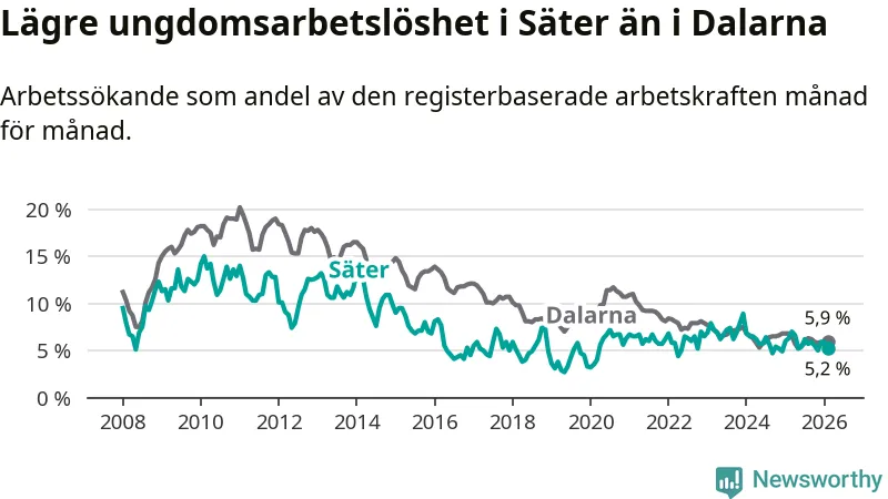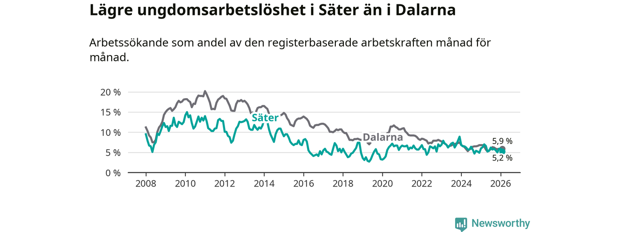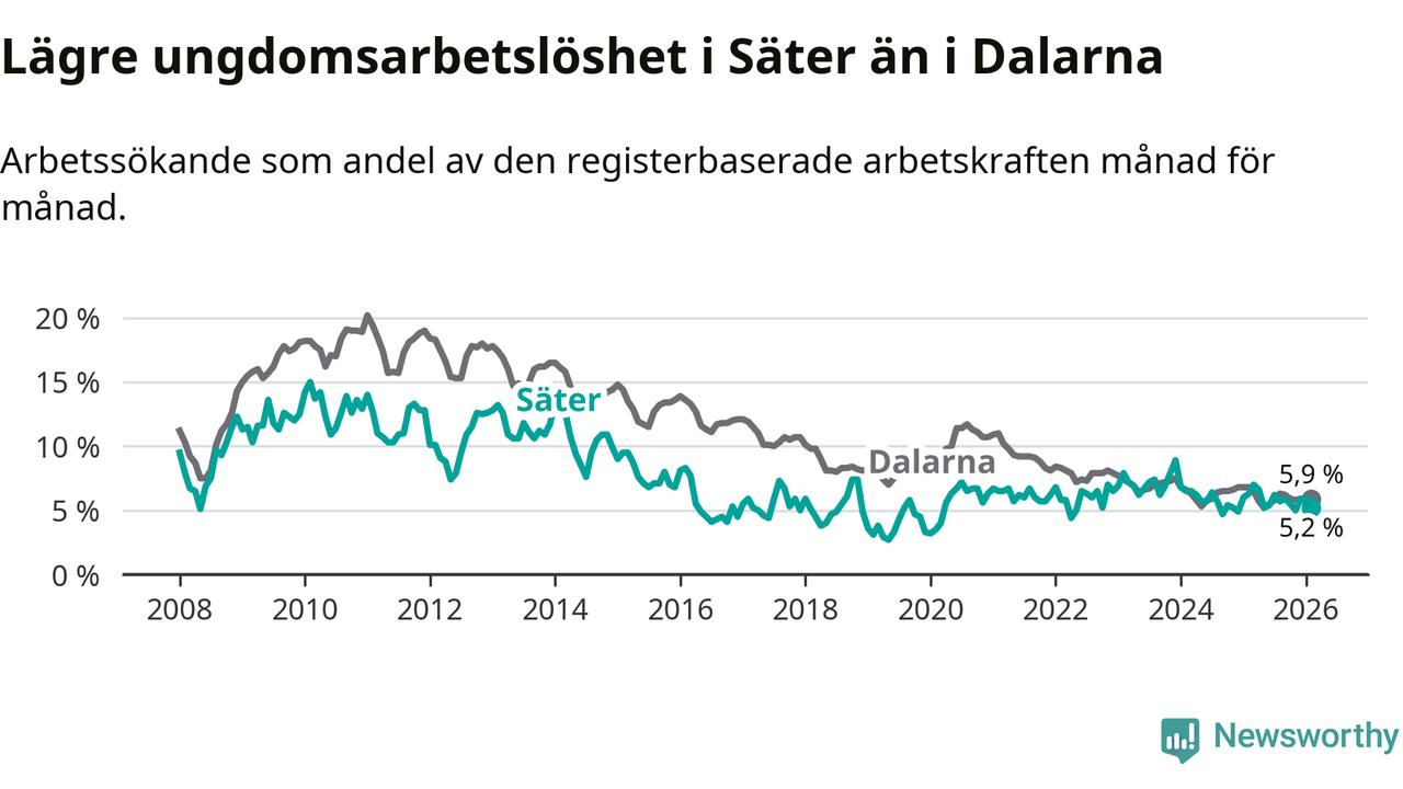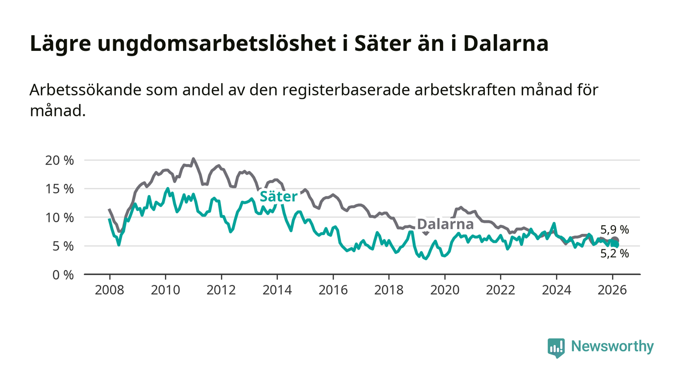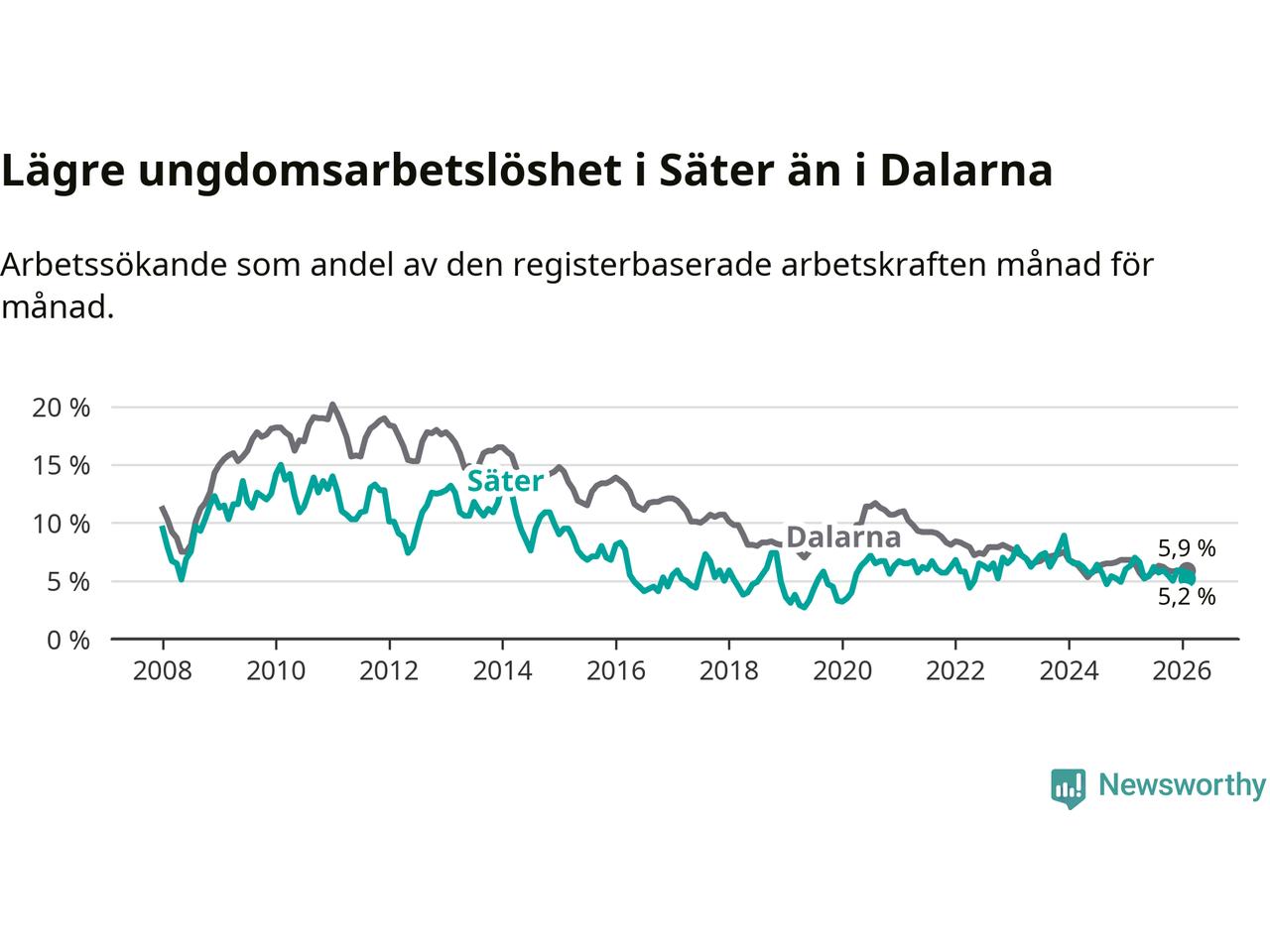 Precis som den totala arbetslösheten ligger ungdomsarbetslösheten i Säter lägre än i Dalarna som helhet. Skillnaden mellan kommunen och länet är 0,7 procentenheter.