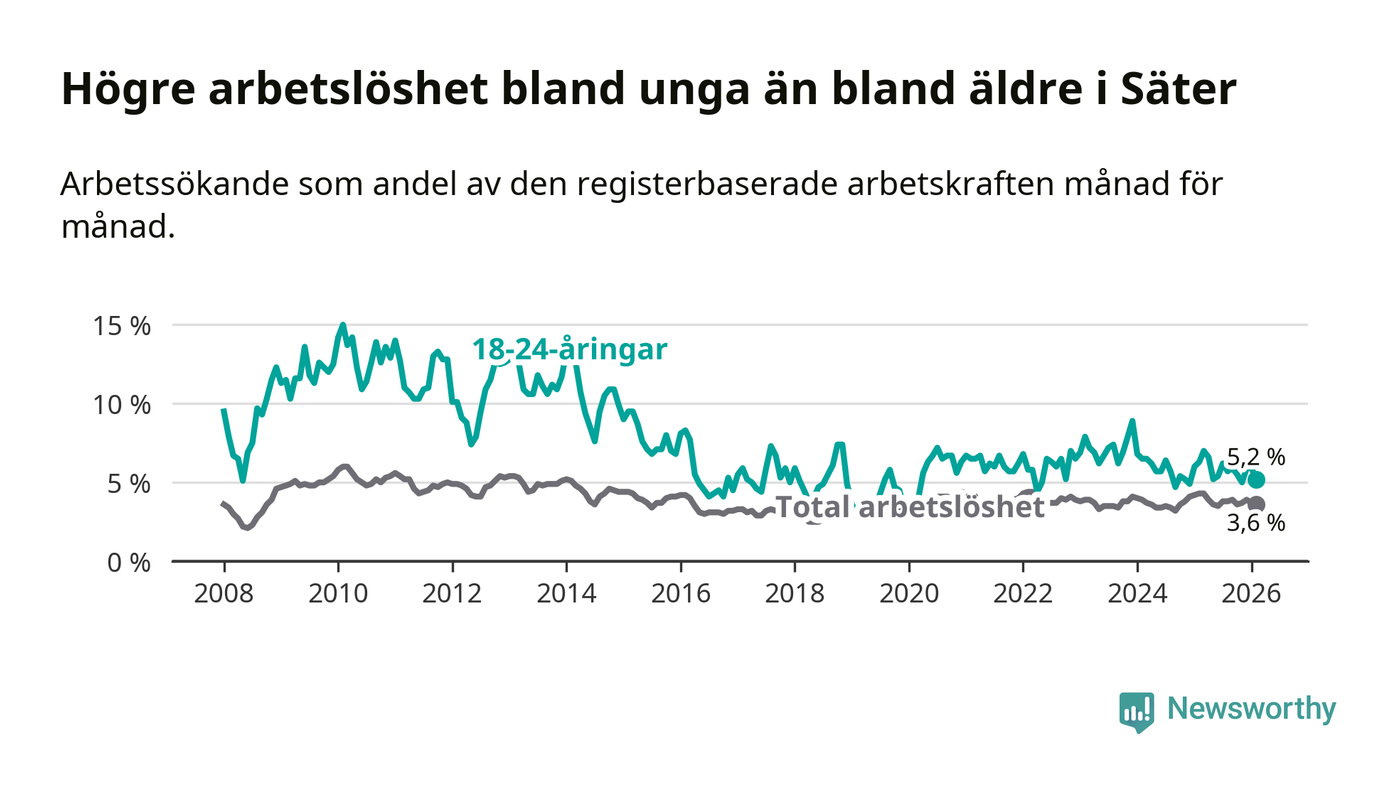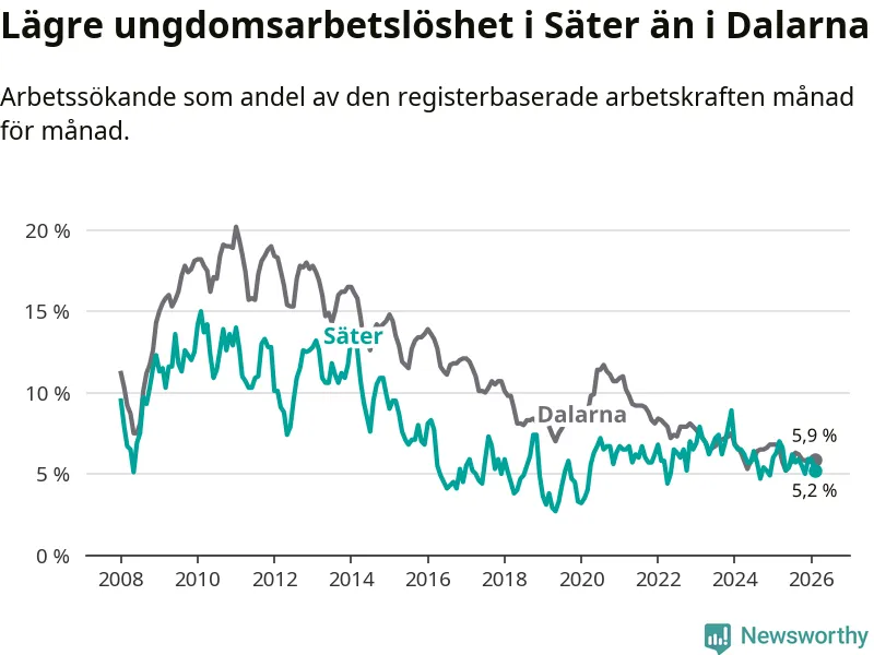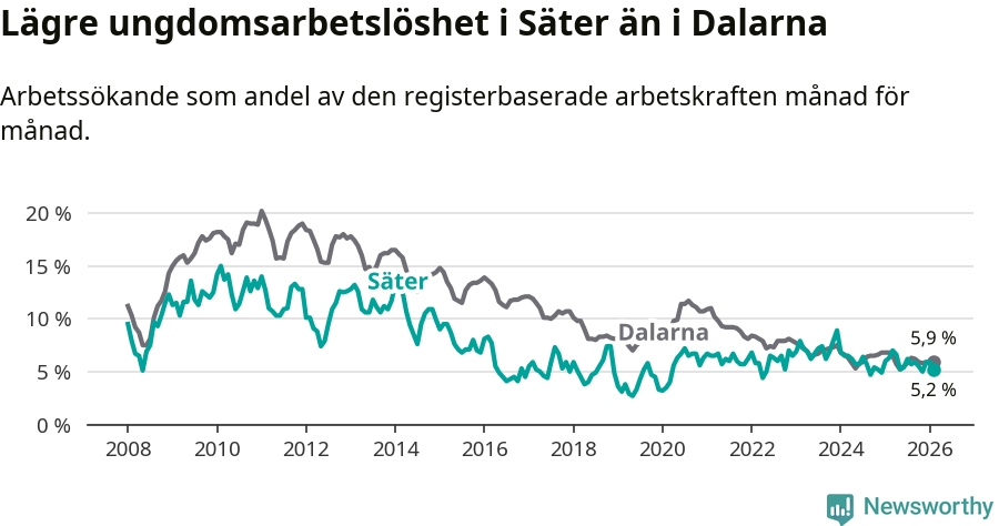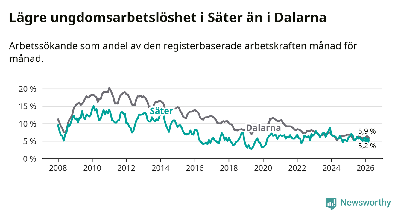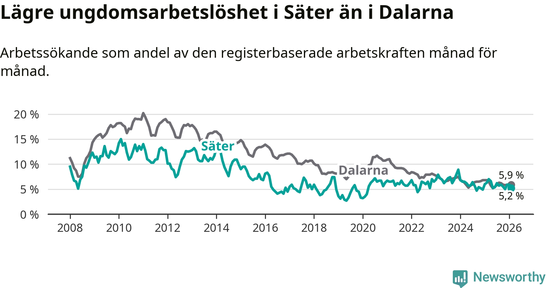 Precis som den totala arbetslösheten ligger ungdomsarbetslösheten i Säter lägre än i Dalarna som helhet. Skillnaden mellan kommunen och länet är 0,7 procentenheter.