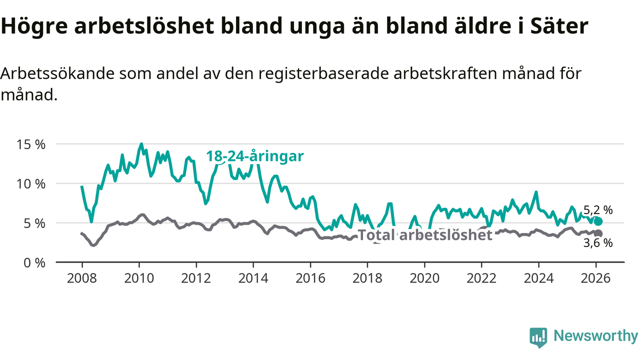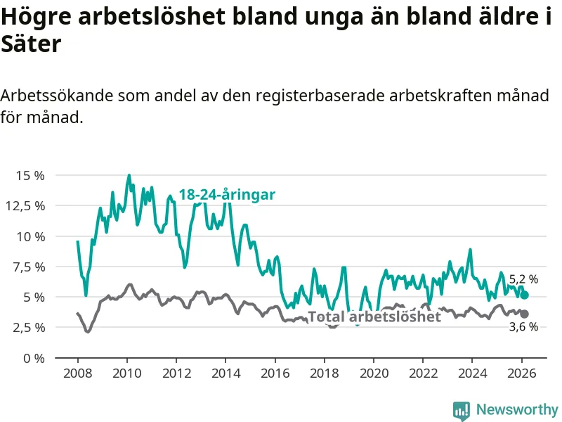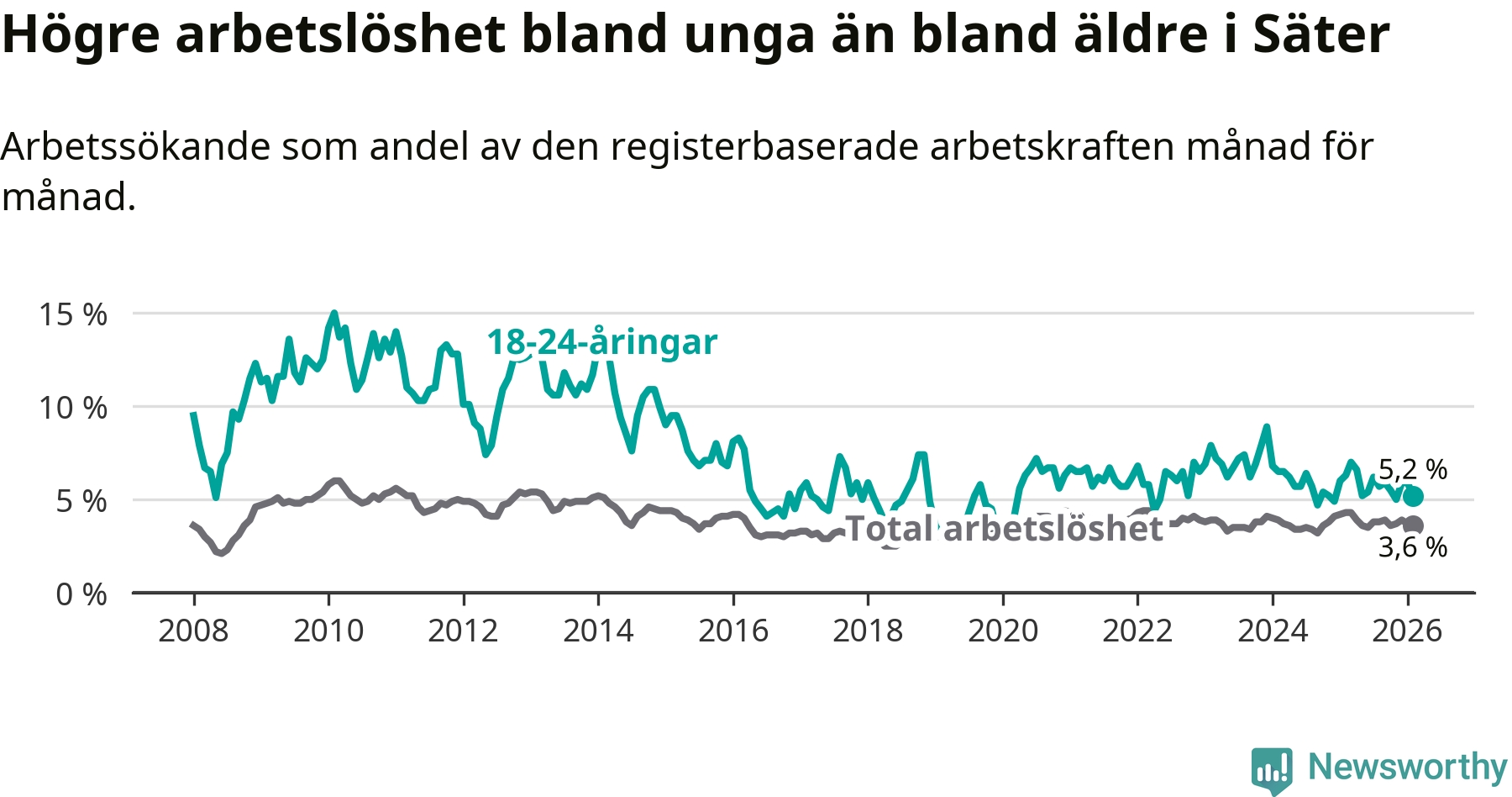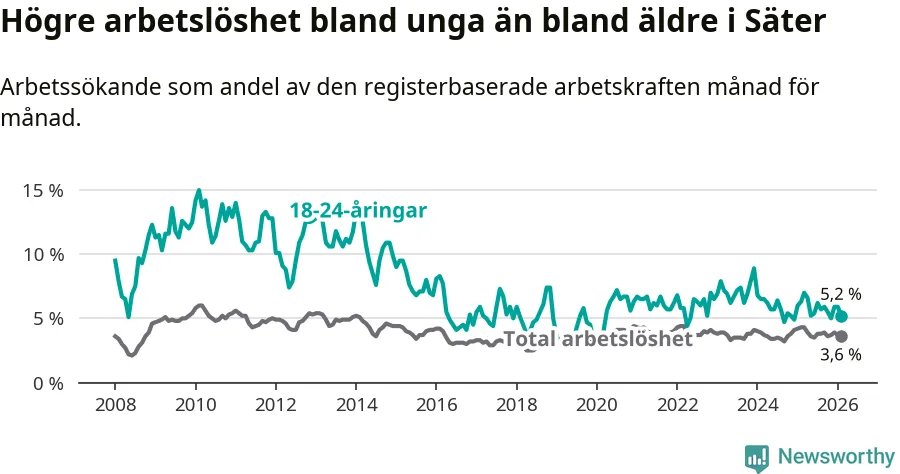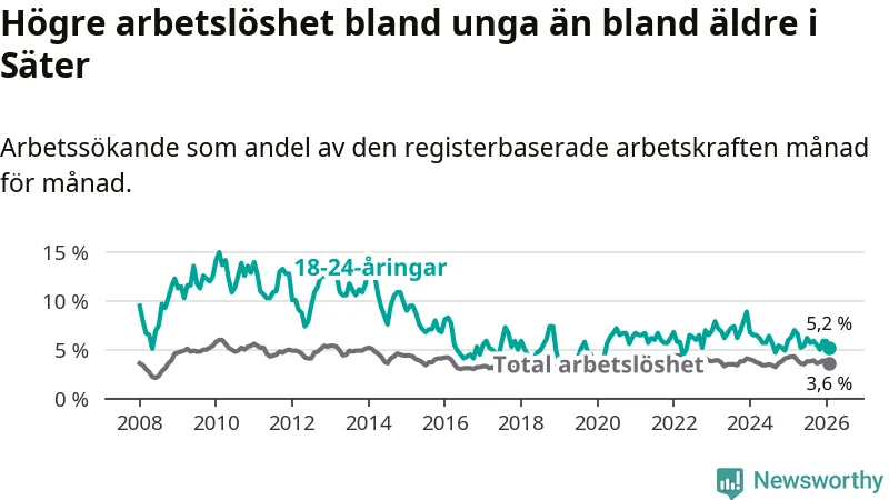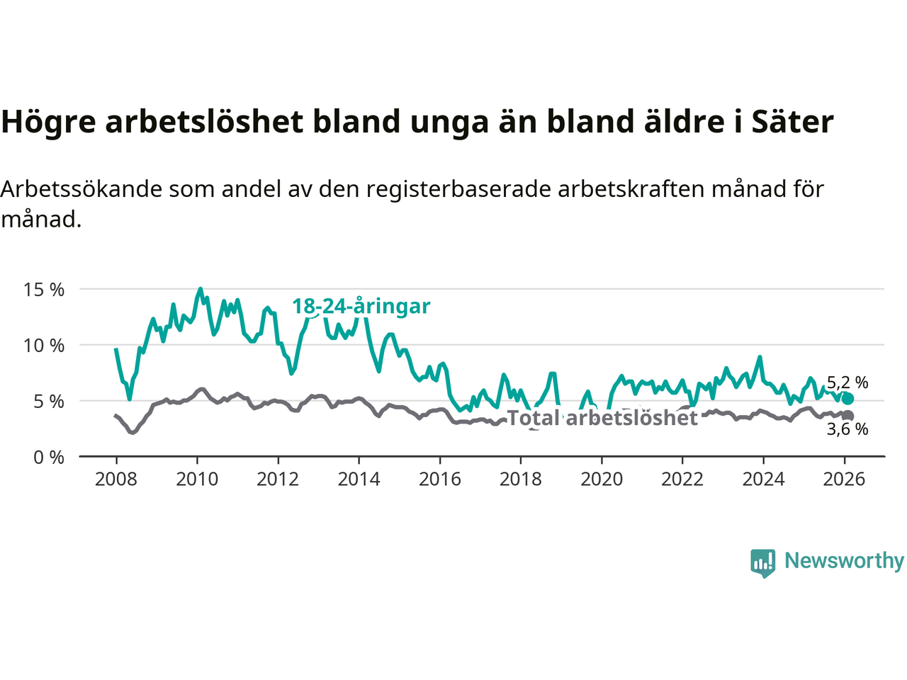 Precis som den totala arbetslösheten ligger ungdomsarbetslösheten i Säter lägre än i Dalarna som helhet. Skillnaden mellan kommunen och länet är 0,7 procentenheter.