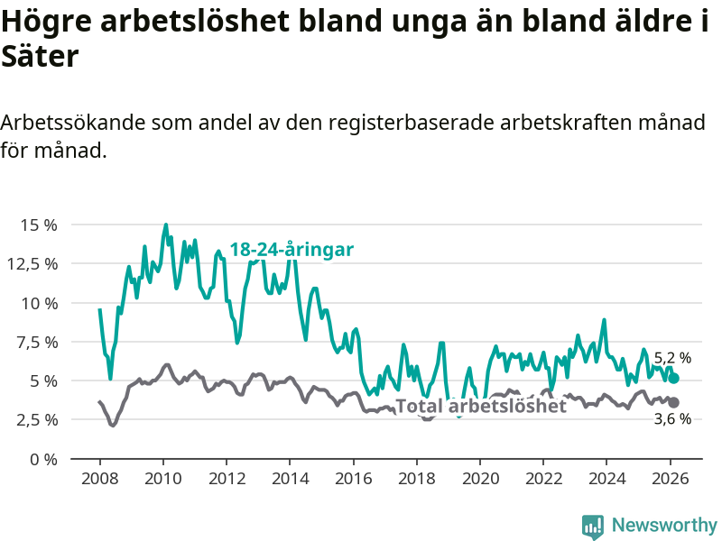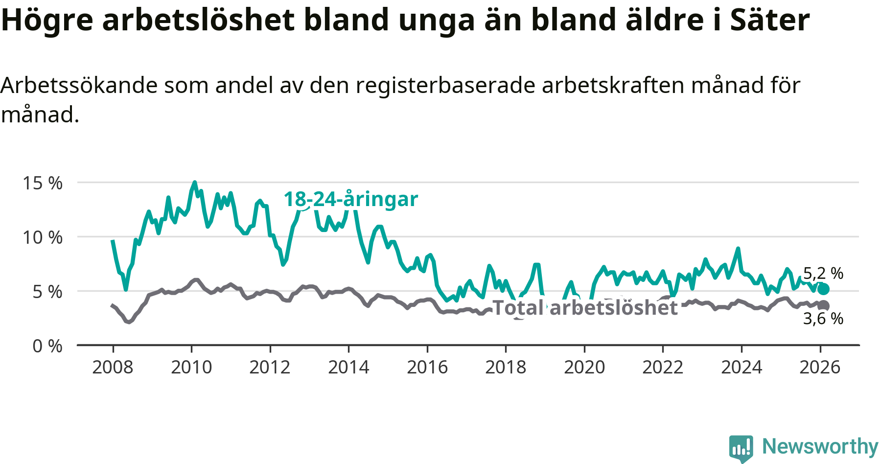 Precis som den totala arbetslösheten sjunker arbetslösheten bland unga (−1,1 procentenheter). I februari var 5,2 procent av 18–24-åringarna inskrivna som arbetssökande (motsvarande 22 personer). Mäter vi antalet inskrivna ser vi en minskning med fem personer på ett års sikt.