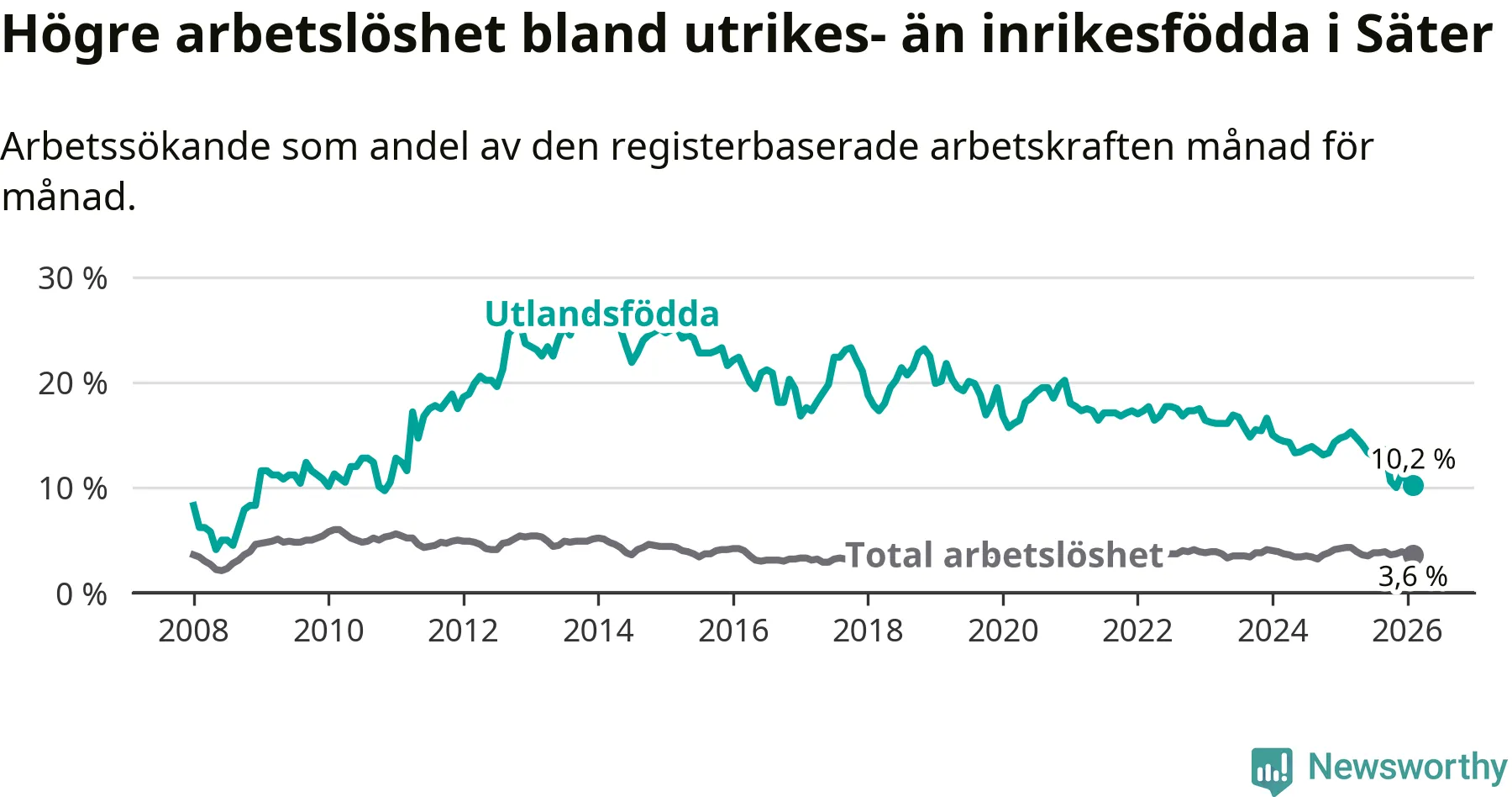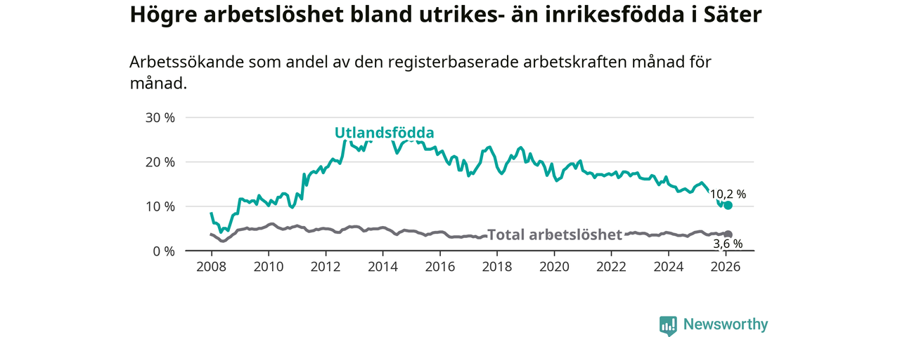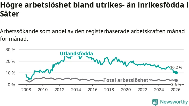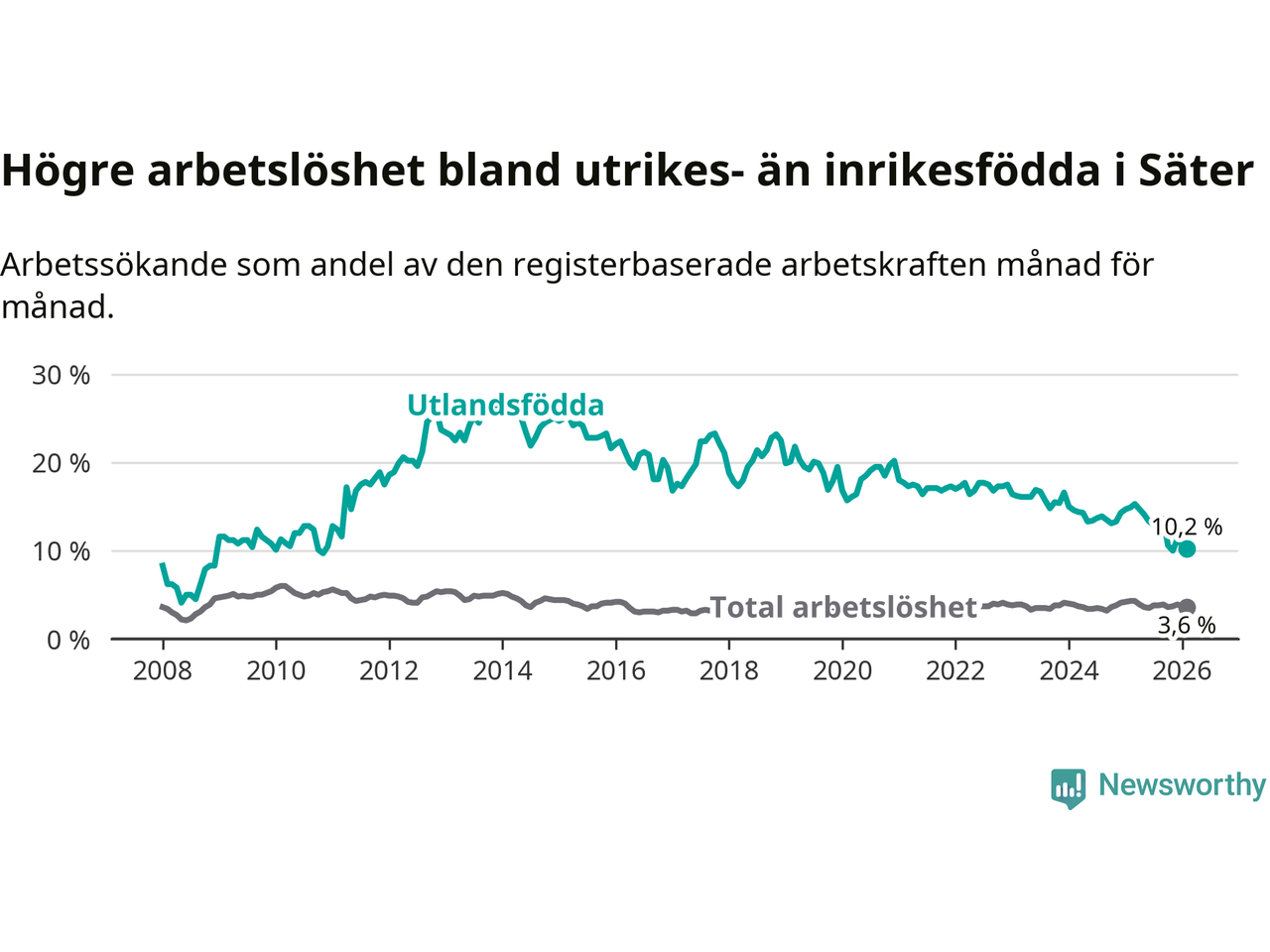 Arbetslösheten bland utlandsfödda var 10,2 procent i Säter under februari månad, motsvarande 53 av 520 personer. Det är 4,7 procentenheter färre än vid samma tidpunkt i fjol (−22 om man räknar personer).
