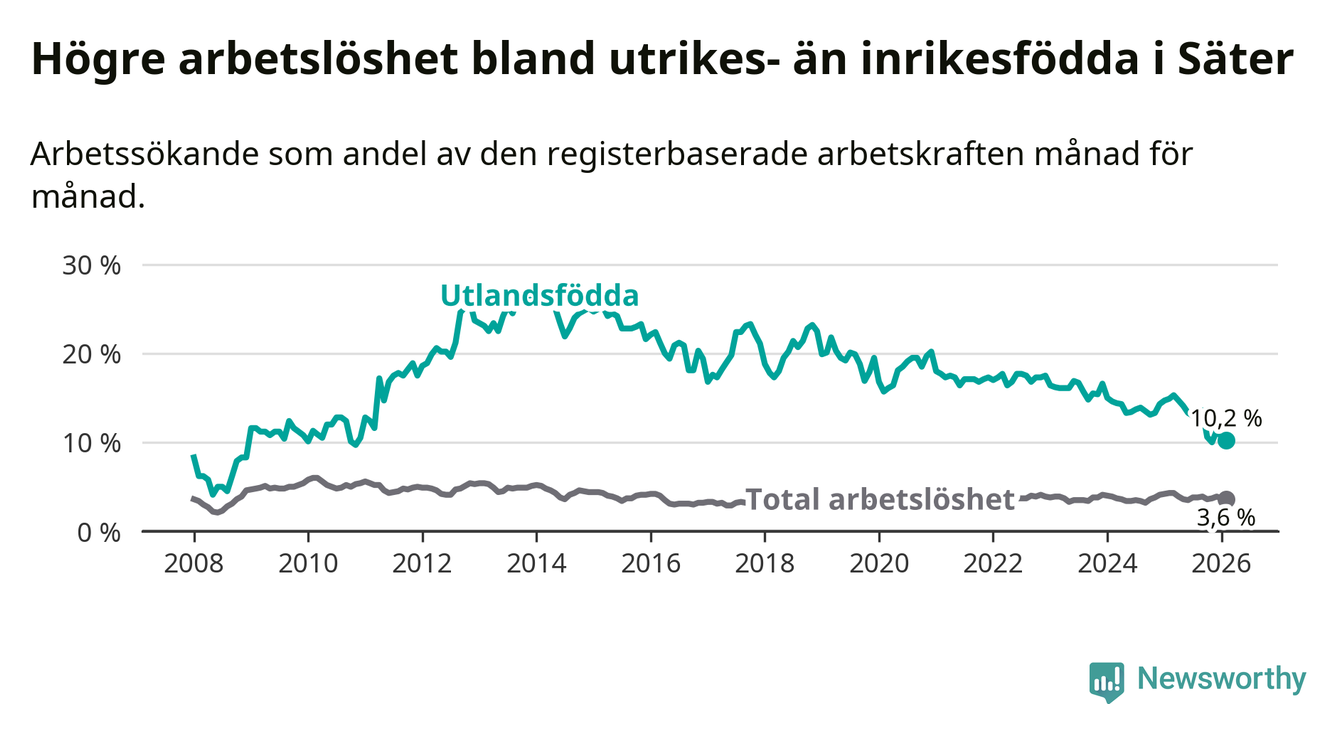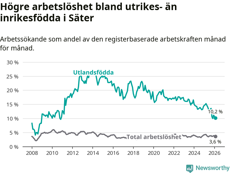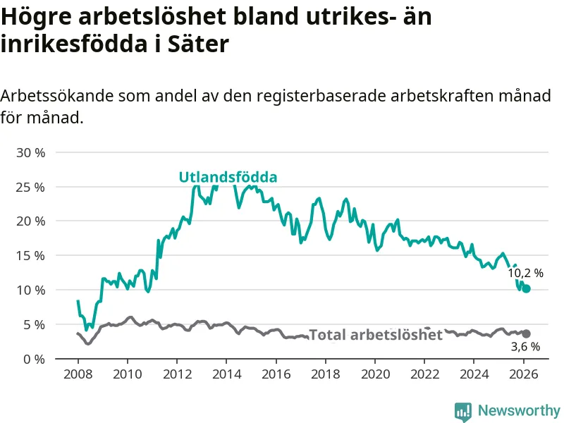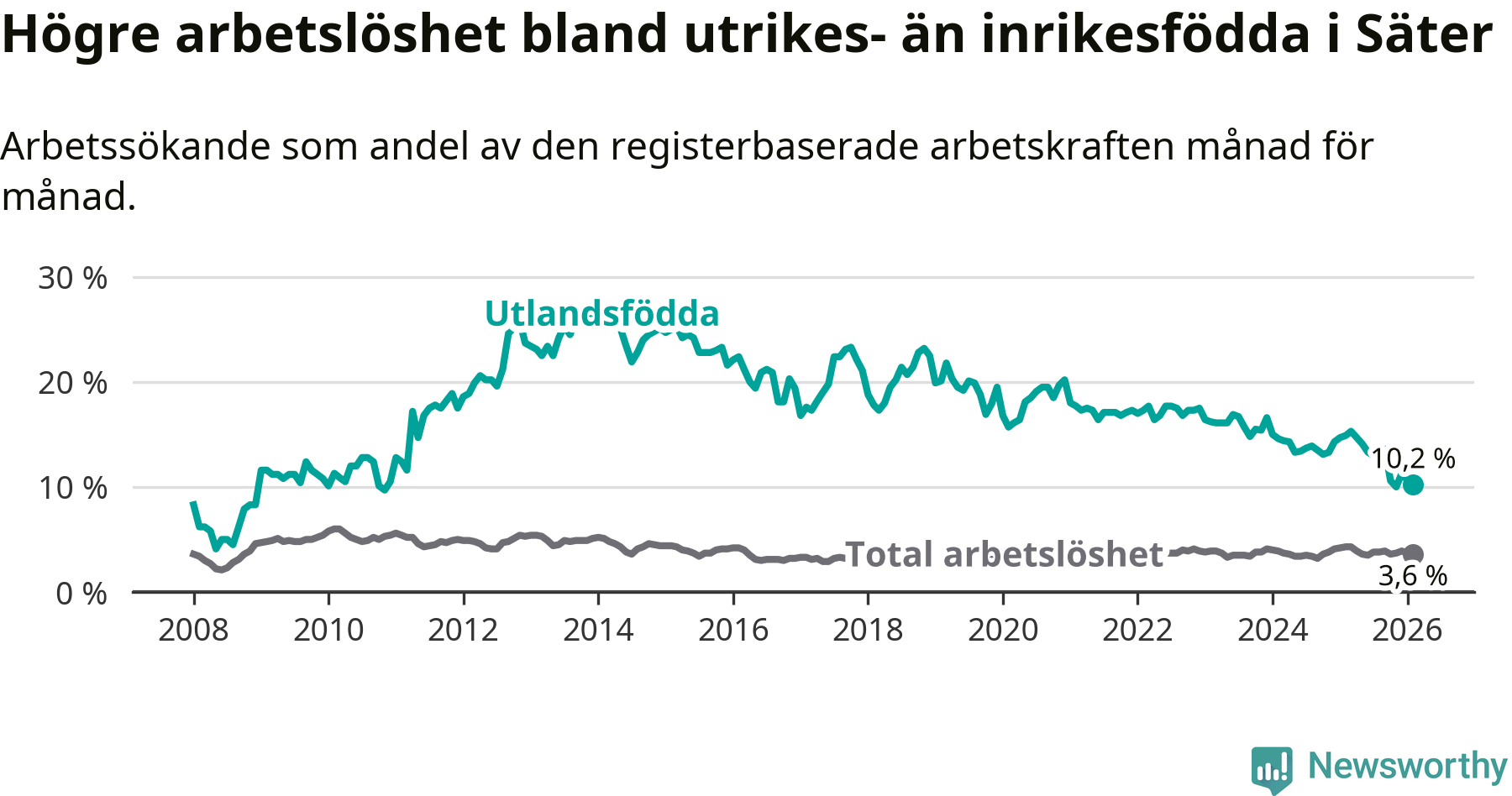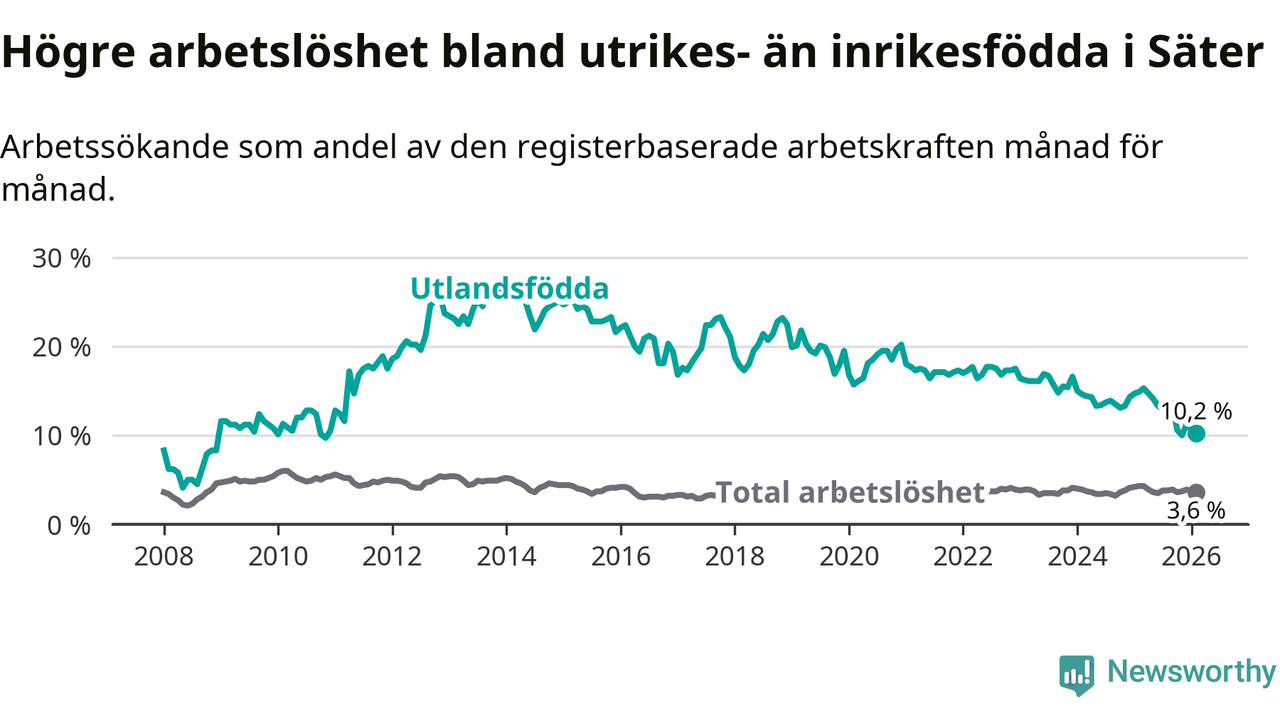 Arbetslösheten bland utlandsfödda var 10,2 procent i Säter under februari månad, motsvarande 53 av 520 personer. Det är 4,7 procentenheter färre än vid samma tidpunkt i fjol (−22 om man räknar personer).