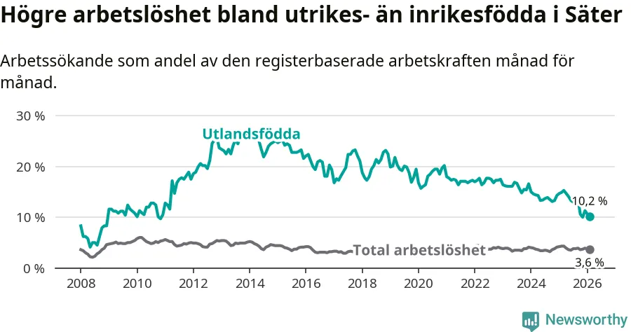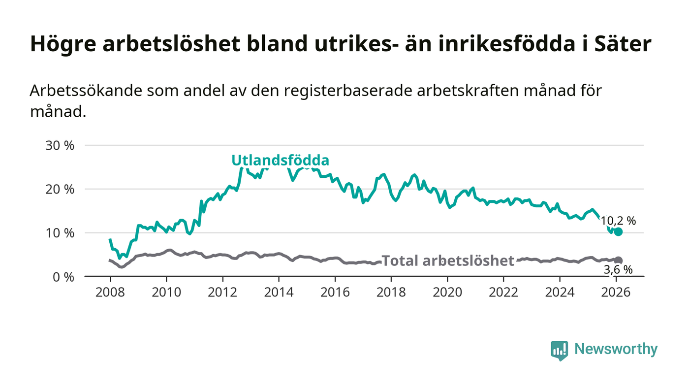 Skillnaden i arbetslöshet mellan utrikesfödda och hela befolkningen är 6,6 procentenheter i Säter. Det är en betydligt mindre skillnad än för ett år sedan (−4,0 procentenheter).