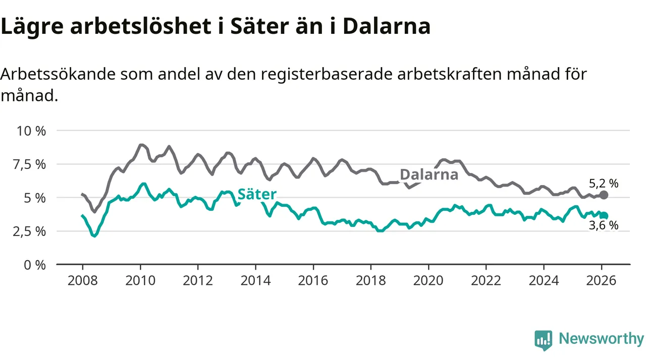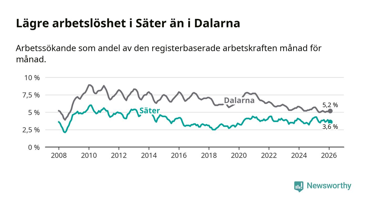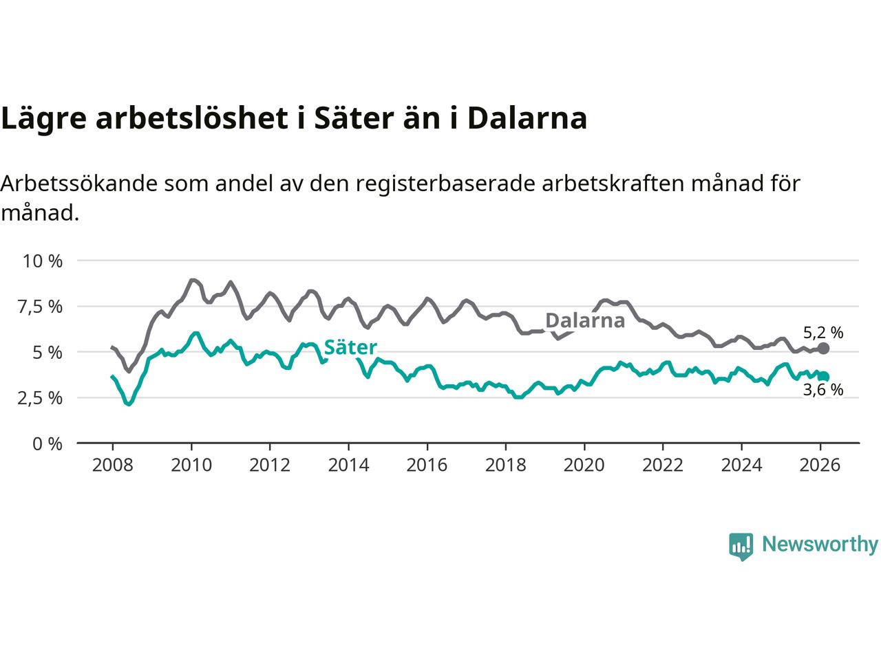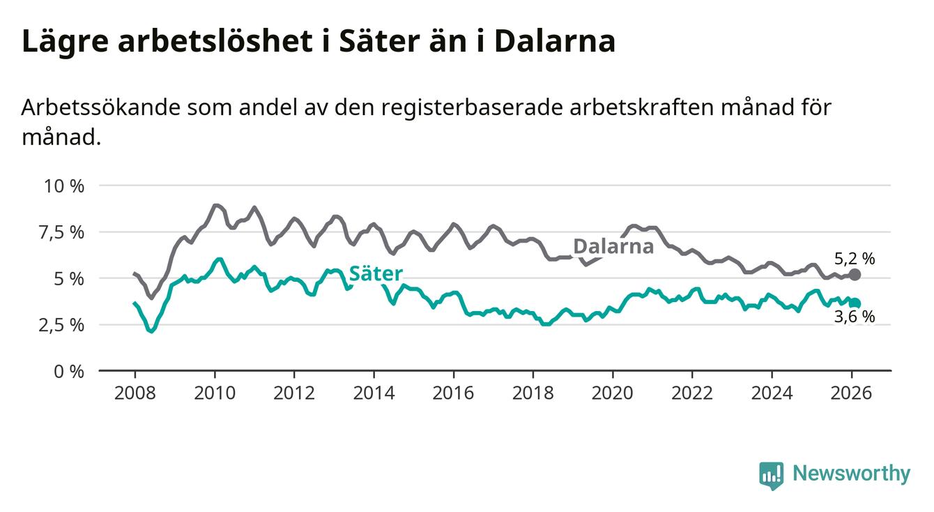 Säter hade redan tidigare lägre arbetslöshet än snittet i hela Dalarnas län och nu växer klyftan (3,6 procent i kommunen, jämfört med 5,2 procent i hela länet). Mora har den lägsta arbetslösheten i länet (3,5 procent), medan Avesta har den högsta (7,5 procent).