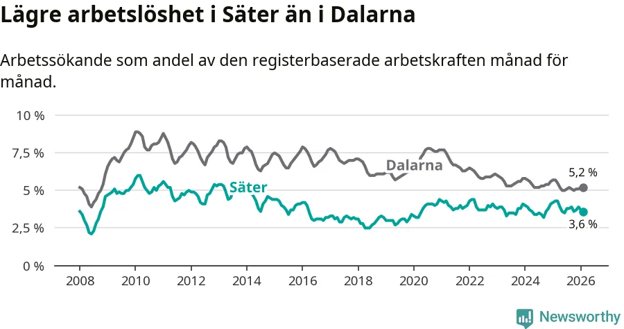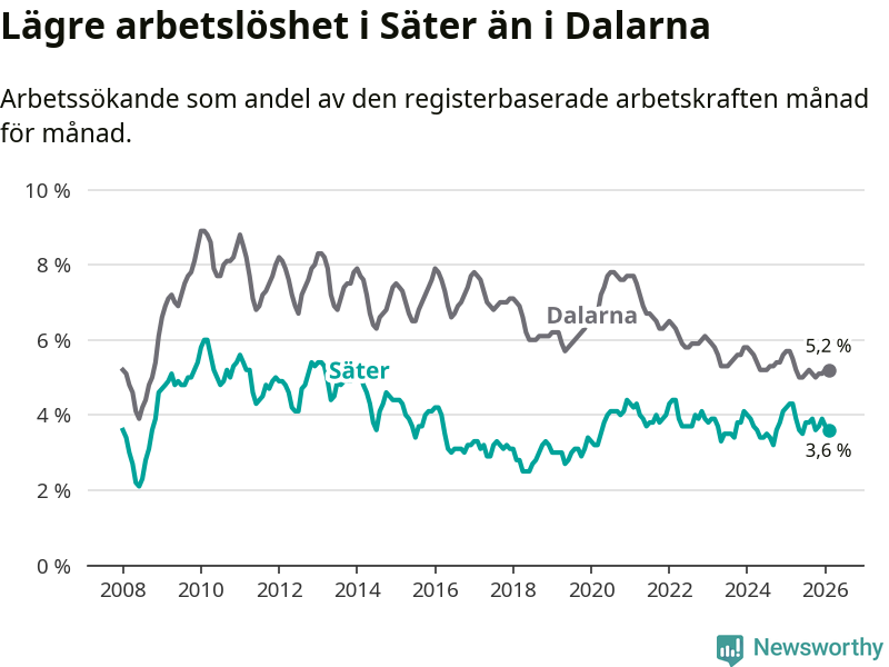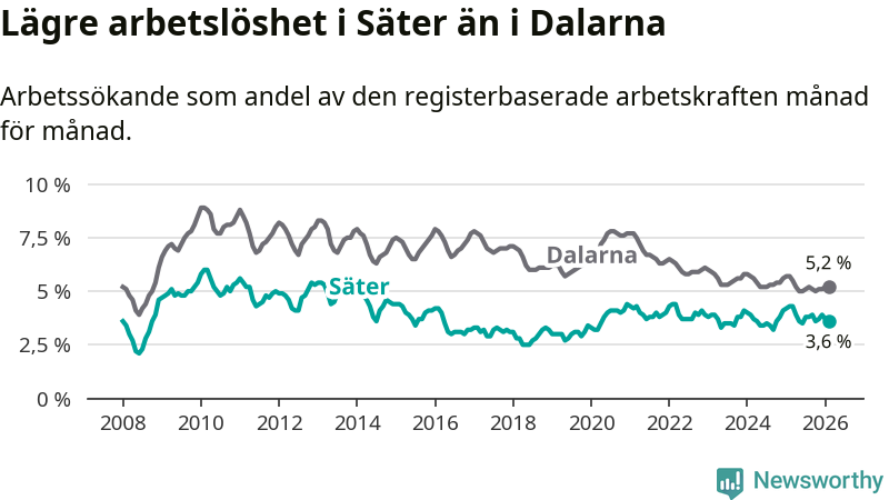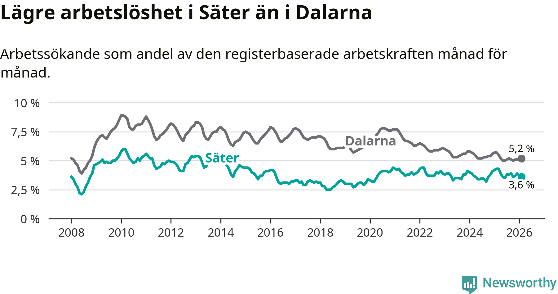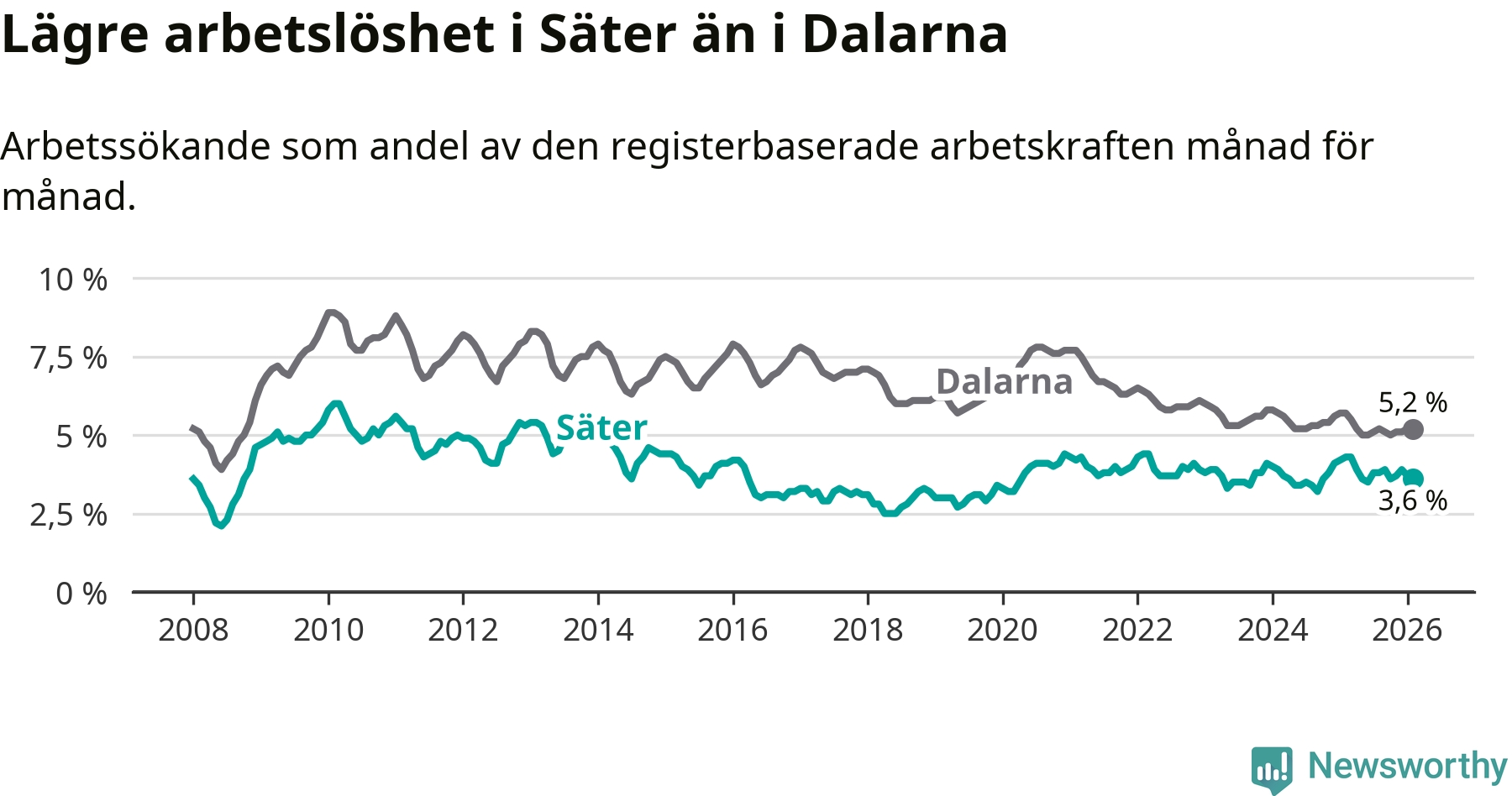 Säter hade redan tidigare lägre arbetslöshet än snittet i hela Dalarnas län och nu växer klyftan (3,6 procent i kommunen, jämfört med 5,2 procent i hela länet). Mora har den lägsta arbetslösheten i länet (3,5 procent), medan Avesta har den högsta (7,5 procent).
