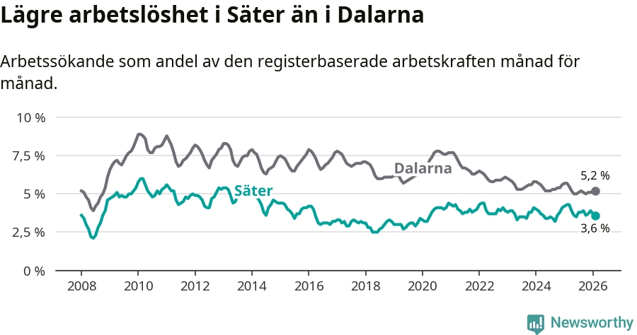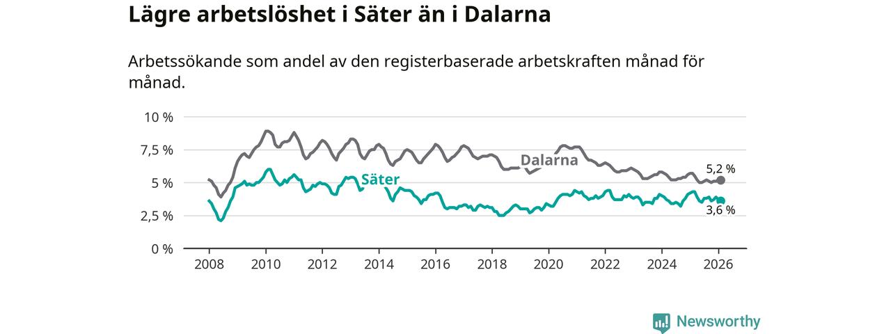 Under februari månad rapporterade Säters kommun en total arbetslöshet på 3,6 procent. Det är en minskning jämfört med samma tidpunkt i fjol (−0,7 procentenheter). Även i Dalarnas län sjunker arbetslösheten .