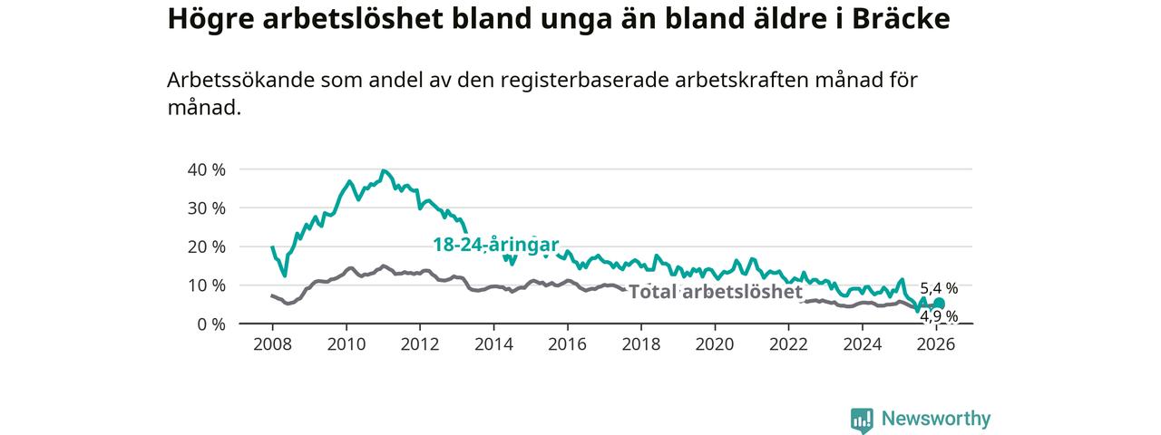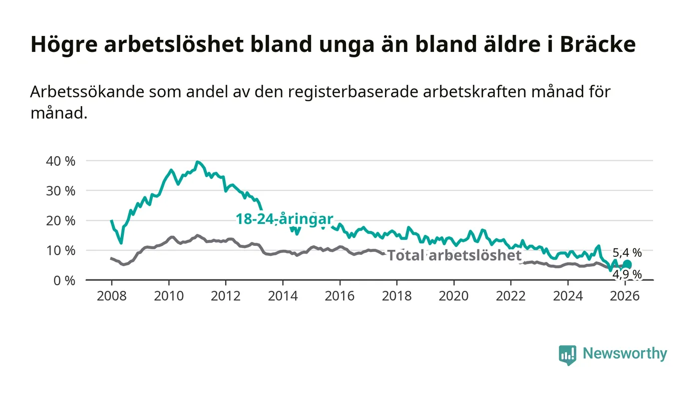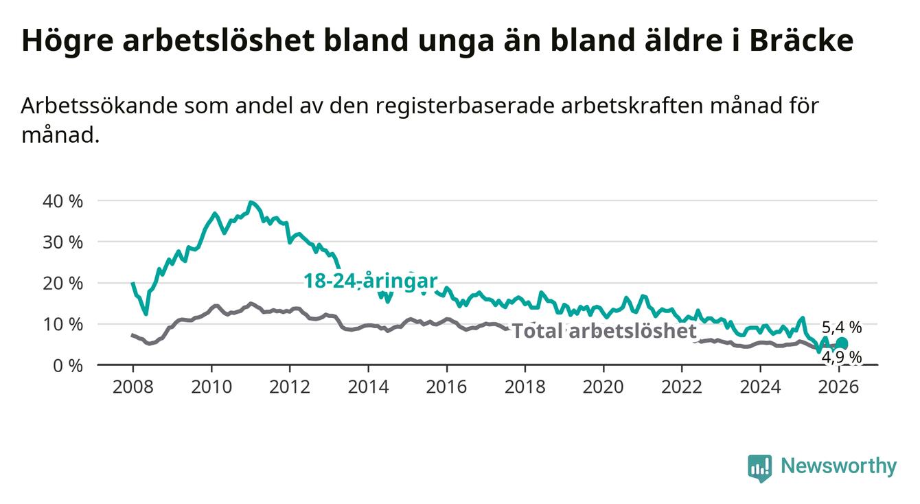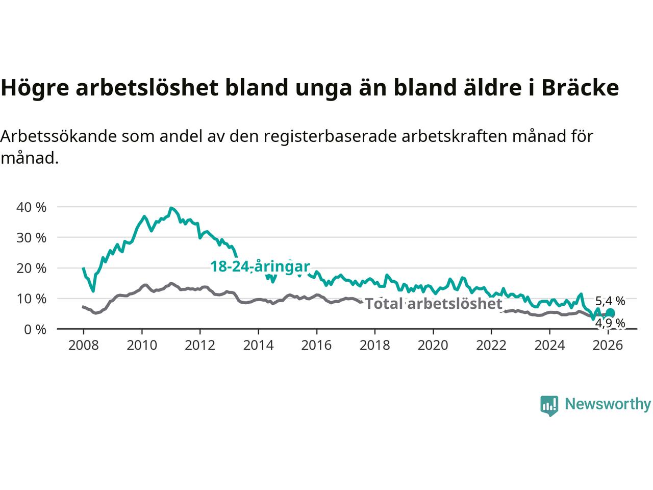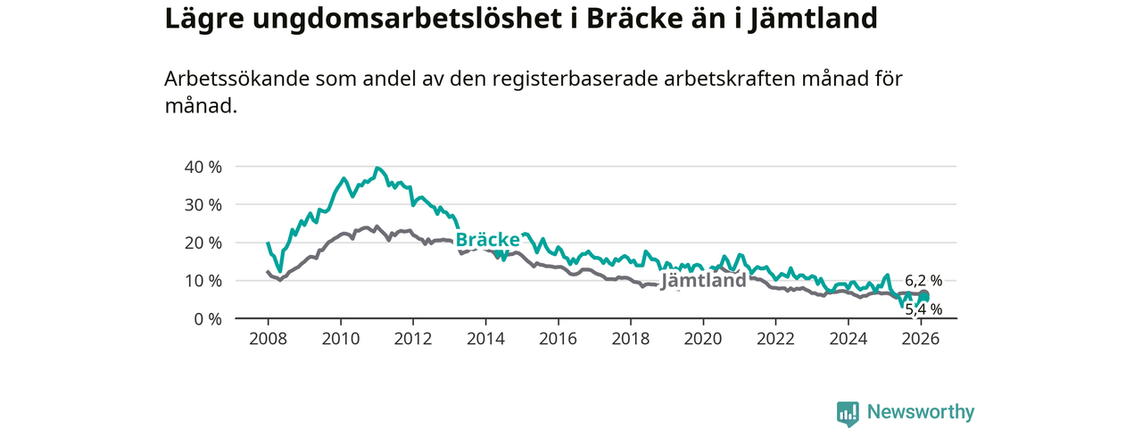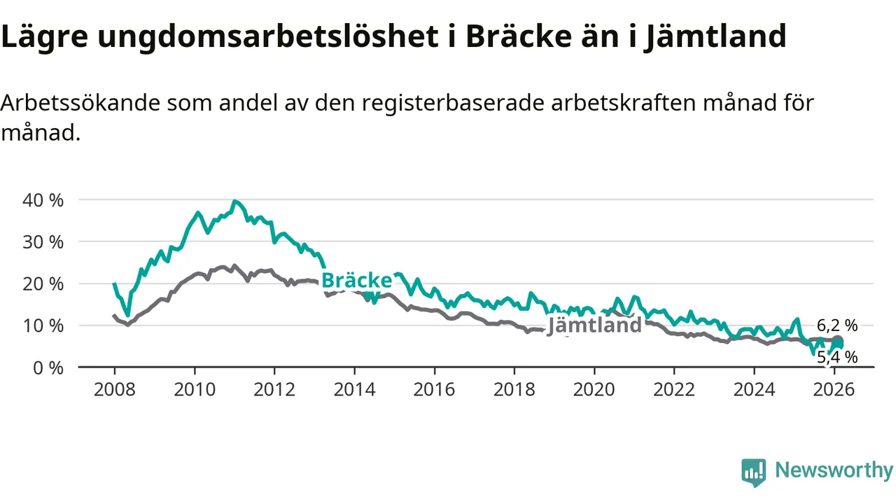 I och med den senaste månadens nedgång har de ungas arbetslöshet i Bräcke sjunkit tolv månader i följd (ner från 11,4 procent i februari 2025 till 5,4 procent nu).