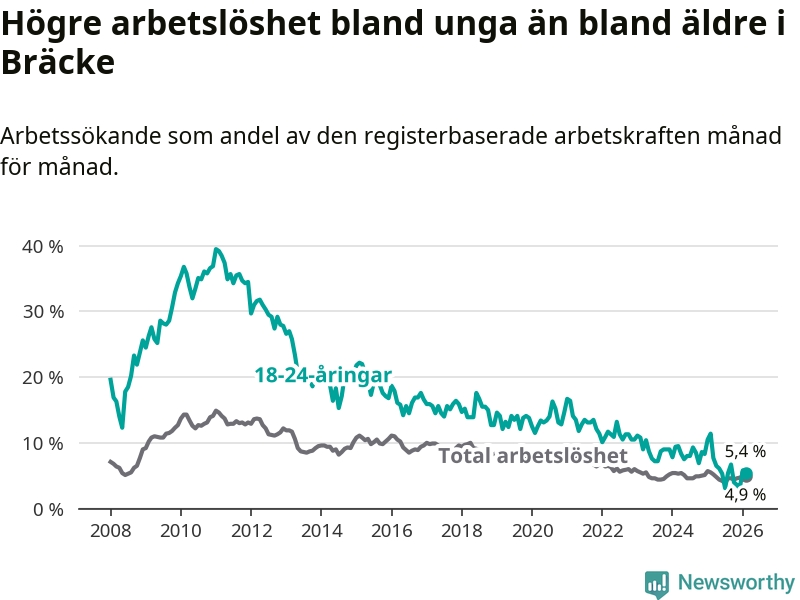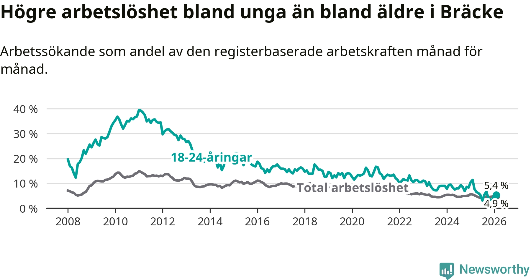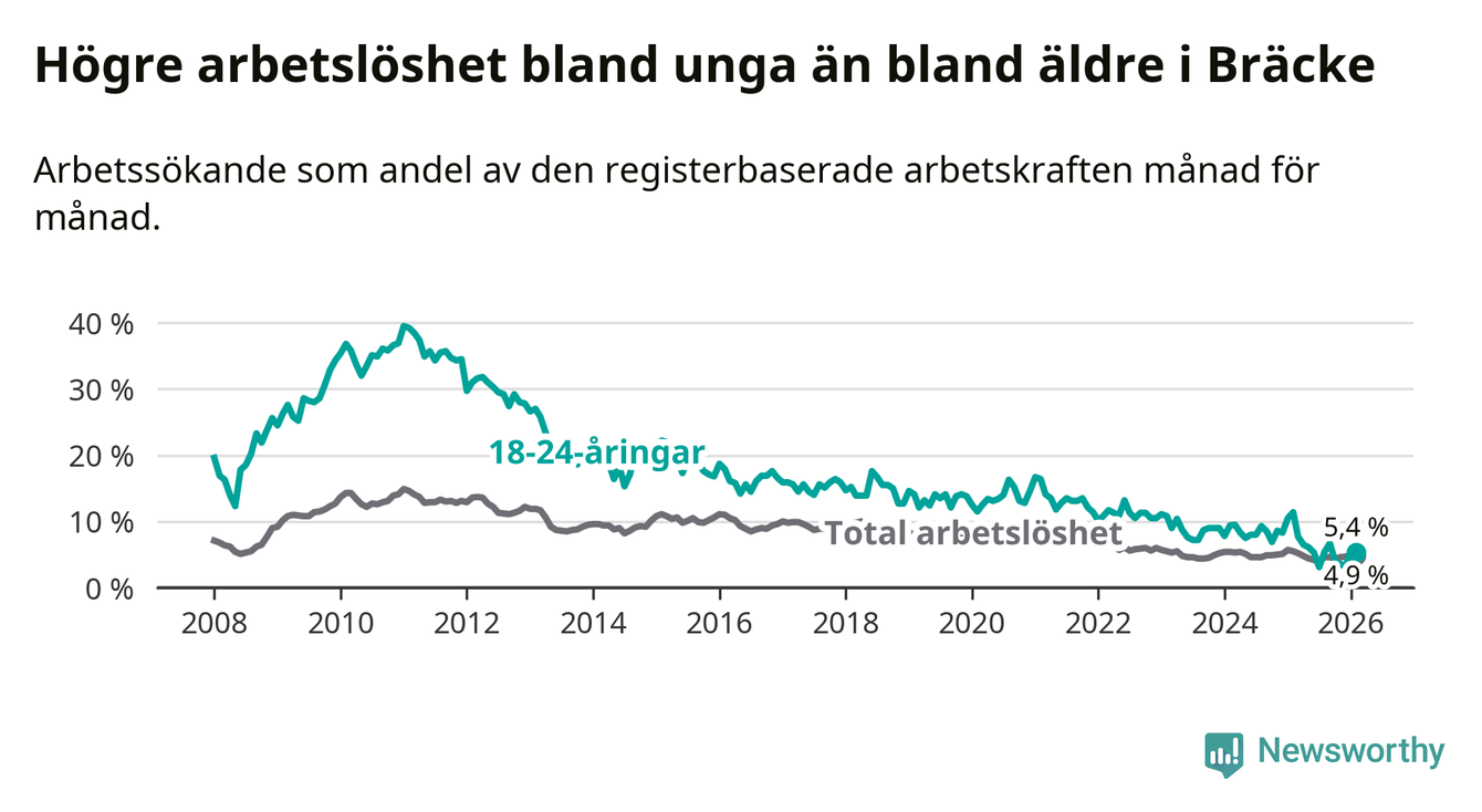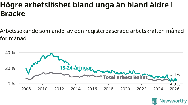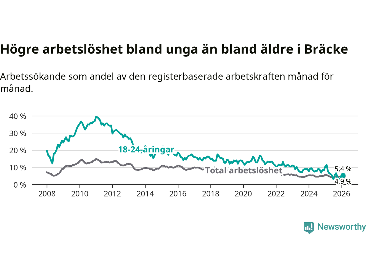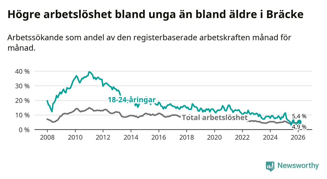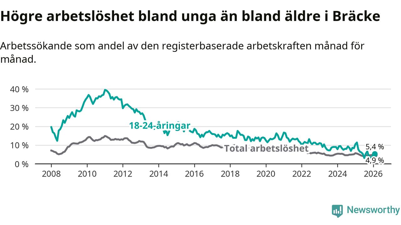 I och med den senaste månadens nedgång har de ungas arbetslöshet i Bräcke sjunkit tolv månader i följd (ner från 11,4 procent i februari 2025 till 5,4 procent nu).