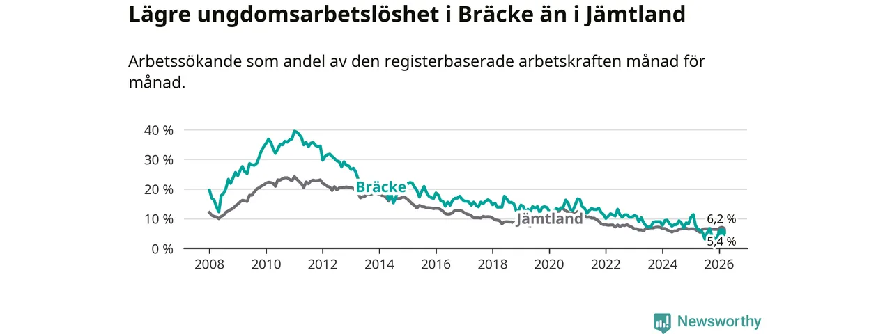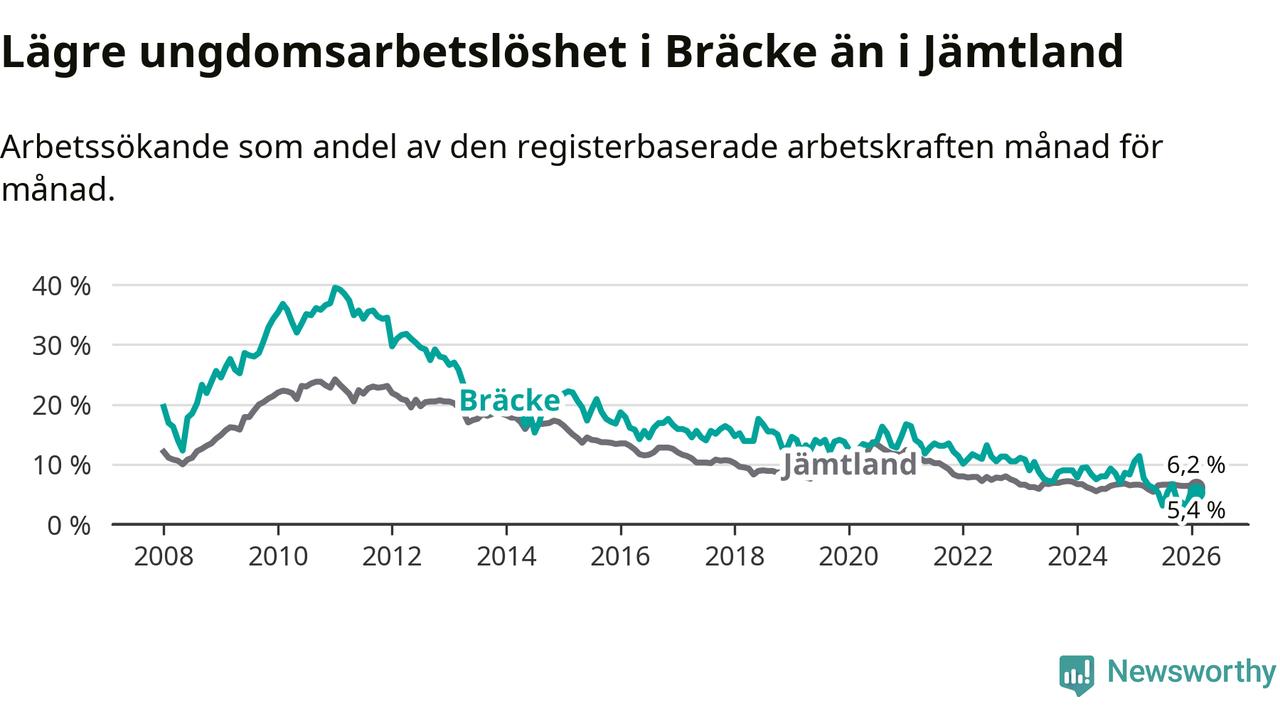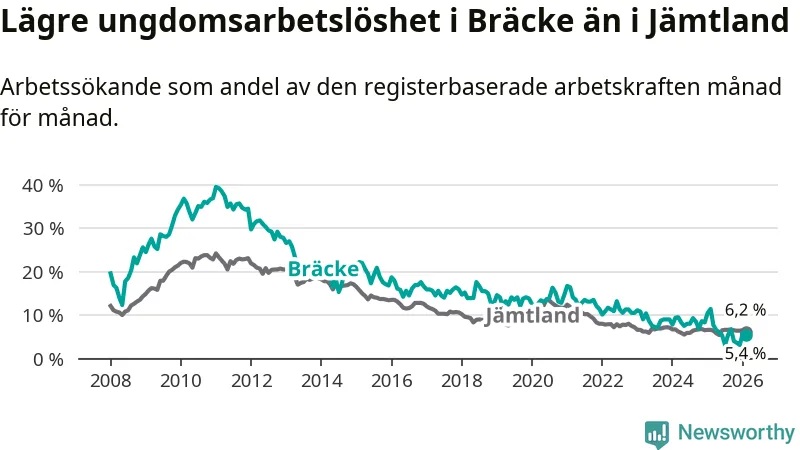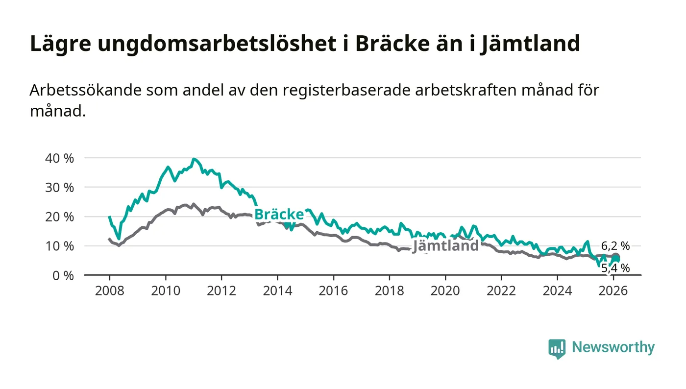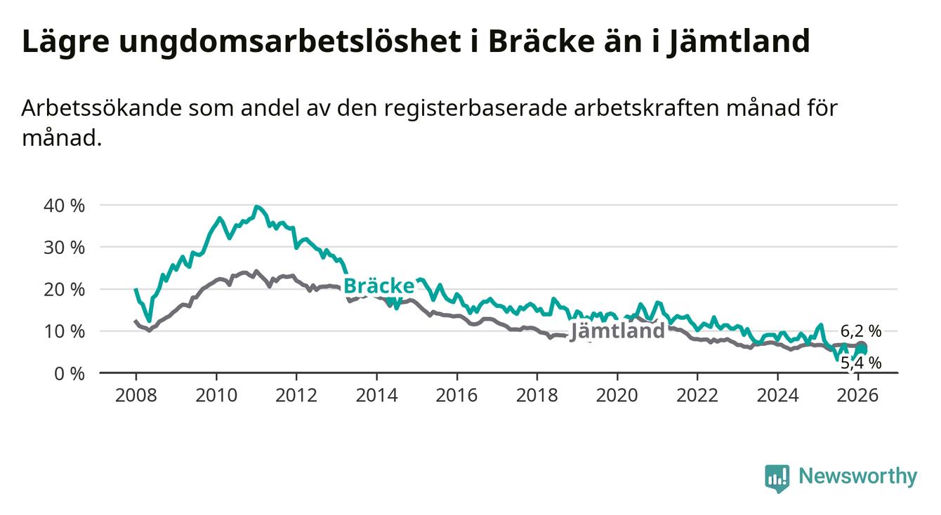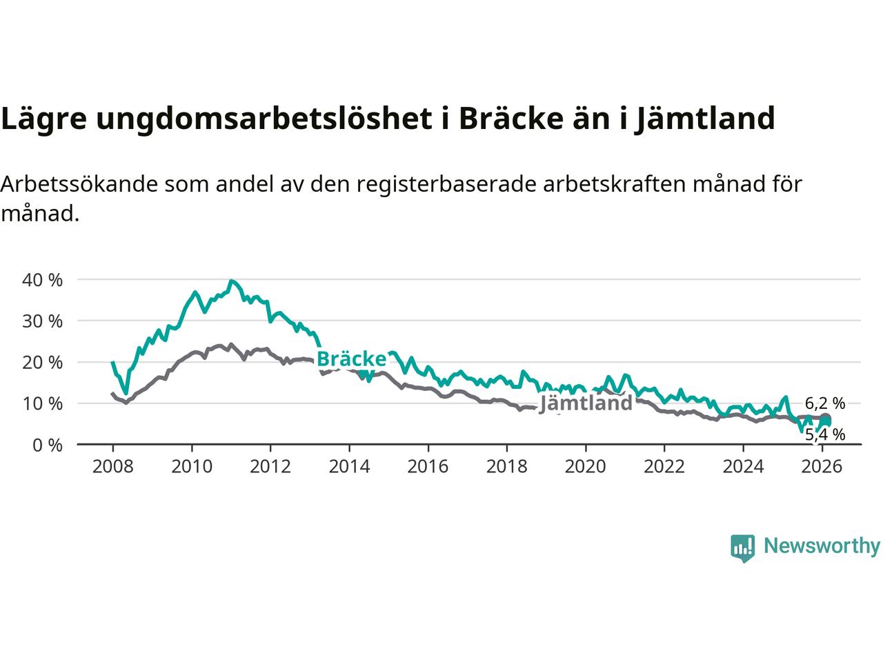 Medan Bräcke har högre total arbetslöshet än Jämtland, ligger ungdomsarbetslösheten 0,8 procentenheter lägre i Bräcke.