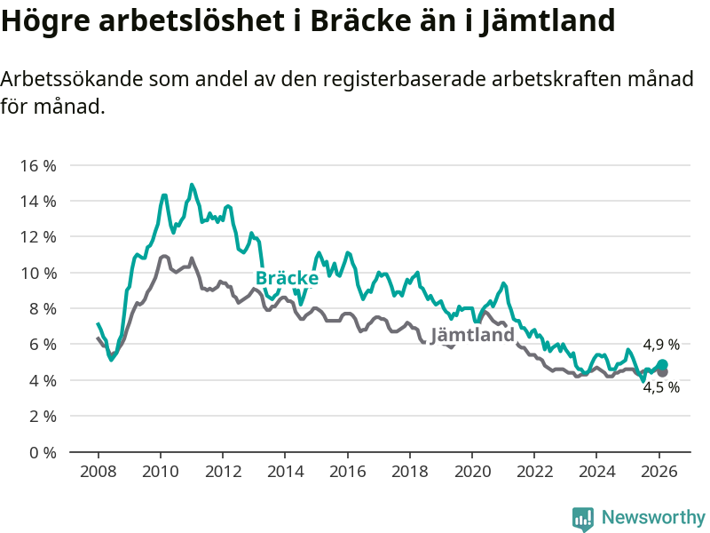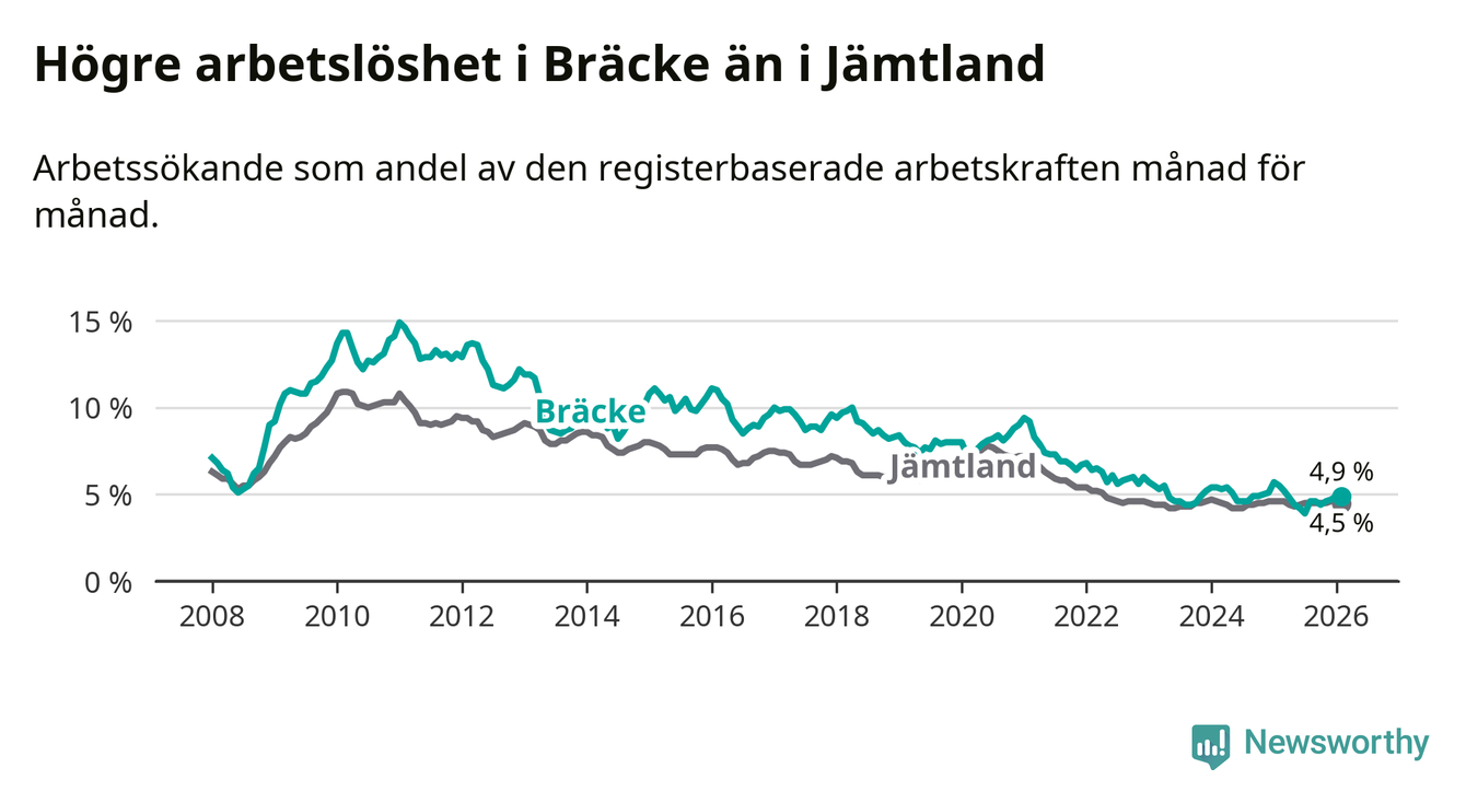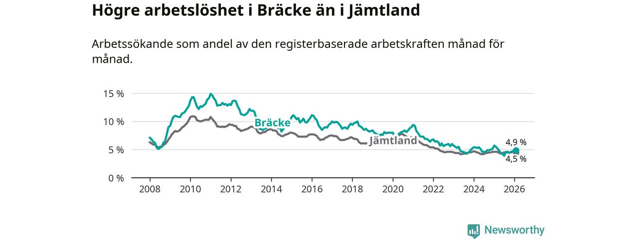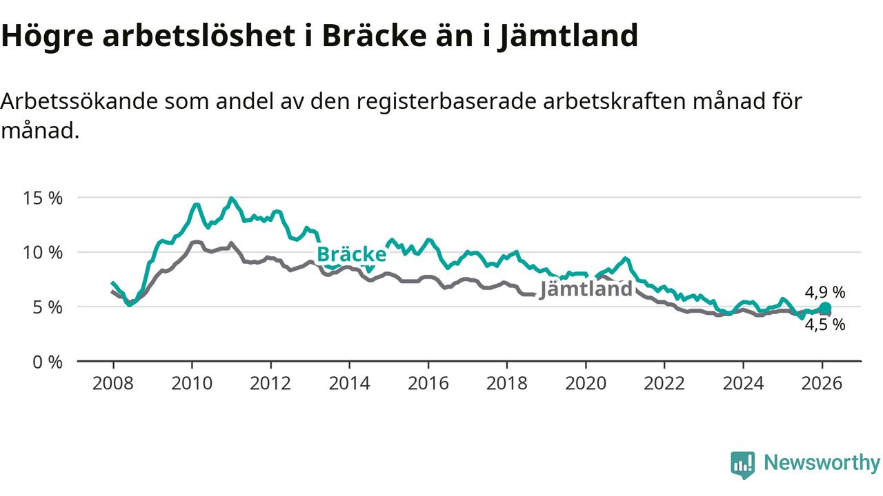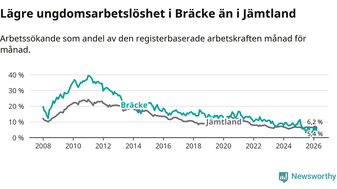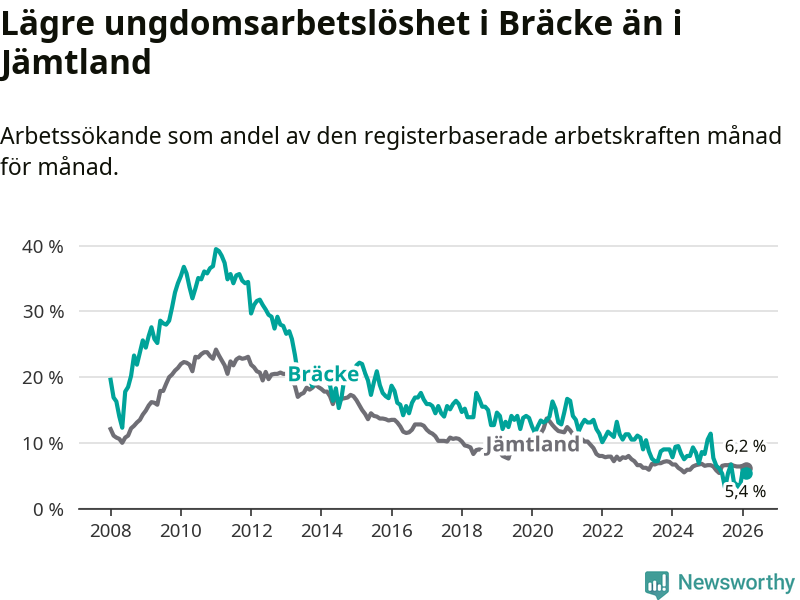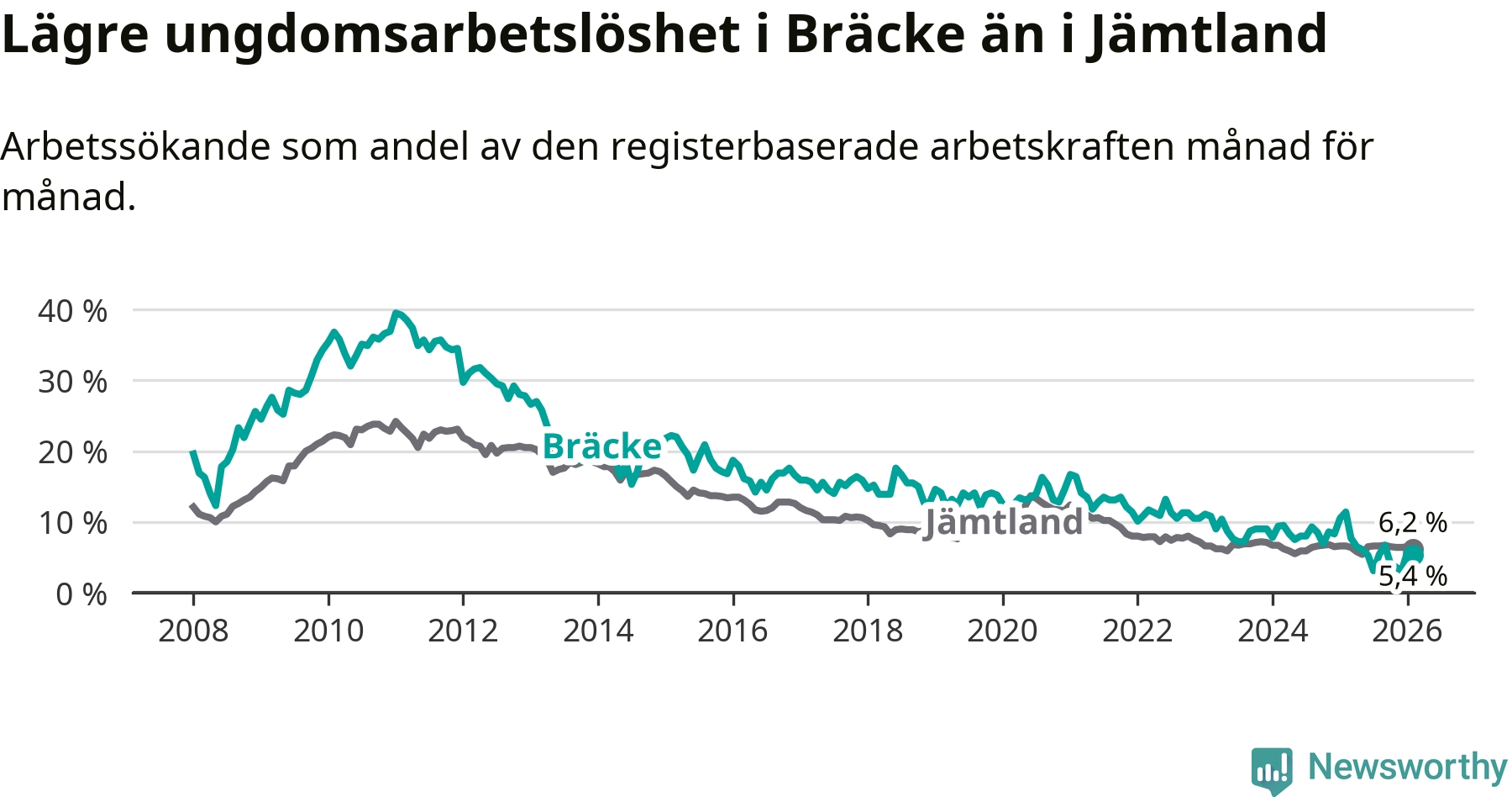 Medan Bräcke har högre total arbetslöshet än Jämtland, ligger ungdomsarbetslösheten 0,8 procentenheter lägre i Bräcke.