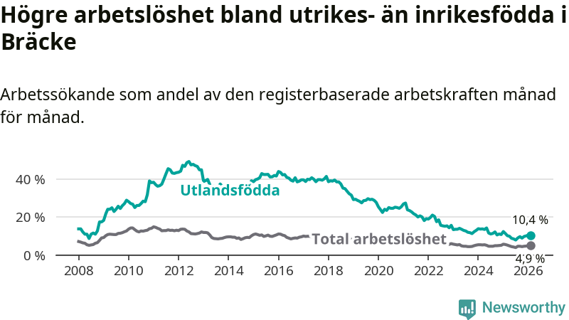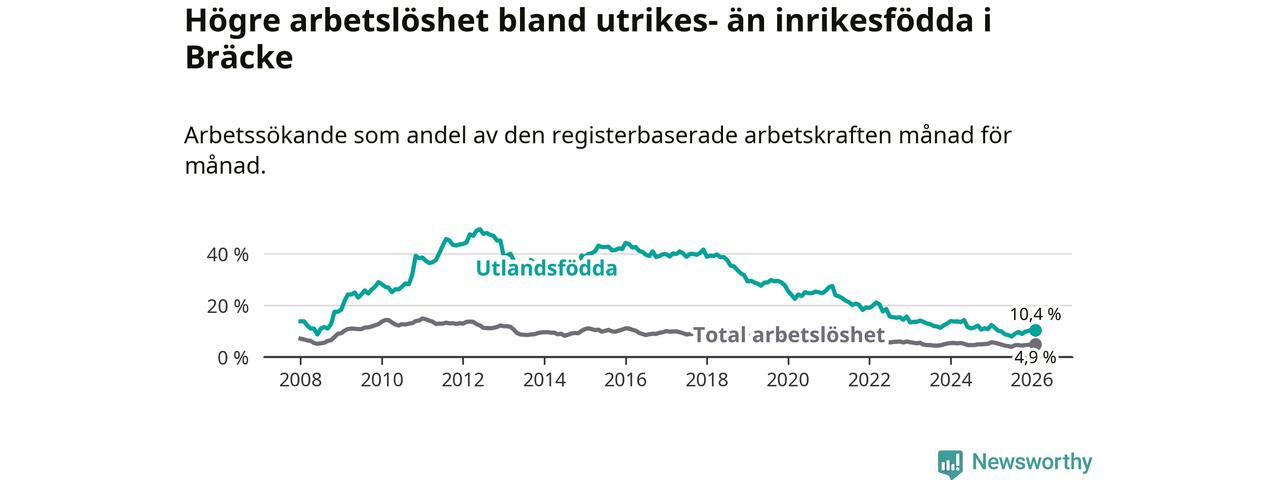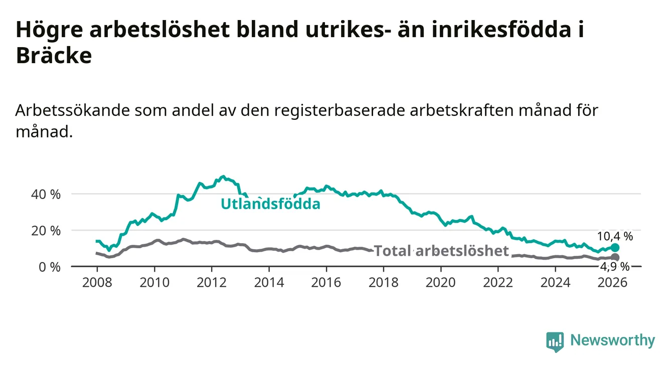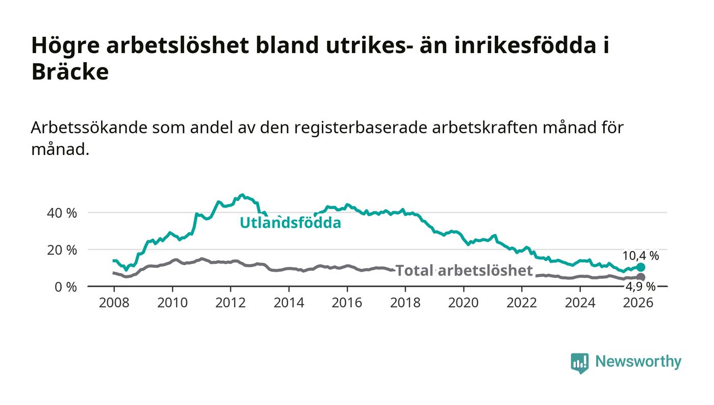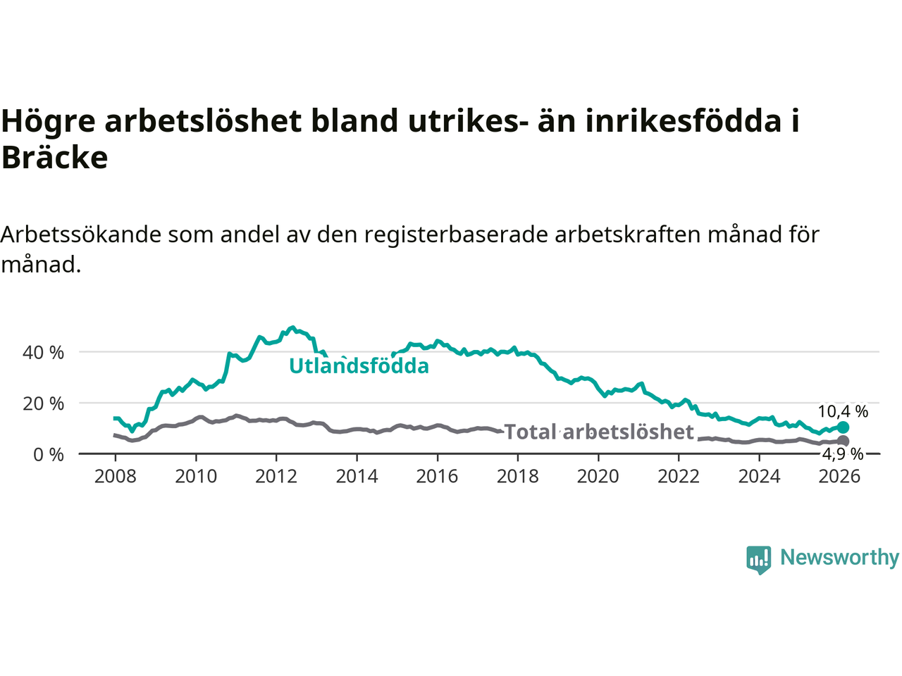 Arbetslösheten bland utlandsfödda var 10,4 procent i Bräcke under februari månad, motsvarande 41 av 394 personer. Det är 0,9 procentenheter färre än vid samma tidpunkt i fjol (−1 om man räknar personer). Därmed är de utlandsföddas arbetslöshet lägre än vid samma tidpunkt i fjol för 17:e månaden i följd. Sedan september 2024 har arbetslösheten bland utlandsfödda minskat från 12,2 till 10,4 procent.