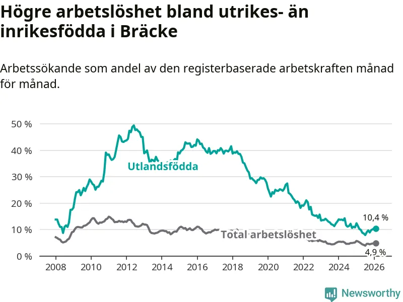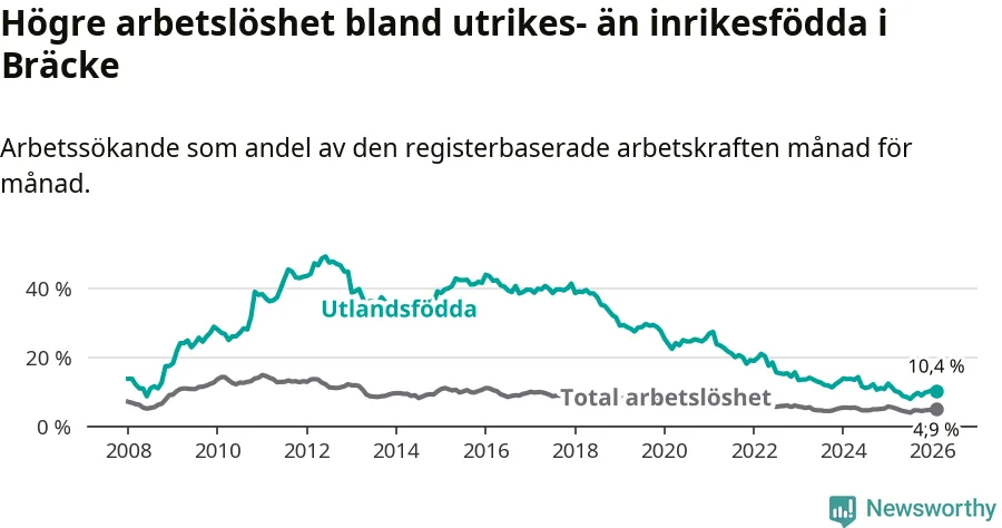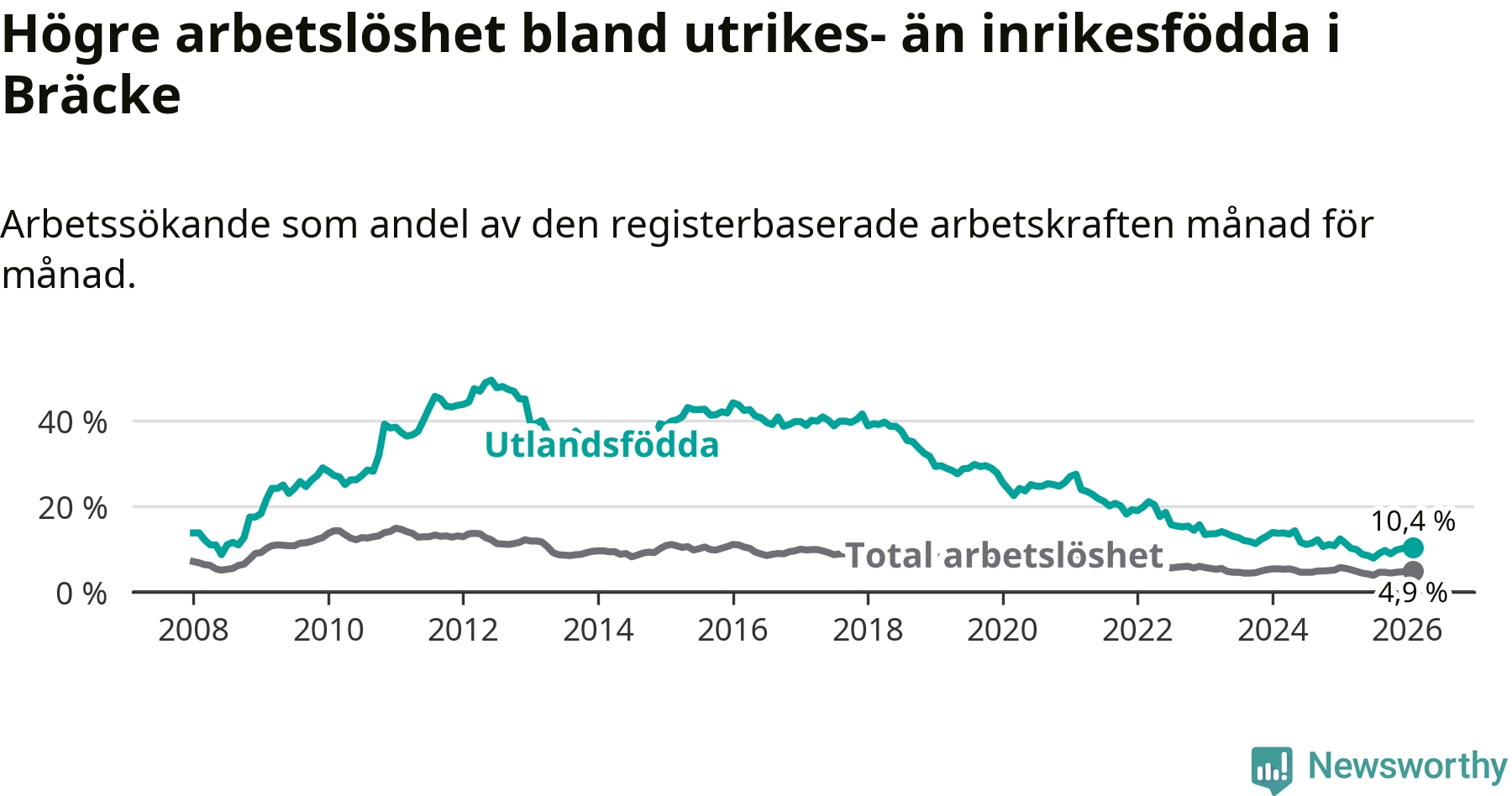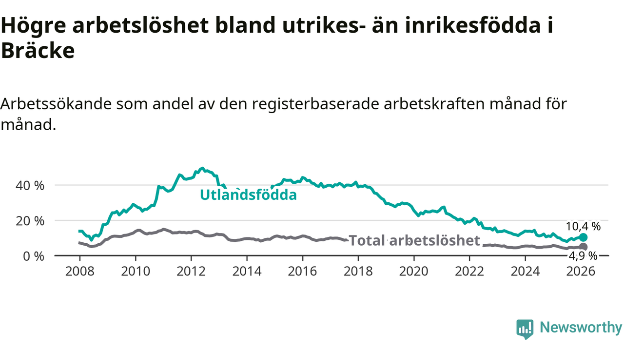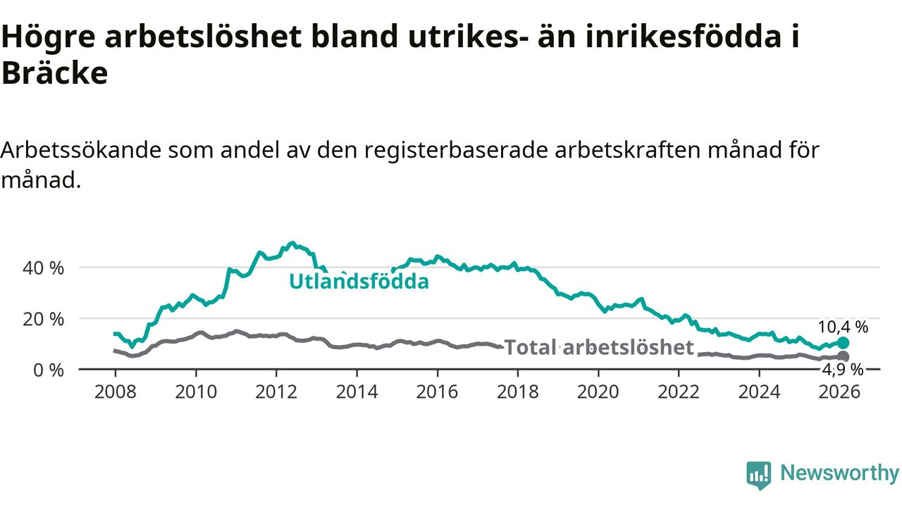 Arbetslösheten bland utlandsfödda var 10,4 procent i Bräcke under februari månad, motsvarande 41 av 394 personer. Det är 0,9 procentenheter färre än vid samma tidpunkt i fjol (−1 om man räknar personer). Därmed är de utlandsföddas arbetslöshet lägre än vid samma tidpunkt i fjol för 17:e månaden i följd. Sedan september 2024 har arbetslösheten bland utlandsfödda minskat från 12,2 till 10,4 procent.