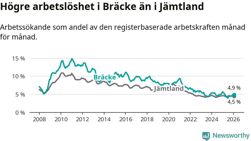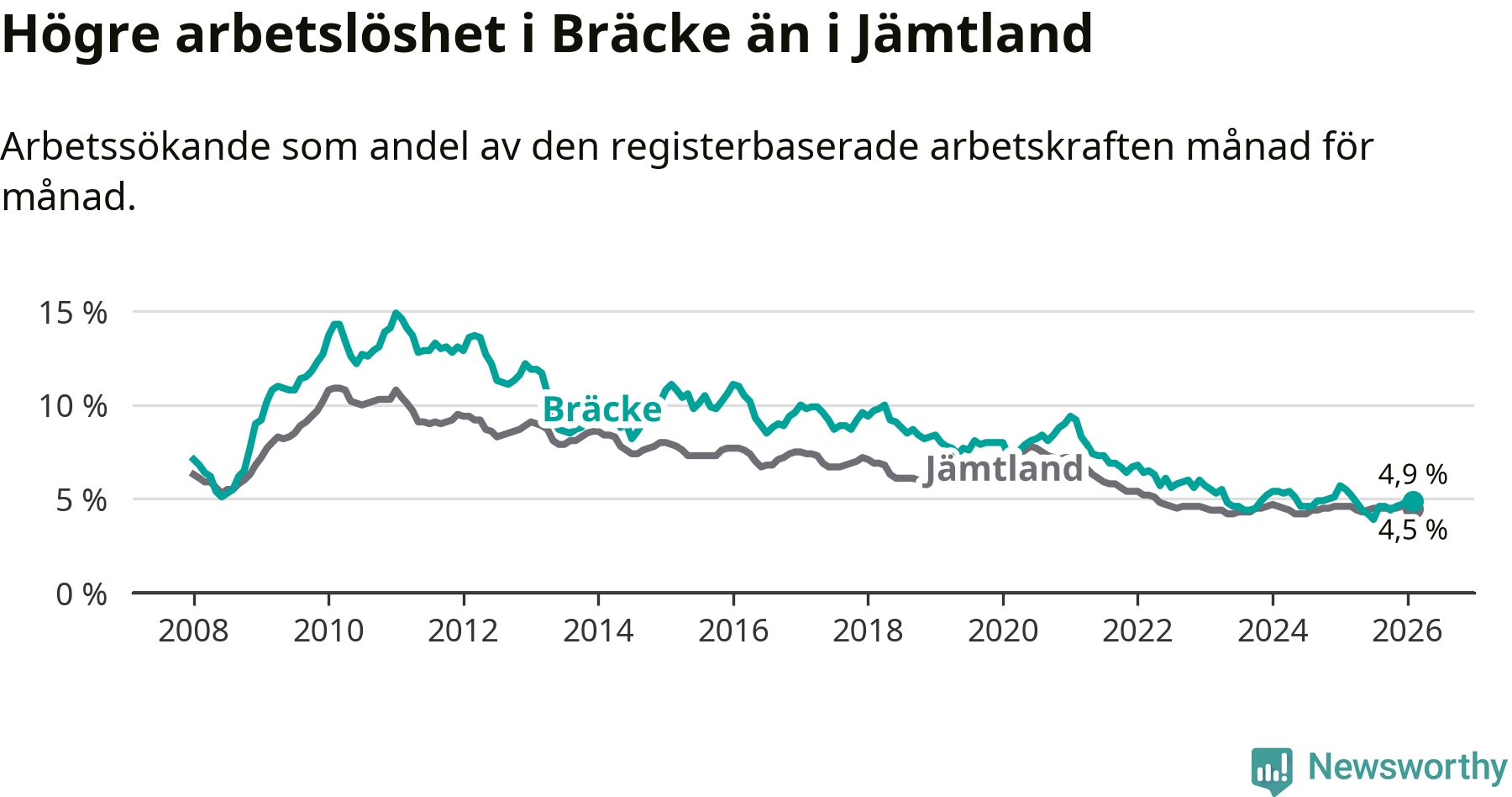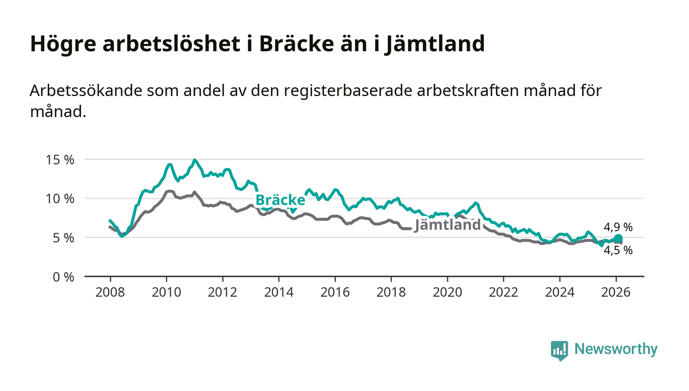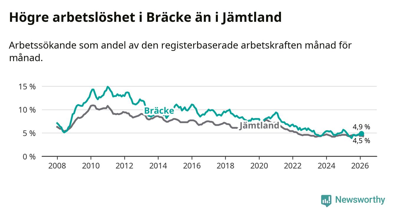 Under februari månad rapporterade Bräcke kommun en total arbetslöshet på 4,9 procent. Det är en minskning jämfört med samma tidpunkt i fjol (−0,6 procentenheter). Även i Jämtlands län sjunker arbetslösheten något.