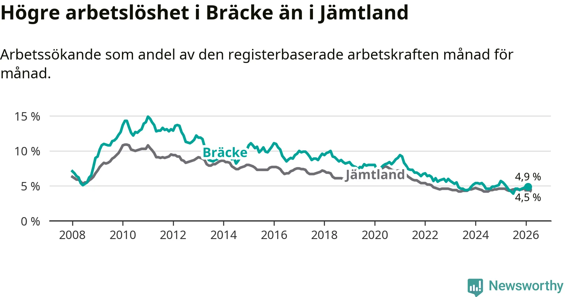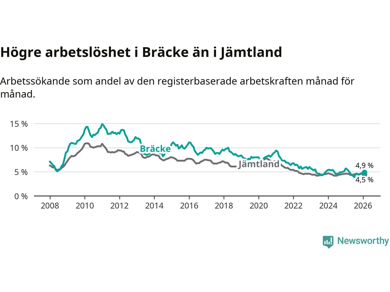 Även om arbetslösheten i Bräcke alltså minskar, så ligger den fortfarande över snittet i hela Jämtlands län (4,9 procent i kommunen, jämfört med 4,5 procent i hela länet). Härjedalen och Krokom har den lägsta arbetslösheten i länet (3,3 procent), medan Strömsund har den högsta (6,4 procent). För att Bräcke skulle komma ner i samma arbetslöshetsnivå som Härjedalen och Krokom skulle 42 personer behöva sysselsättas.
