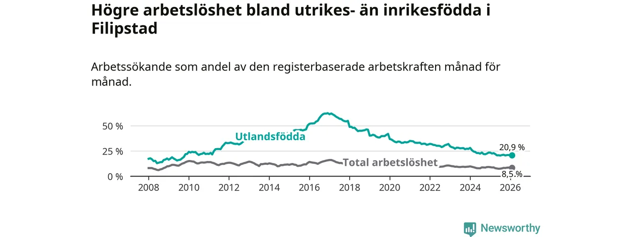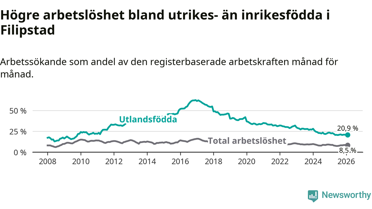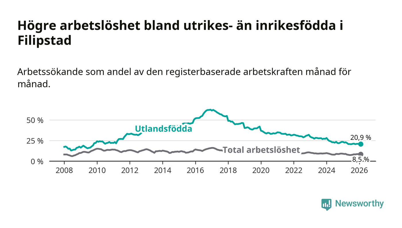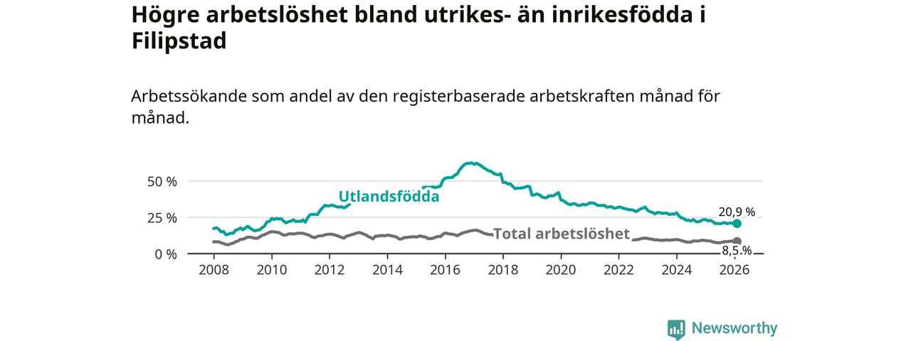 Arbetslösheten bland utlandsfödda var 20,9 procent i Filipstad under februari månad, motsvarande 156 av 746 personer. Det är 1,6 procentenheter färre än vid samma tidpunkt i fjol (−16 om man räknar personer). Därmed har de utlandsföddas arbetslöshet varit lägre än vid samma tidpunkt i fjol i över tre år i sträck. Sedan december 2022 har arbetslösheten bland utlandsfödda minskat från 32,0 till 20,9 procent.