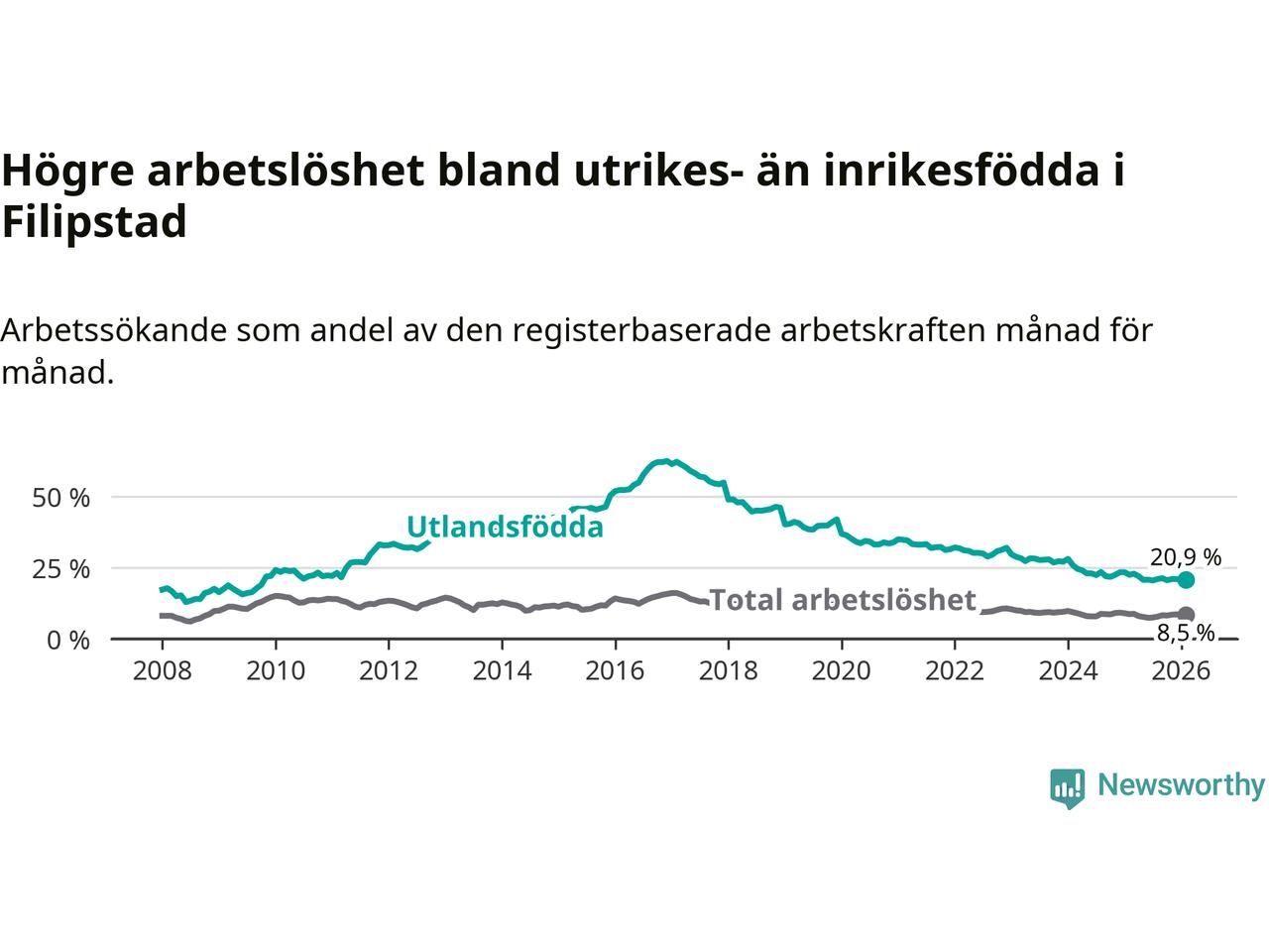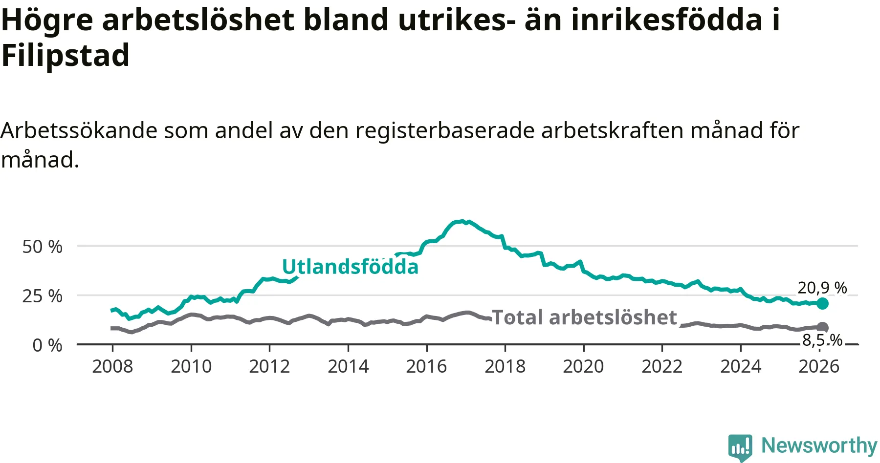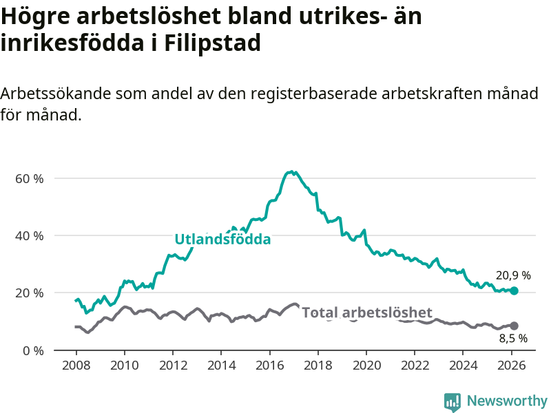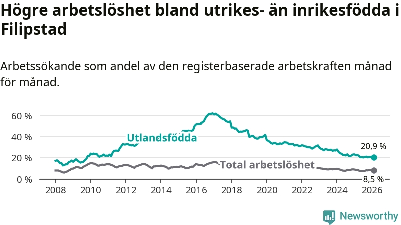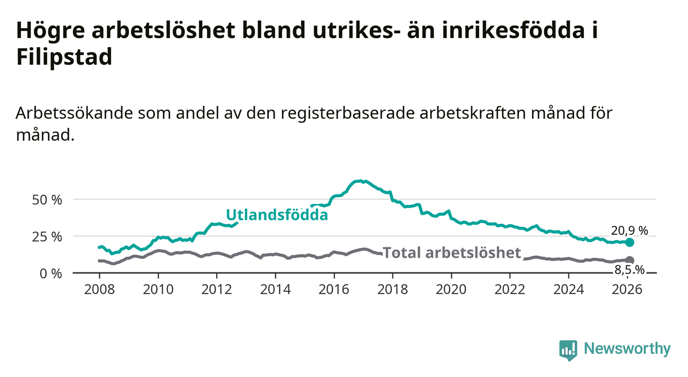 Arbetslösheten bland utlandsfödda var 20,9 procent i Filipstad under februari månad, motsvarande 156 av 746 personer. Det är 1,6 procentenheter färre än vid samma tidpunkt i fjol (−16 om man räknar personer). Därmed har de utlandsföddas arbetslöshet varit lägre än vid samma tidpunkt i fjol i över tre år i sträck. Sedan december 2022 har arbetslösheten bland utlandsfödda minskat från 32,0 till 20,9 procent.