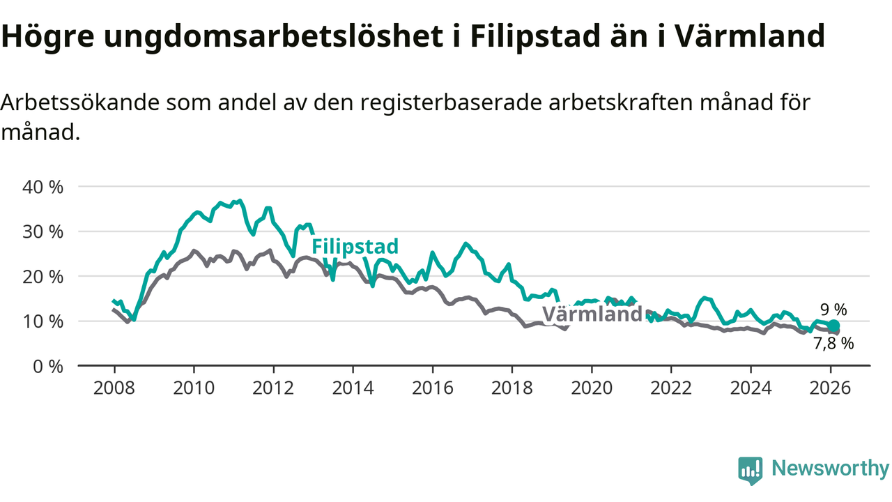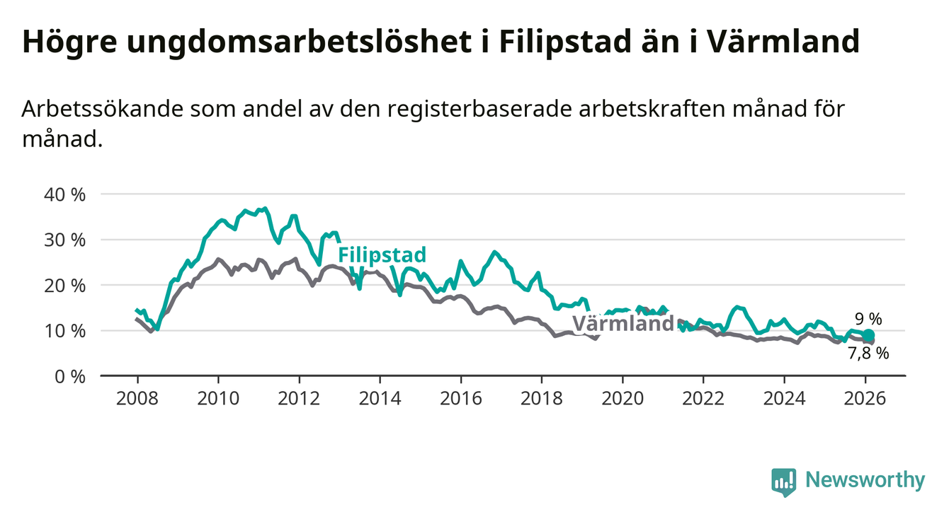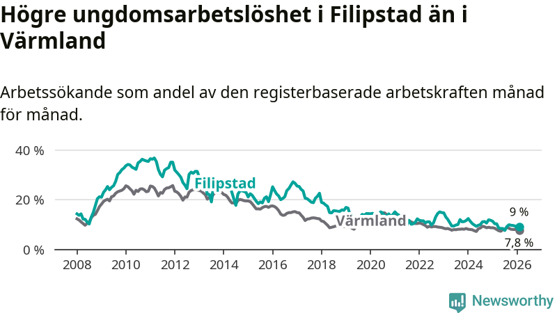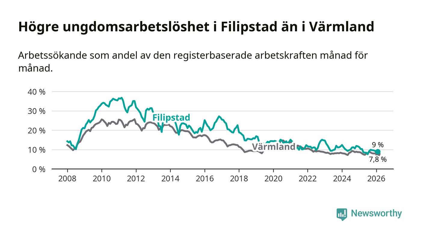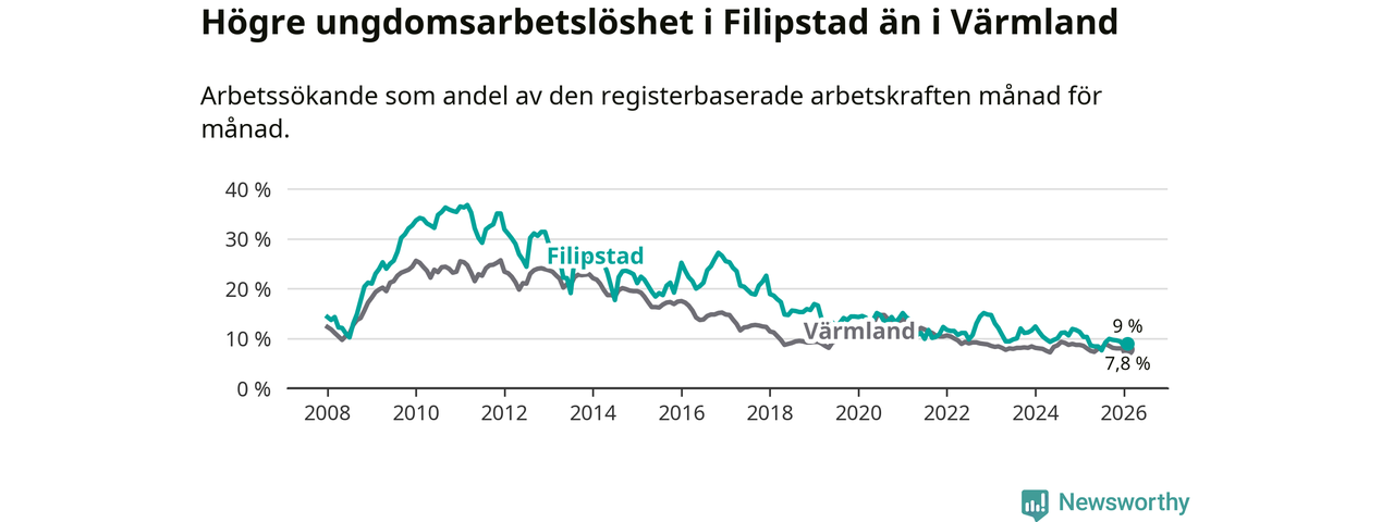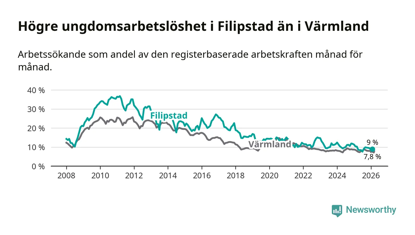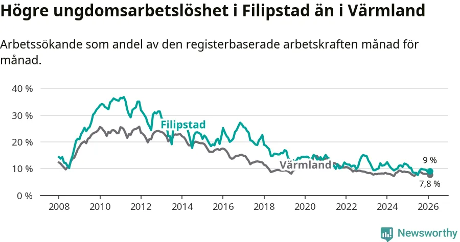 Precis som den totala arbetslösheten ligger ungdomsarbetslösheten i Filipstad högre än i Värmland som helhet. Skillnaden mellan kommunen och länet är 1,2 procentenheter.