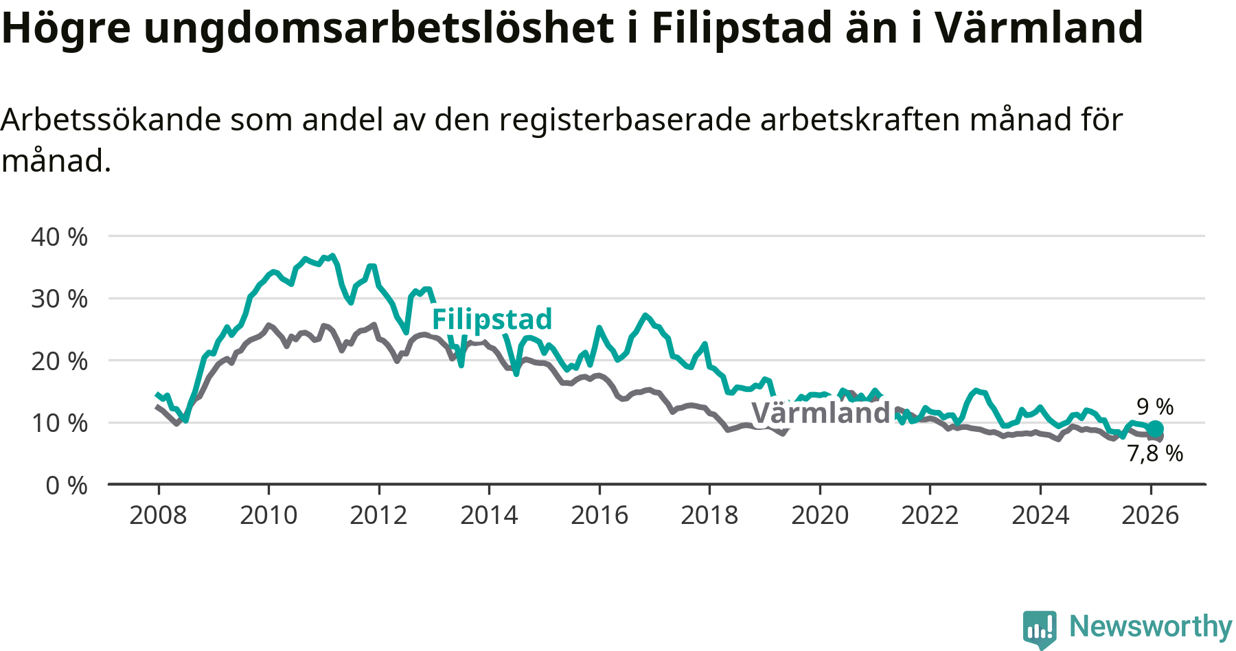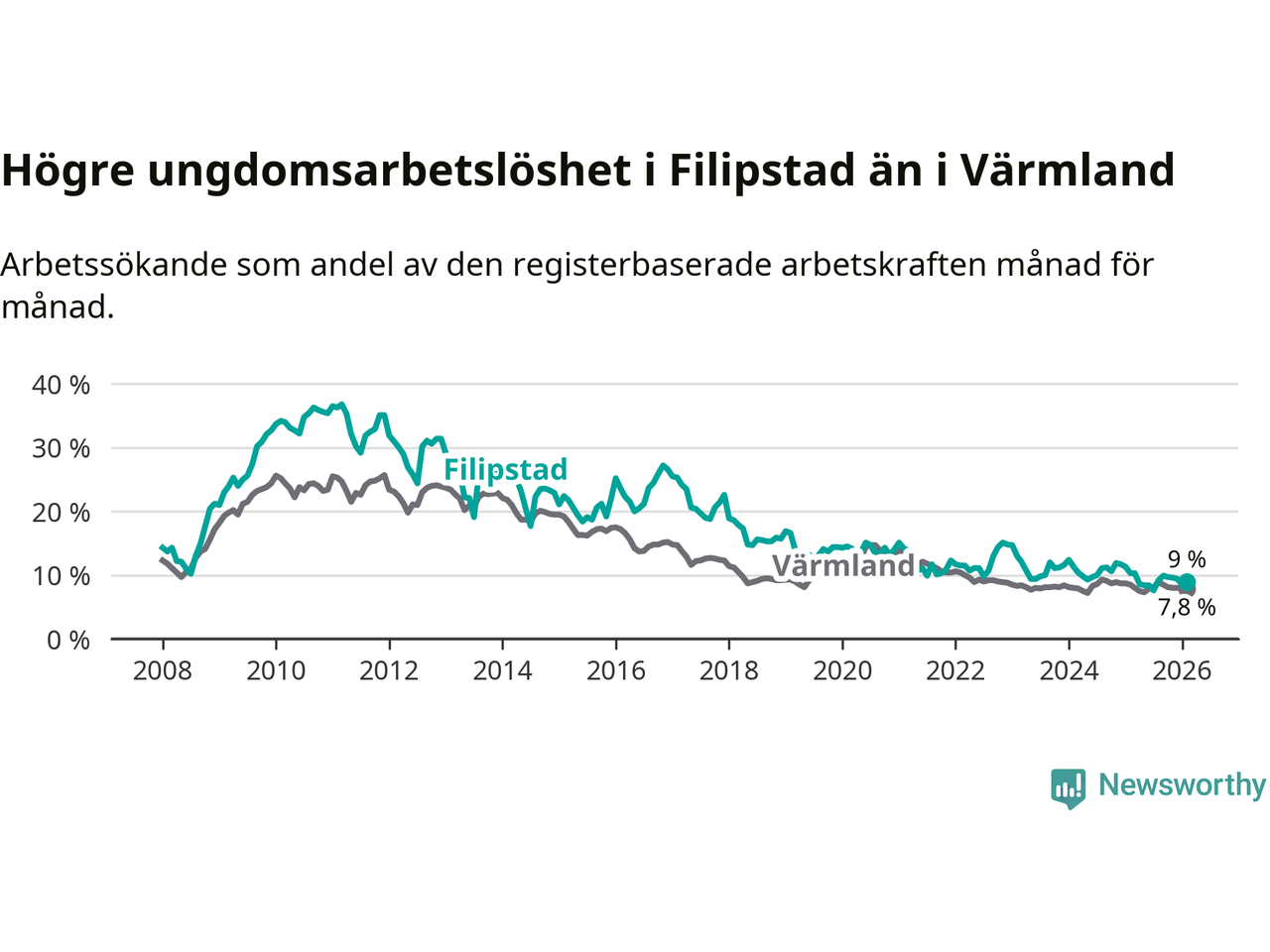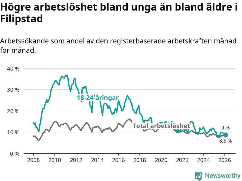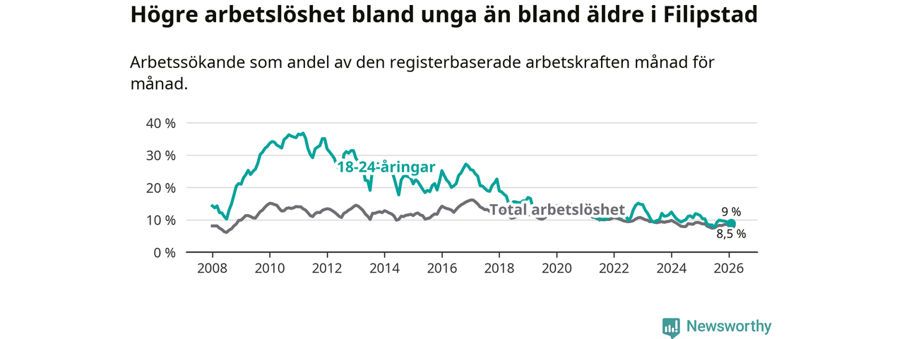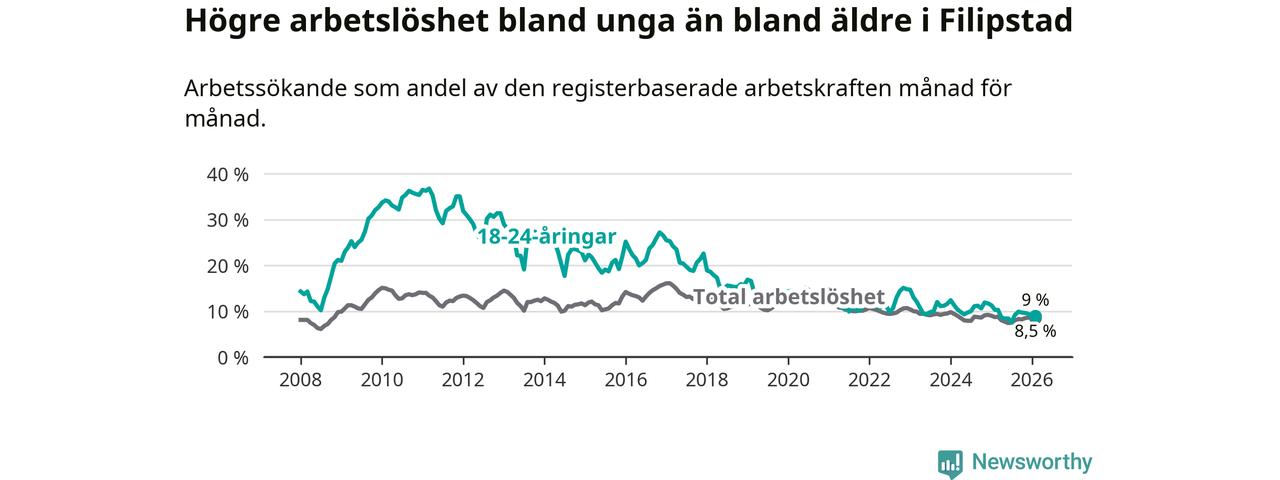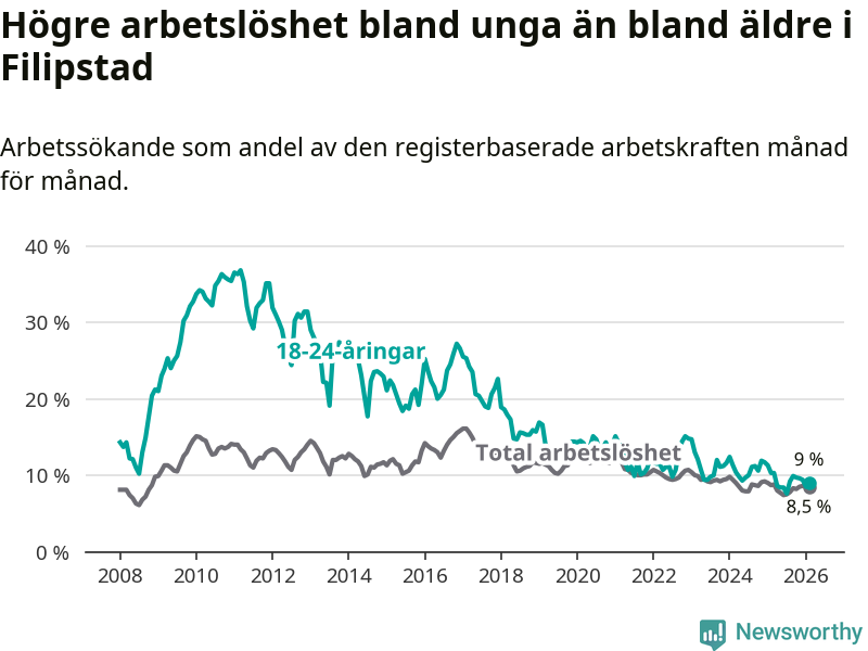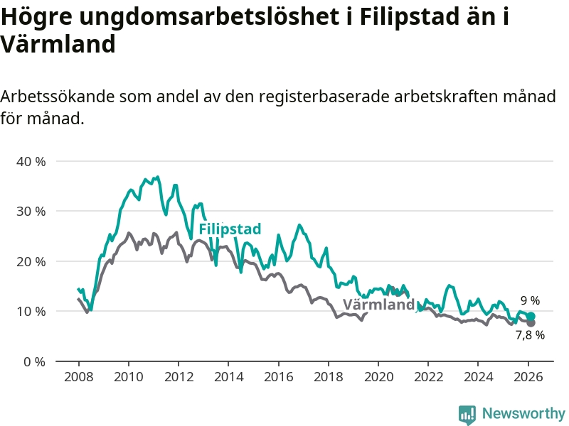 Precis som den totala arbetslösheten ligger ungdomsarbetslösheten i Filipstad högre än i Värmland som helhet. Skillnaden mellan kommunen och länet är 1,2 procentenheter.