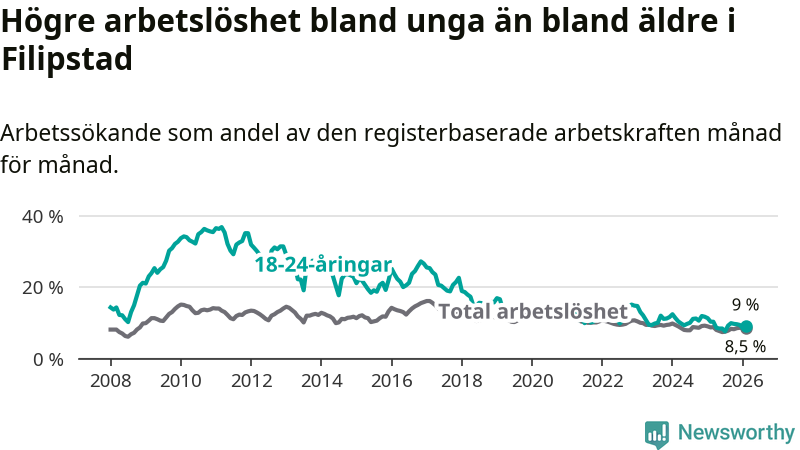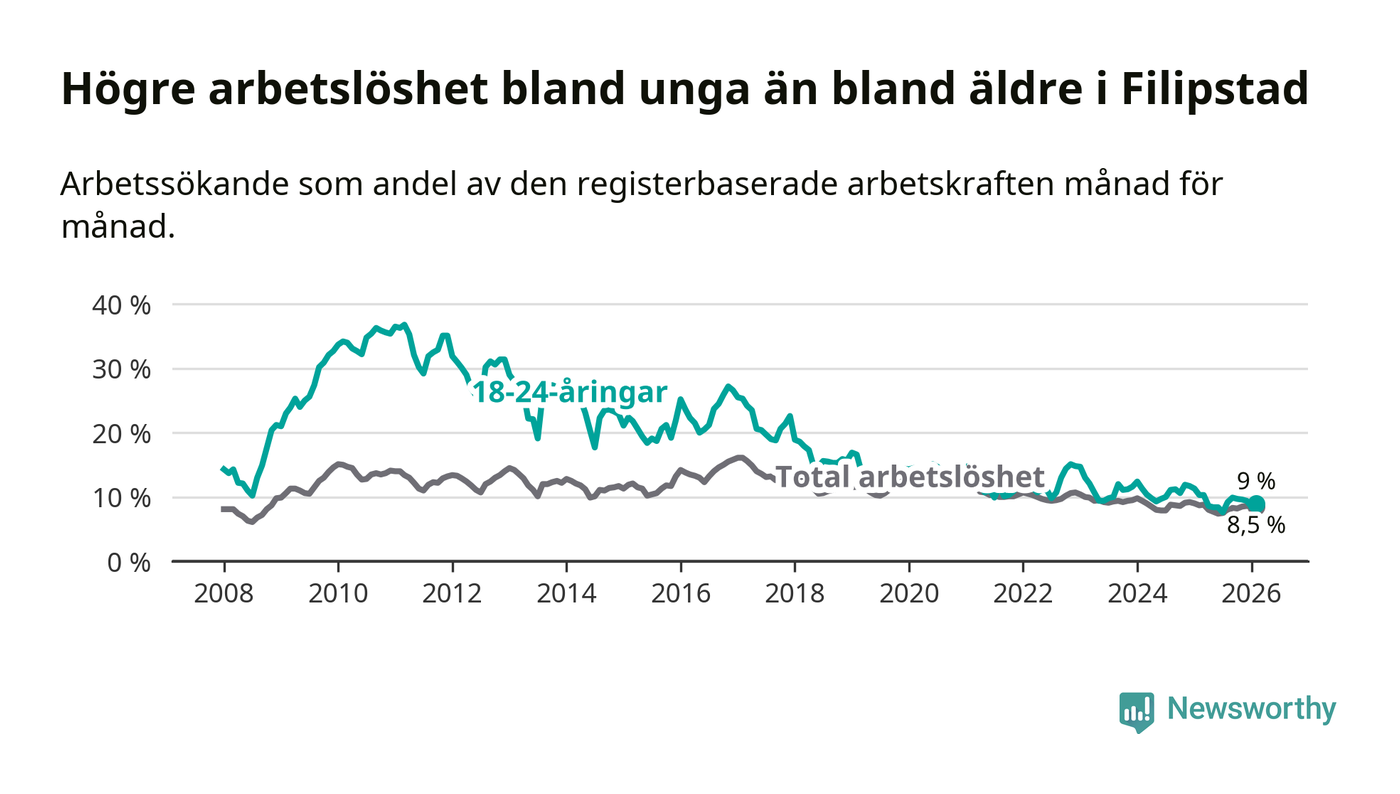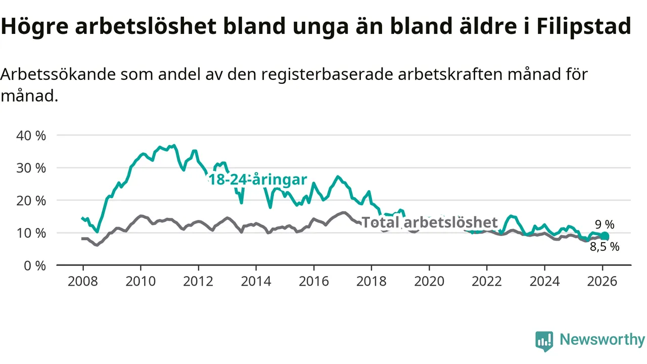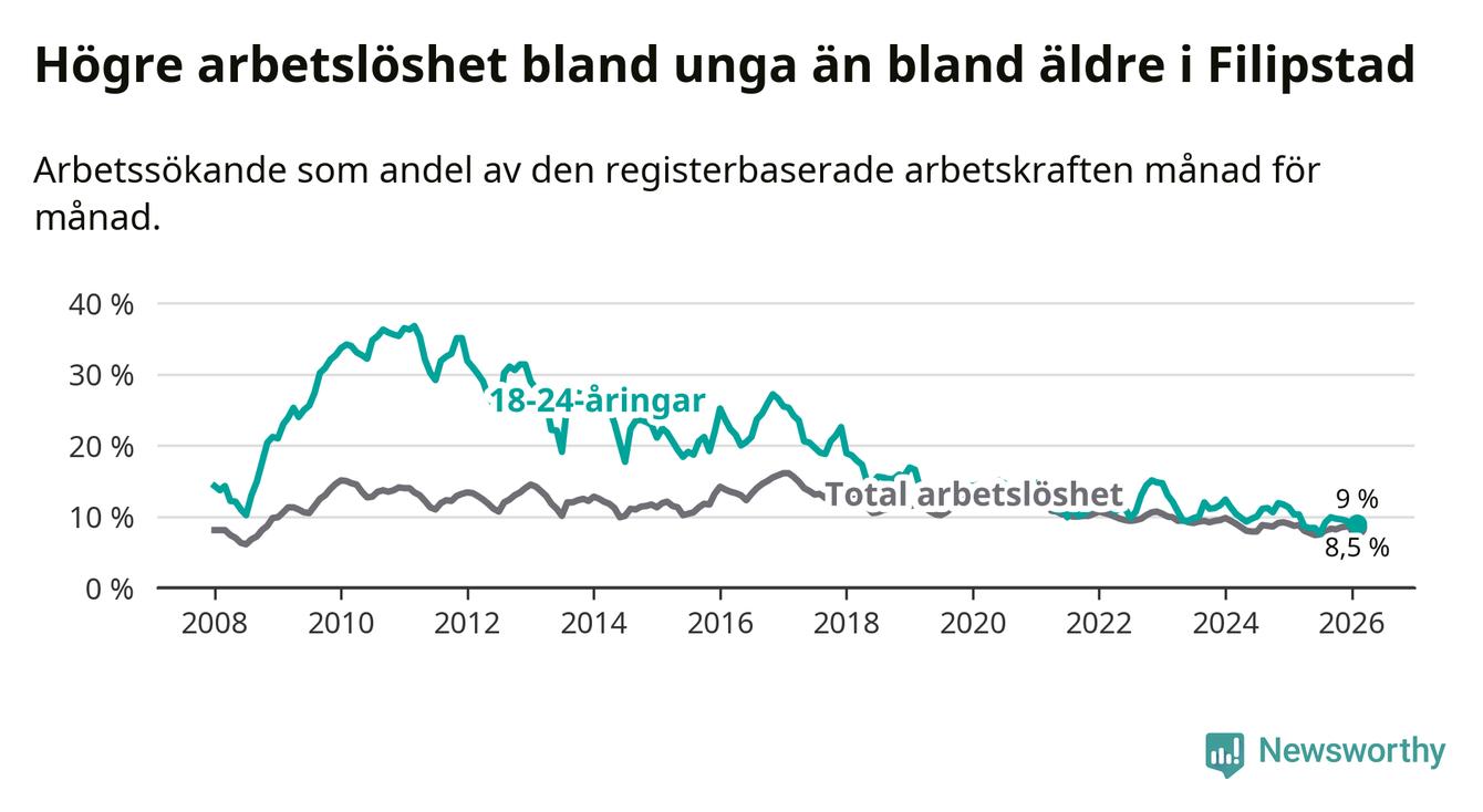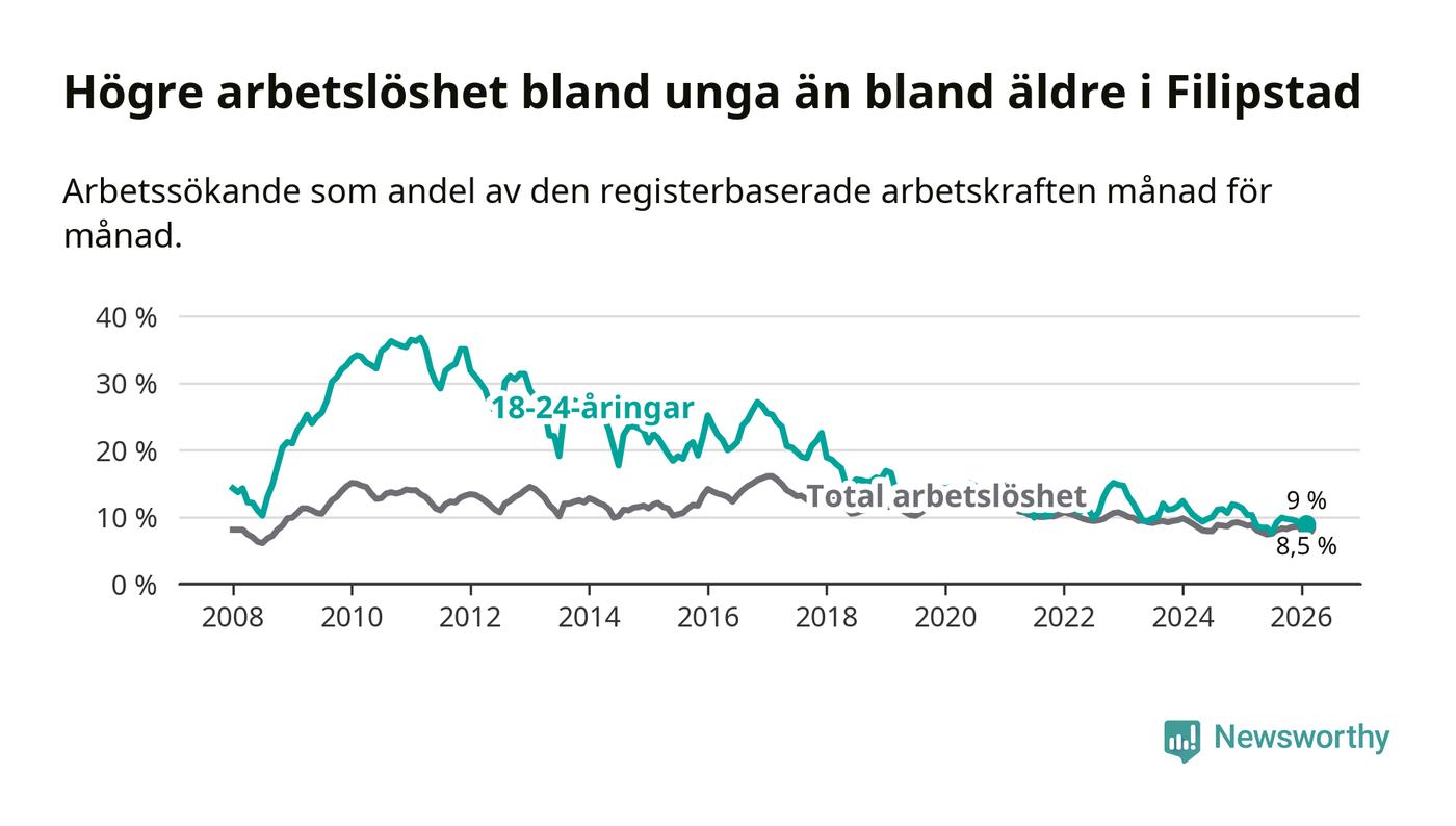 I och med den senaste månadens nedgång har de ungas arbetslöshet i Filipstad sjunkit 14 månader i följd (ner från 11,7 procent i december 2024 till 9,0 procent nu).
