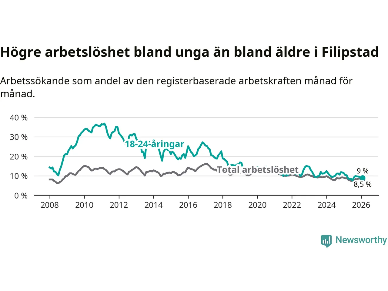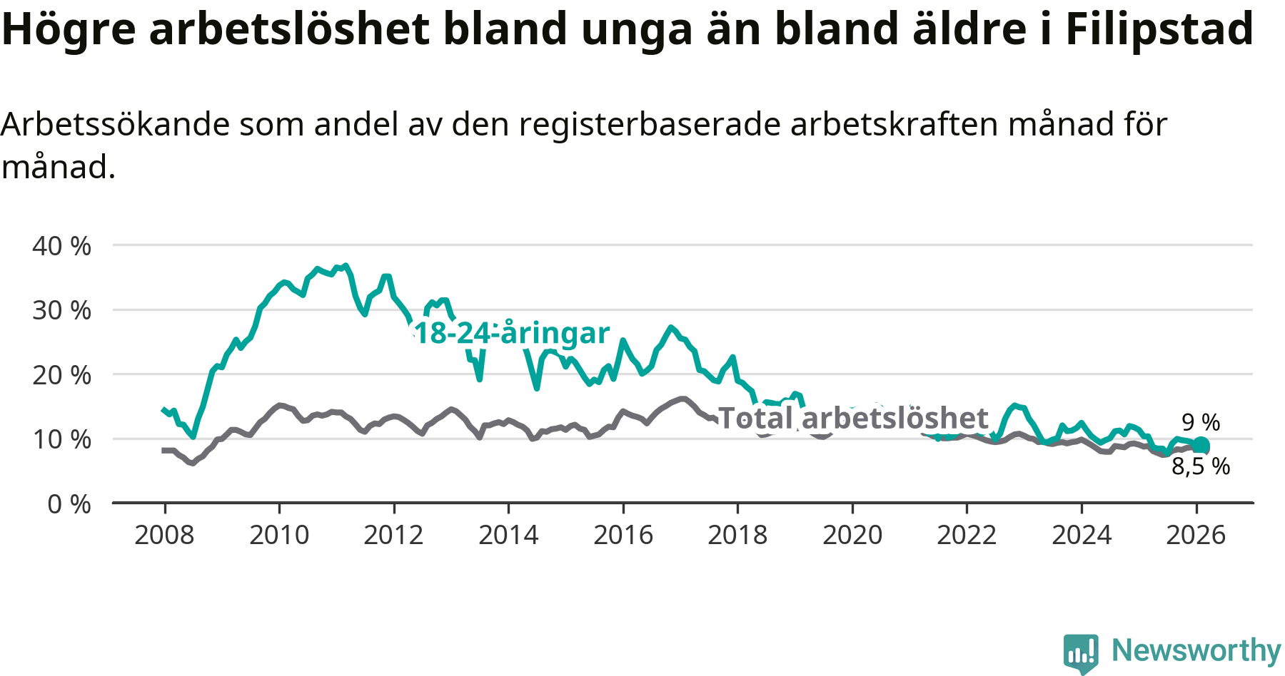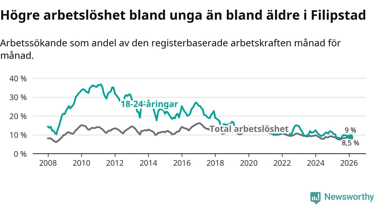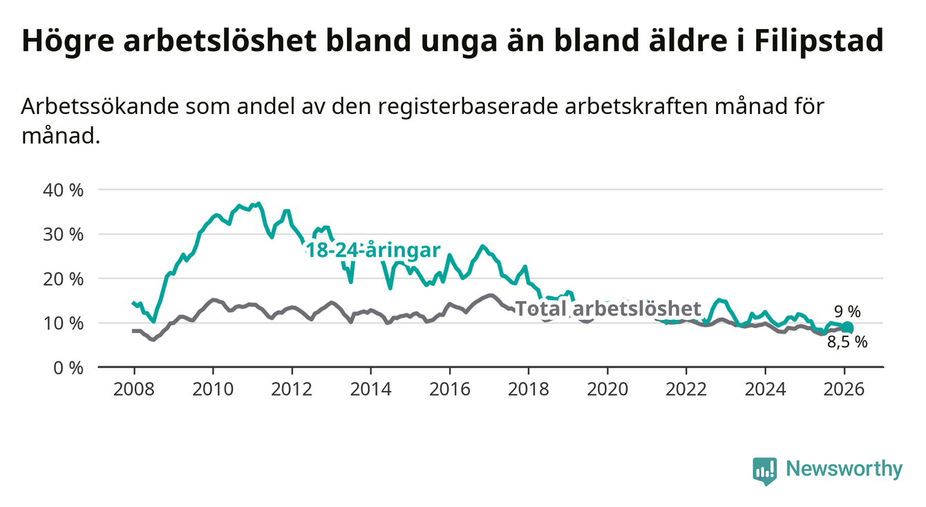 I och med den senaste månadens nedgång har de ungas arbetslöshet i Filipstad sjunkit 14 månader i följd (ner från 11,7 procent i december 2024 till 9,0 procent nu).