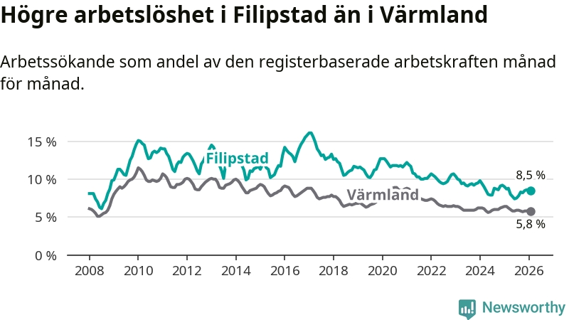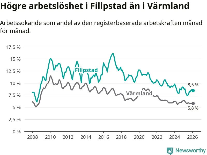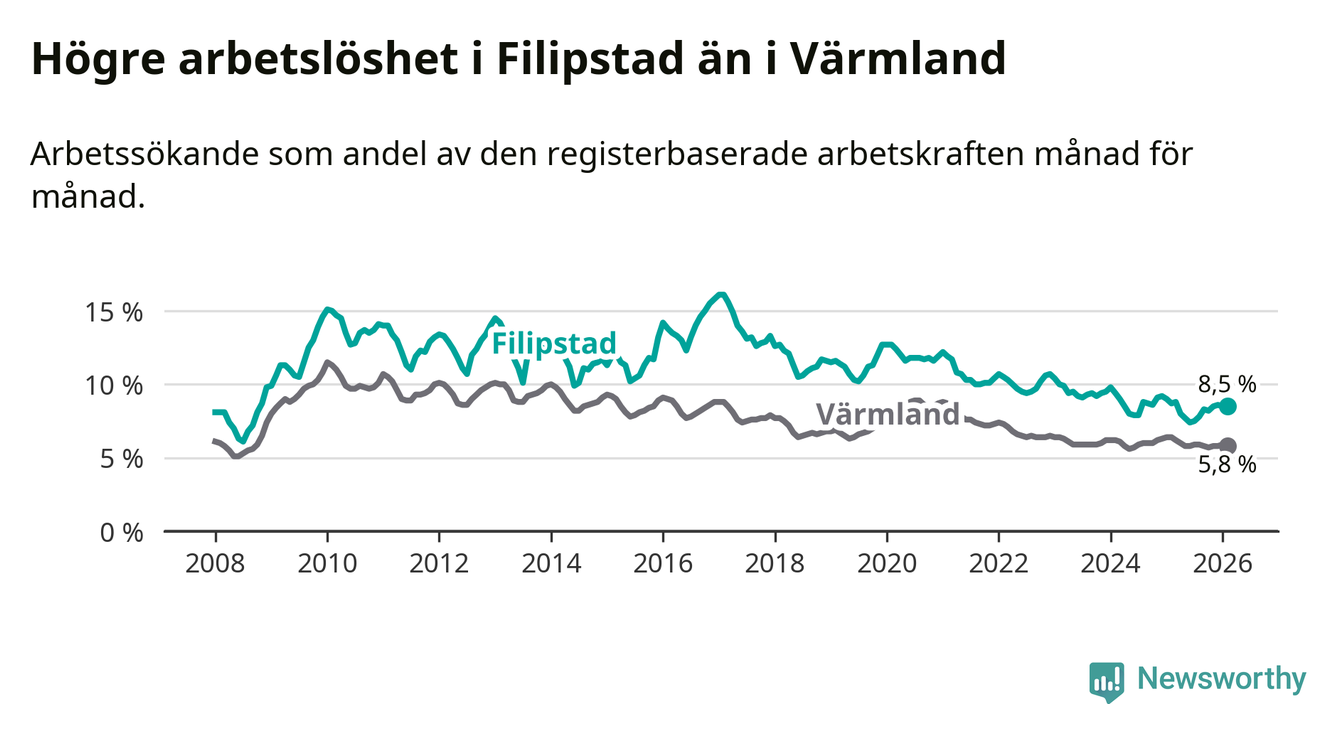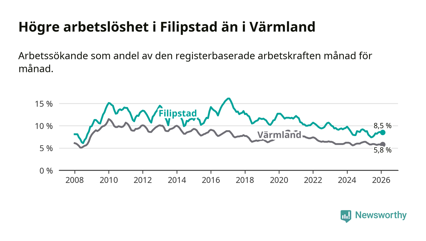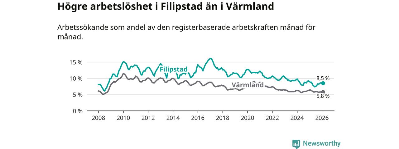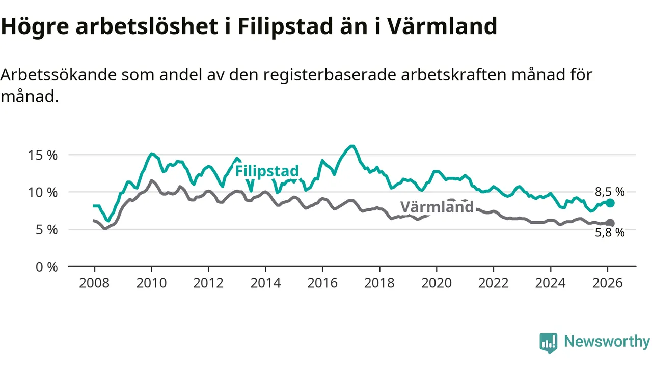 Det är 38:e månaden i följd som arbetslösheten i Filipstad är lägre än den var under samma tidpunkt året innan. Sedan december 2022 har arbetslösheten gått ner från 10,7 till 8,5 procent.