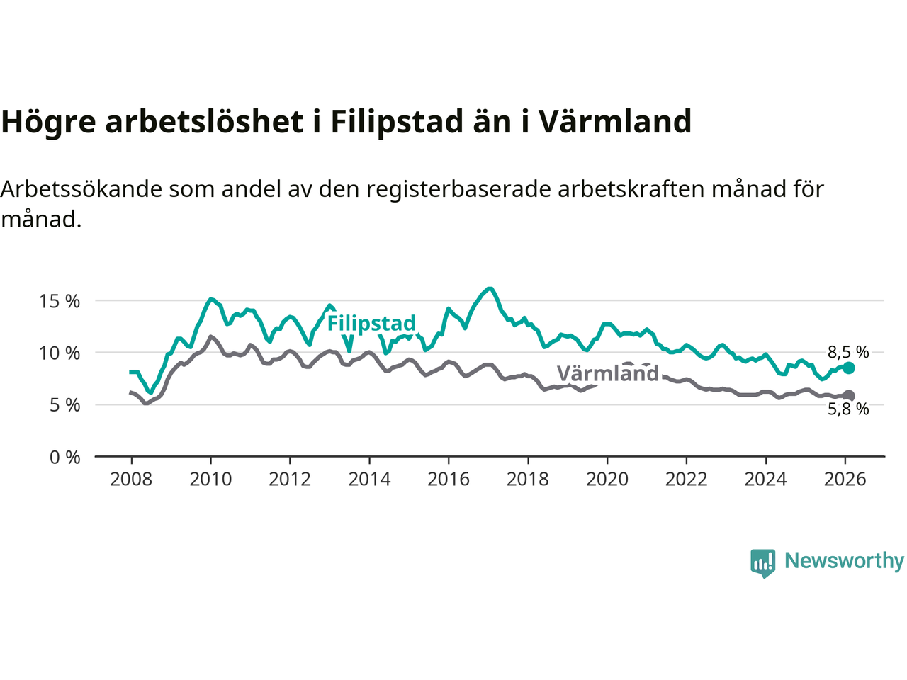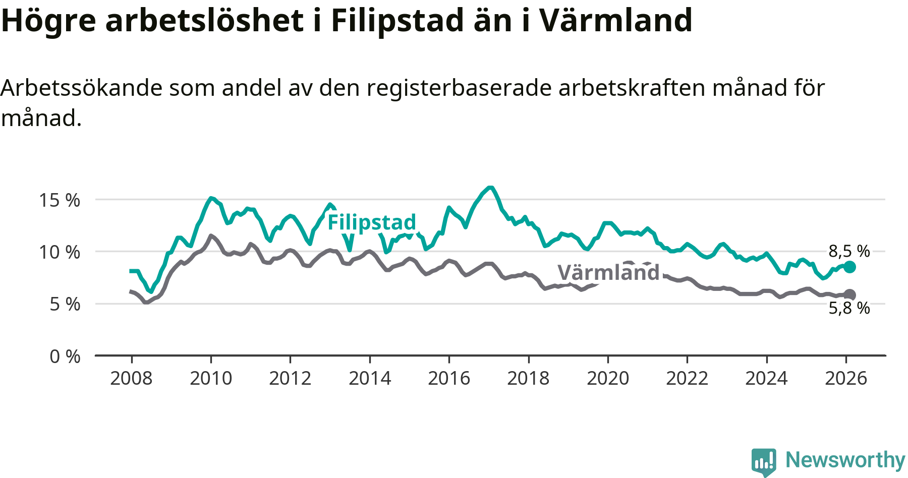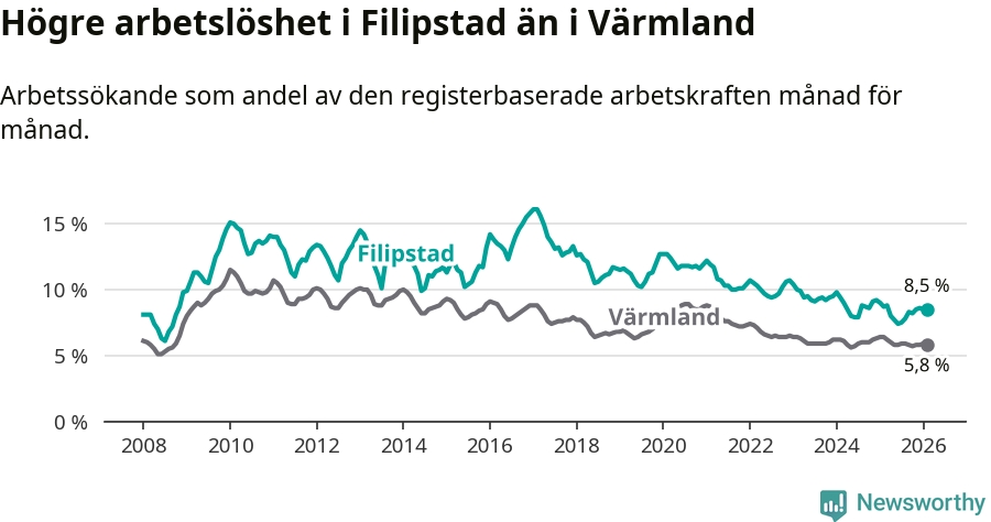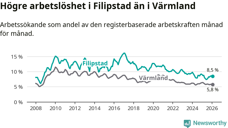 Under februari månad rapporterade Filipstads kommun en total arbetslöshet på 8,5 procent. Det är en minskning jämfört med samma tidpunkt i fjol (−0,2 procentenheter). Även i Värmlands län sjunker arbetslösheten .