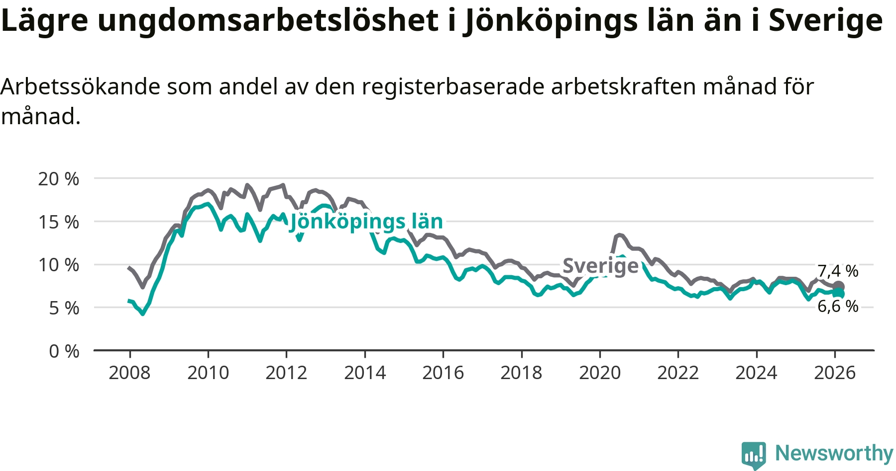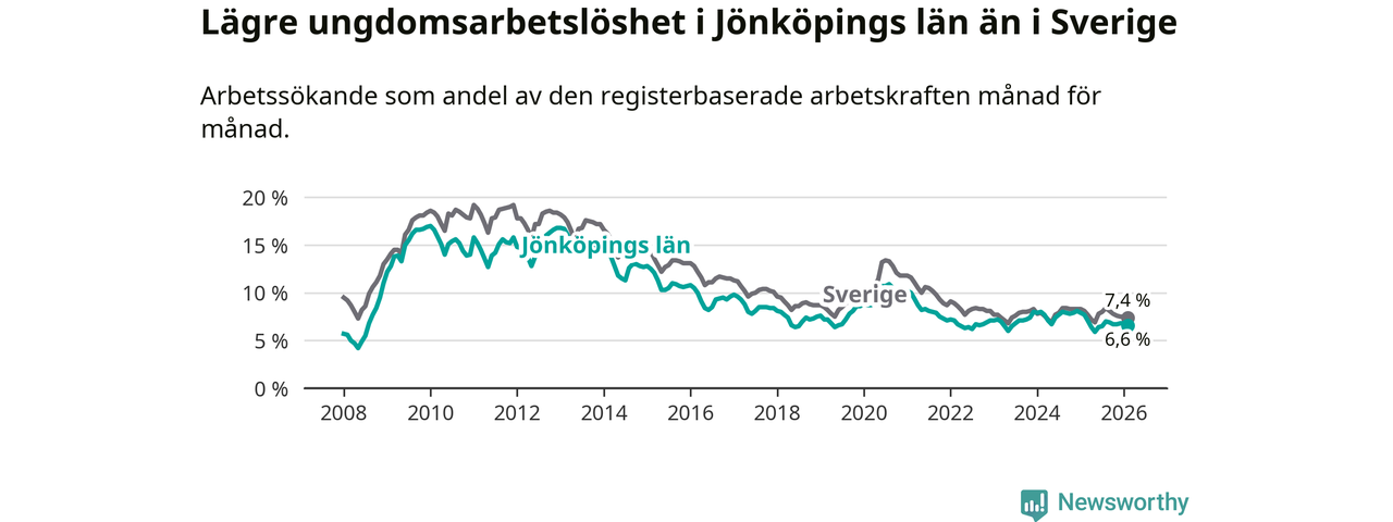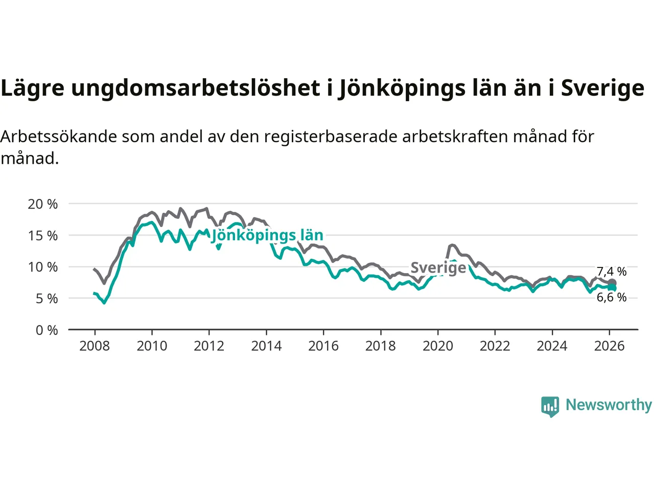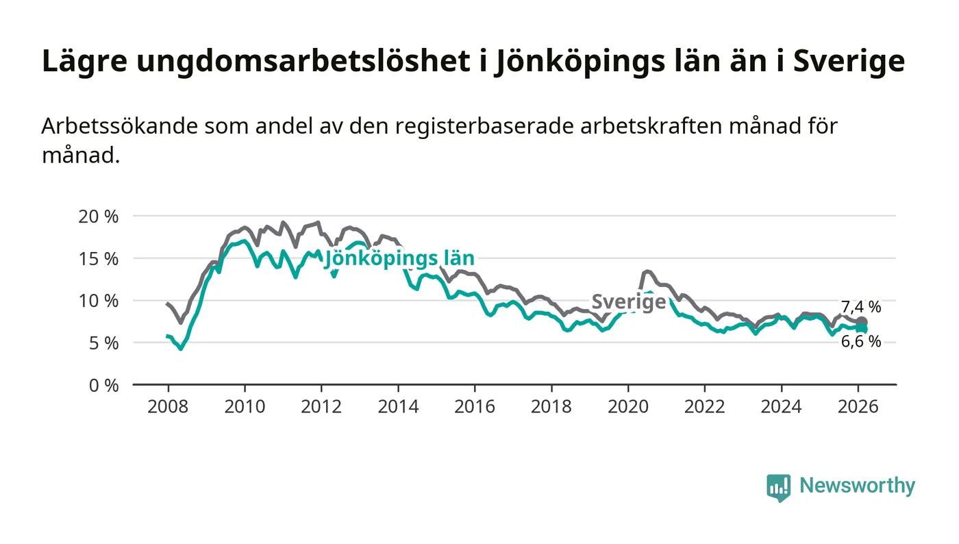 I och med den senaste månadens nedgång har de ungas arbetslöshet i Jönköping sjunkit 13 månader i följd (ner från 7,9 procent i januari 2025 till 6,6 procent nu).