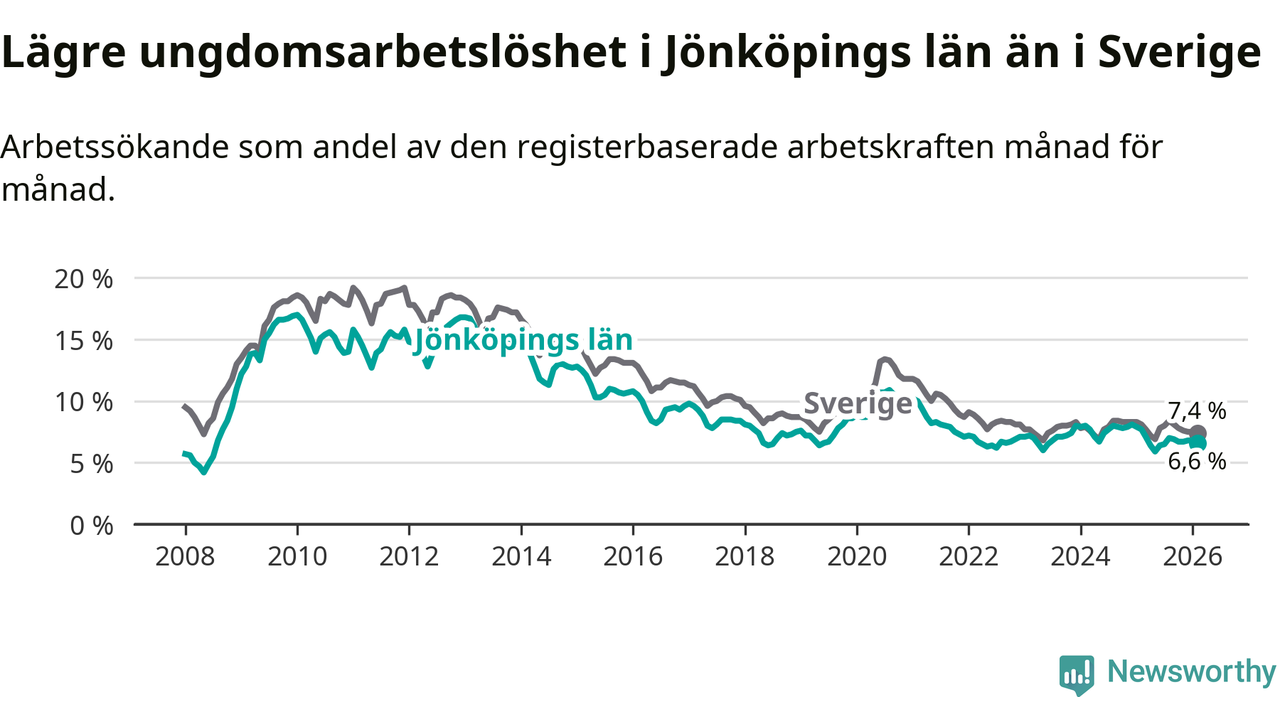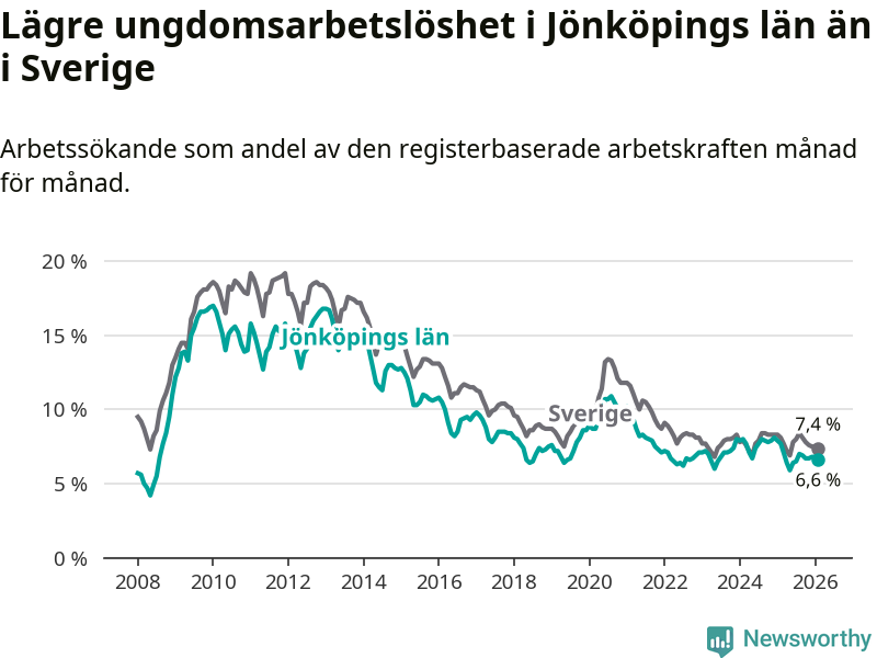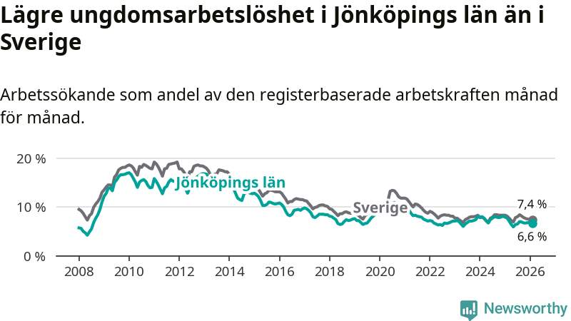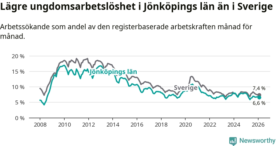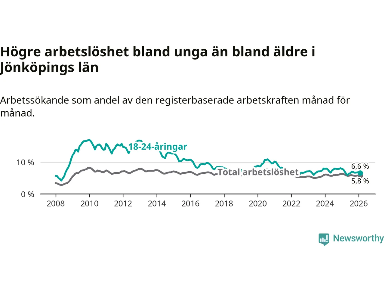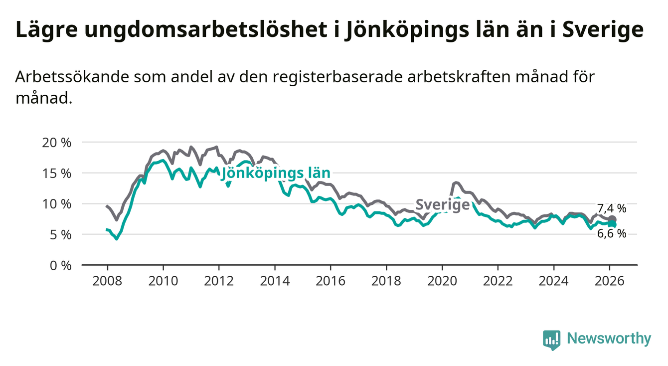 I och med den senaste månadens nedgång har de ungas arbetslöshet i Jönköping sjunkit 13 månader i följd (ner från 7,9 procent i januari 2025 till 6,6 procent nu).
