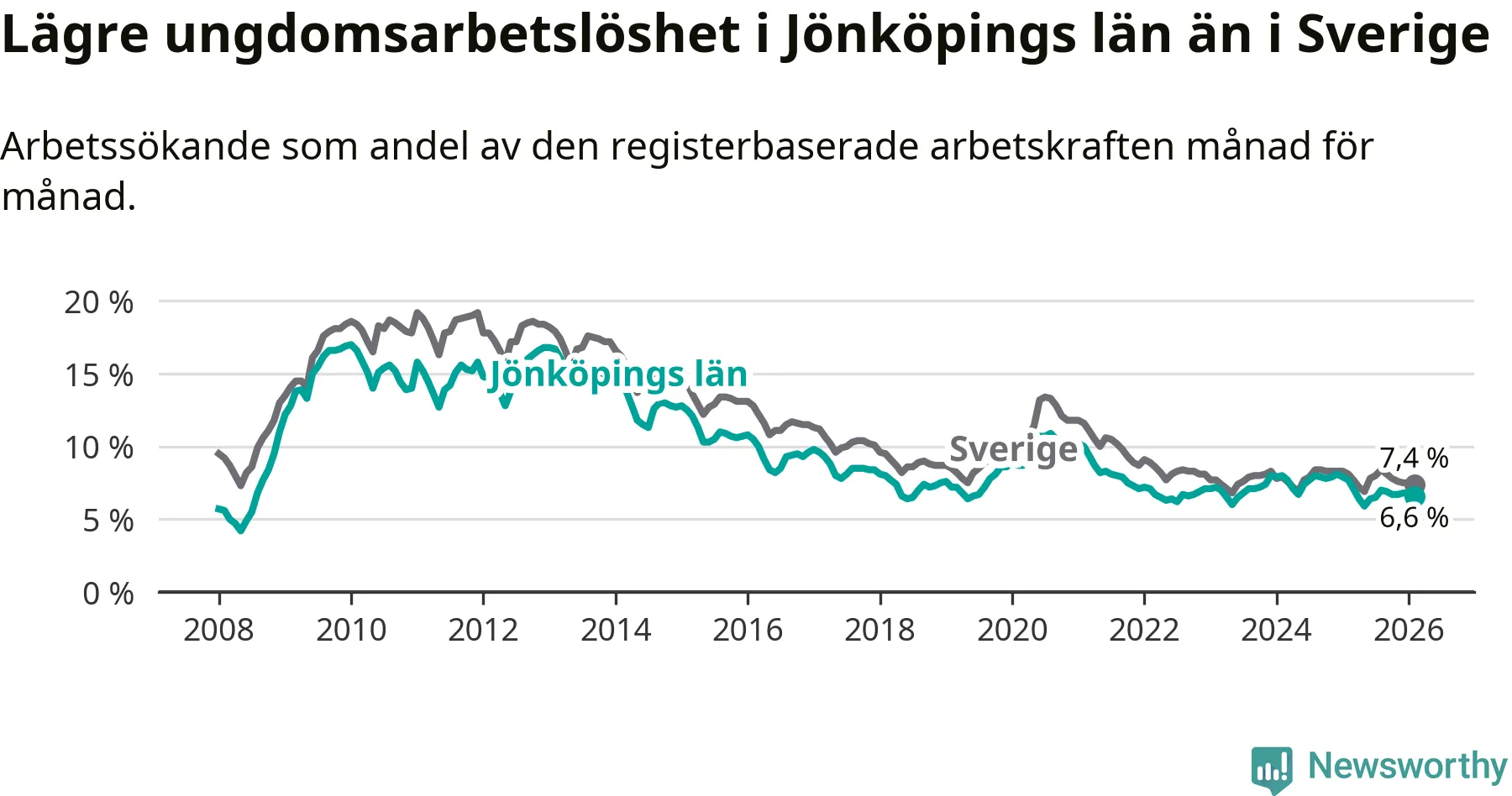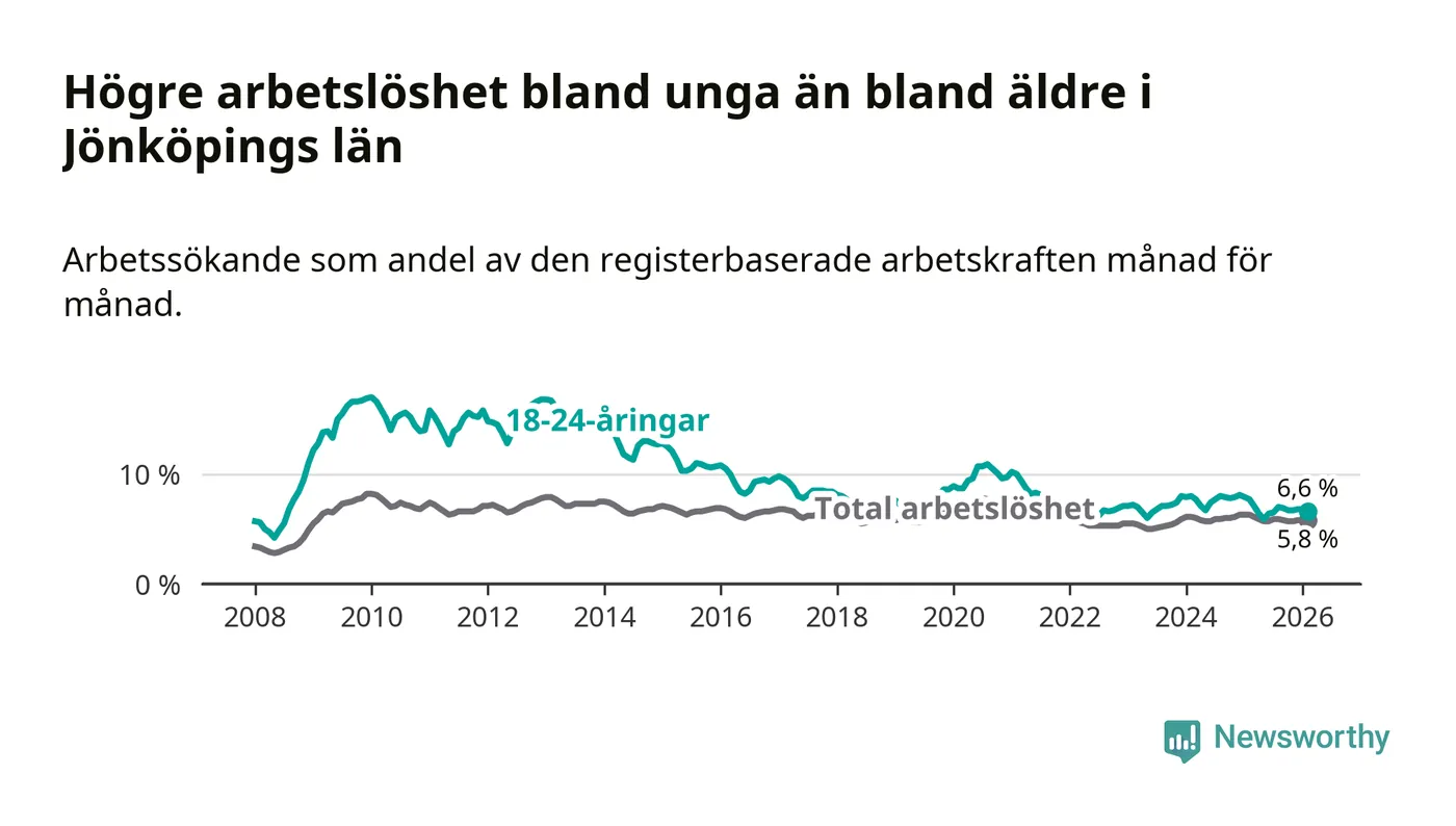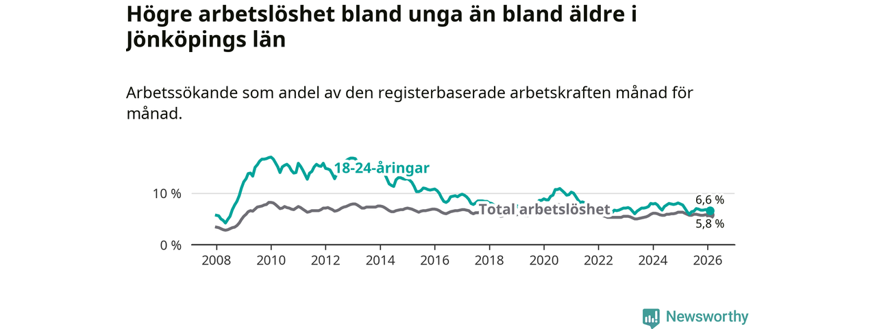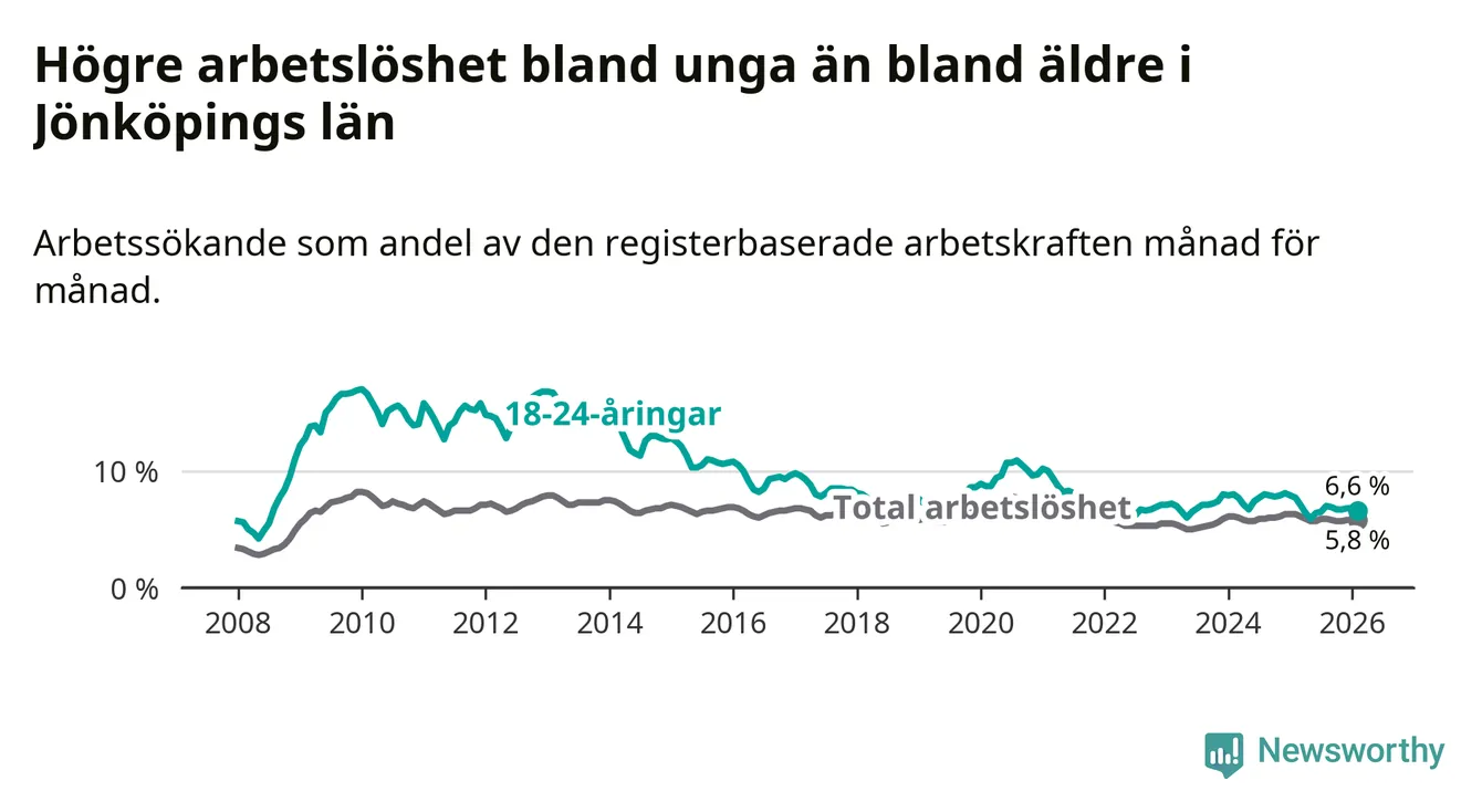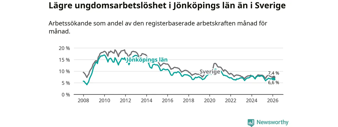 Graf: Arbetslöshet bland unga i Jönköpings län och Sverige