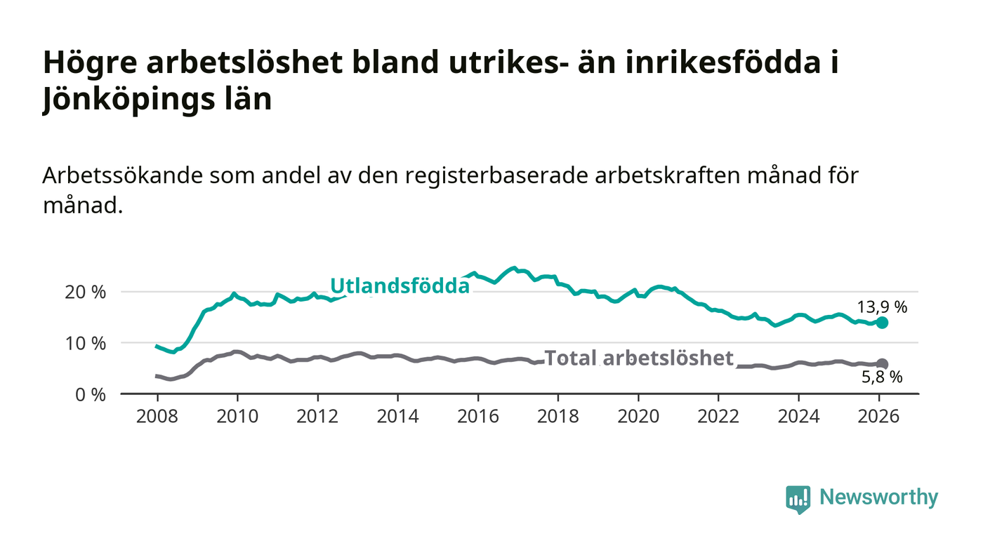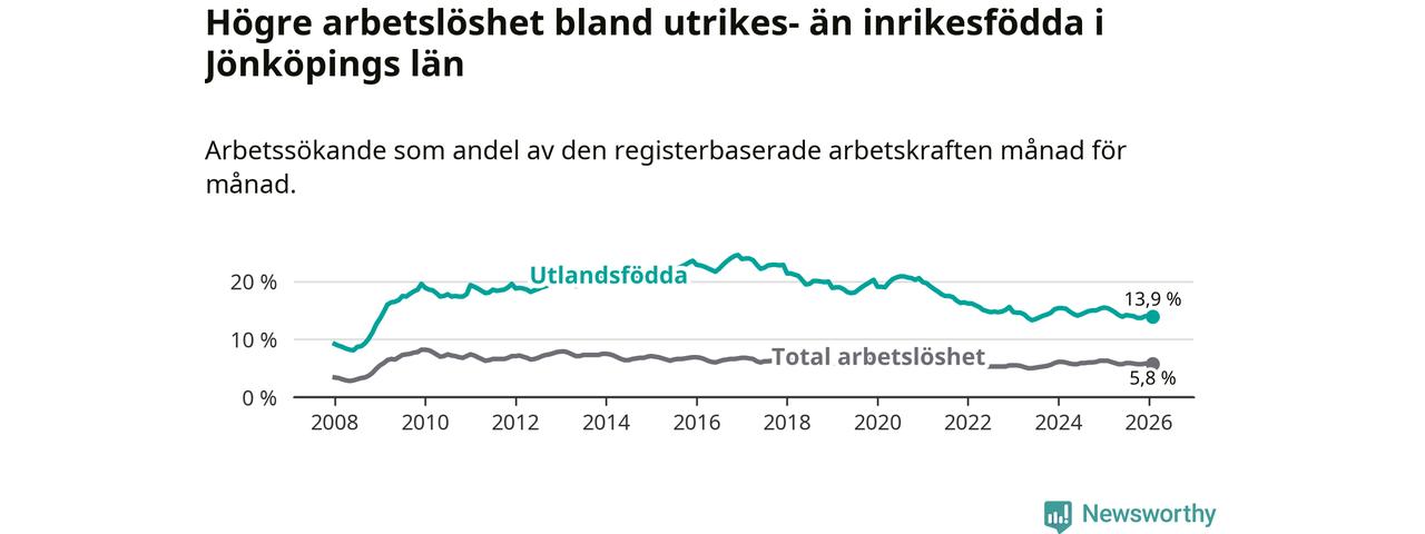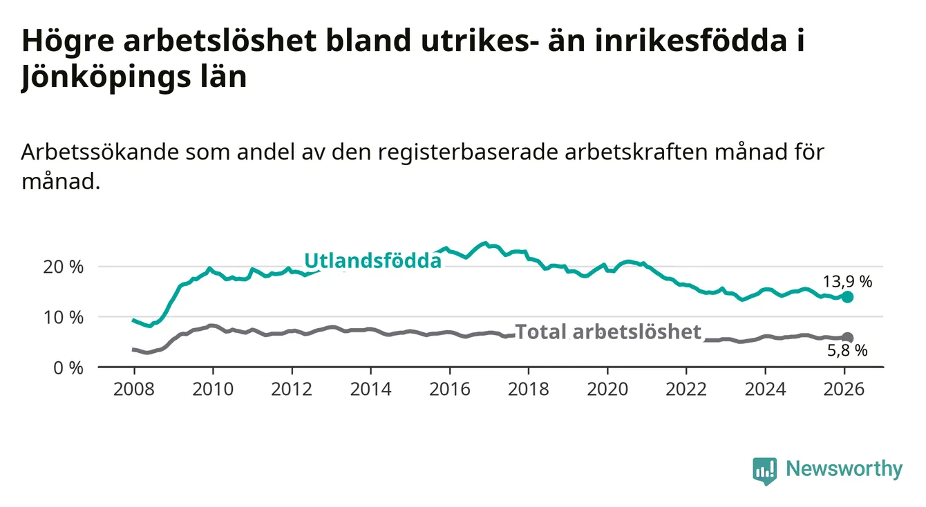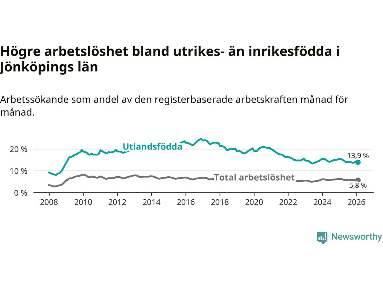 Arbetslösheten bland utlandsfödda var 13,9 procent i Jönköping under februari månad, motsvarande 6 127 av 44 079 personer. Det är 1,5 procentenheter färre än vid samma tidpunkt i fjol (−612 om man räknar personer). Därmed är de utlandsföddas arbetslöshet lägre än vid samma tidpunkt i fjol för tolfte månaden i följd. Sedan februari 2025 har arbetslösheten bland utlandsfödda minskat från 15,4 till 13,9 procent.