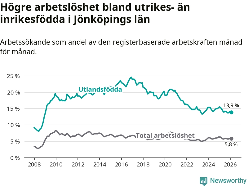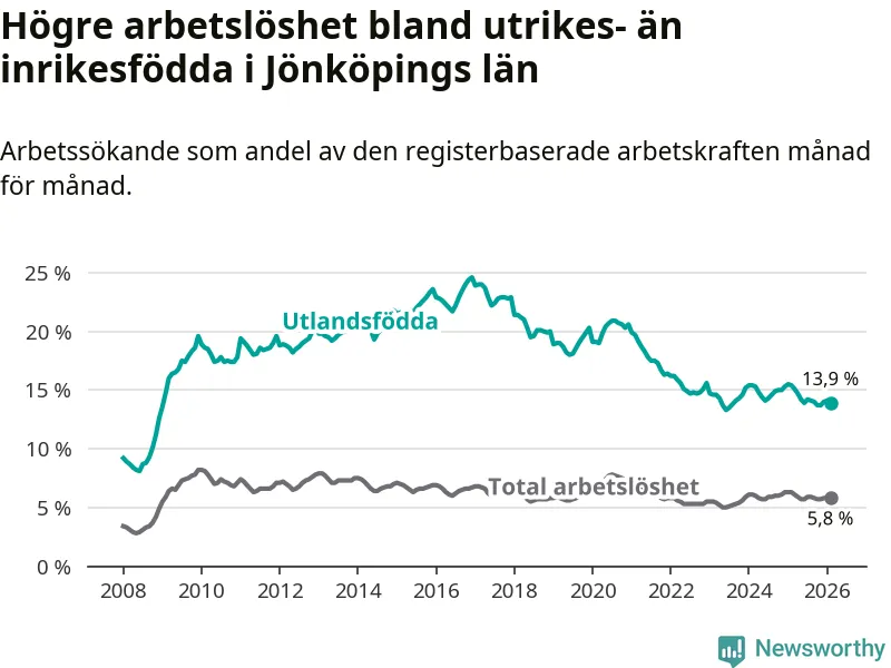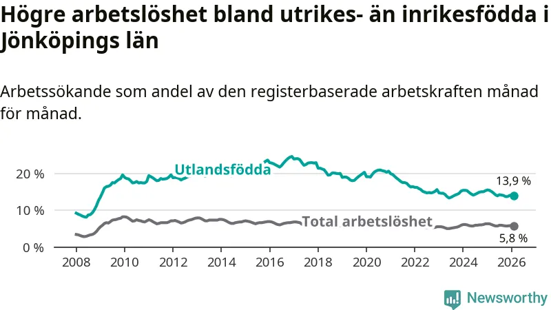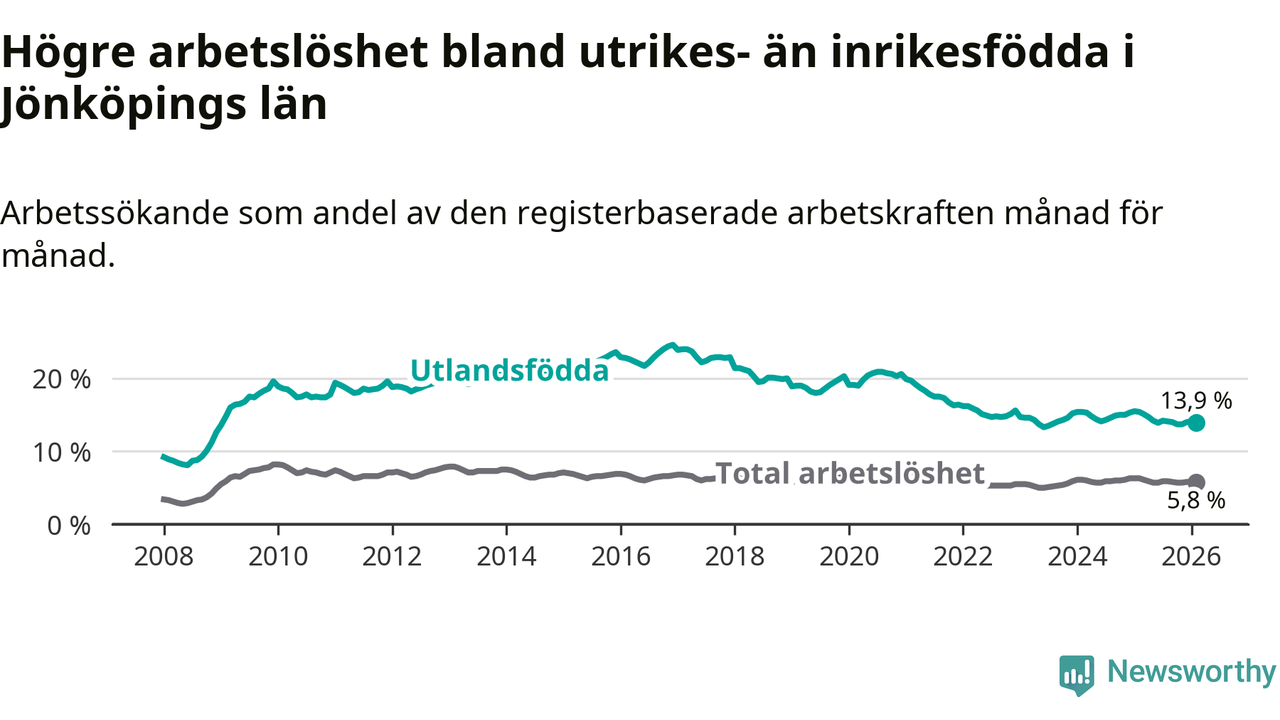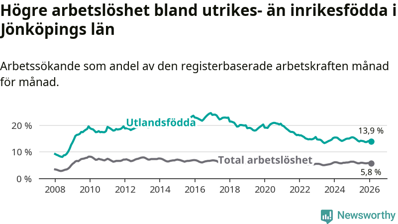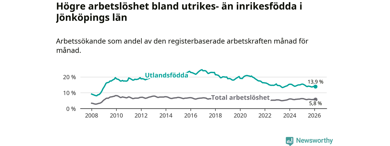 Arbetslösheten bland utlandsfödda var 13,9 procent i Jönköping under februari månad, motsvarande 6 127 av 44 079 personer. Det är 1,5 procentenheter färre än vid samma tidpunkt i fjol (−612 om man räknar personer). Därmed är de utlandsföddas arbetslöshet lägre än vid samma tidpunkt i fjol för tolfte månaden i följd. Sedan februari 2025 har arbetslösheten bland utlandsfödda minskat från 15,4 till 13,9 procent.