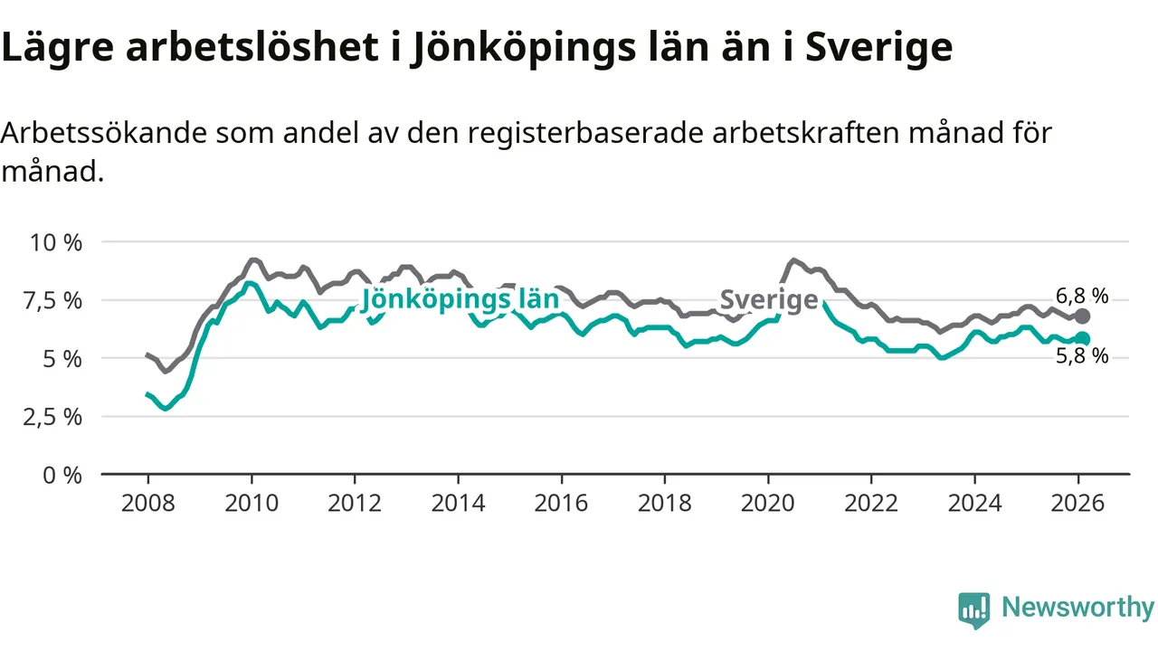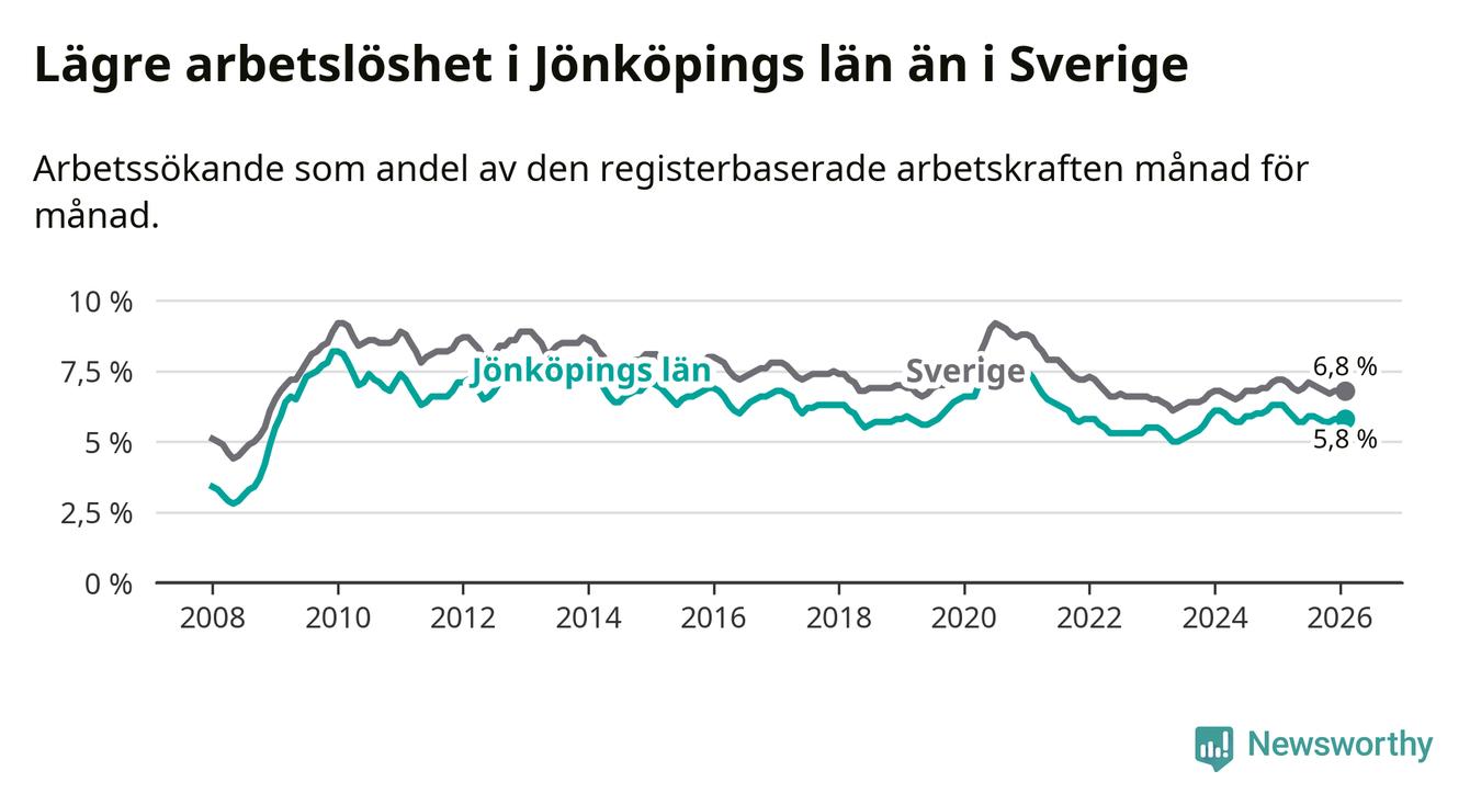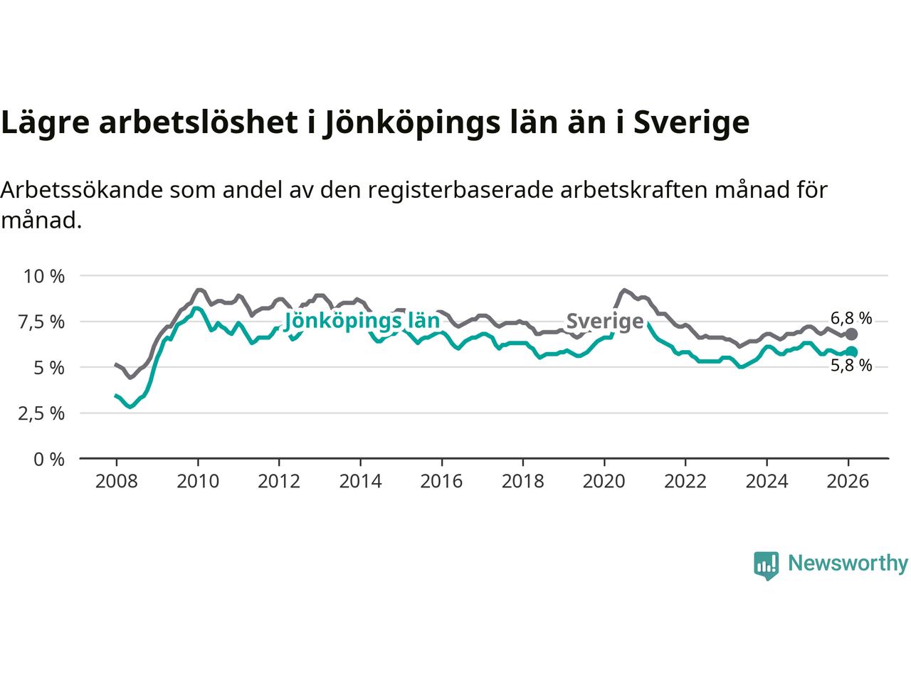 Under februari månad rapporterade Jönköpings län en total arbetslöshet på 5,8 procent. Det är en minskning jämfört med samma tidpunkt i fjol (−0,5 procentenheter). Även i Sverige sjunker arbetslösheten .